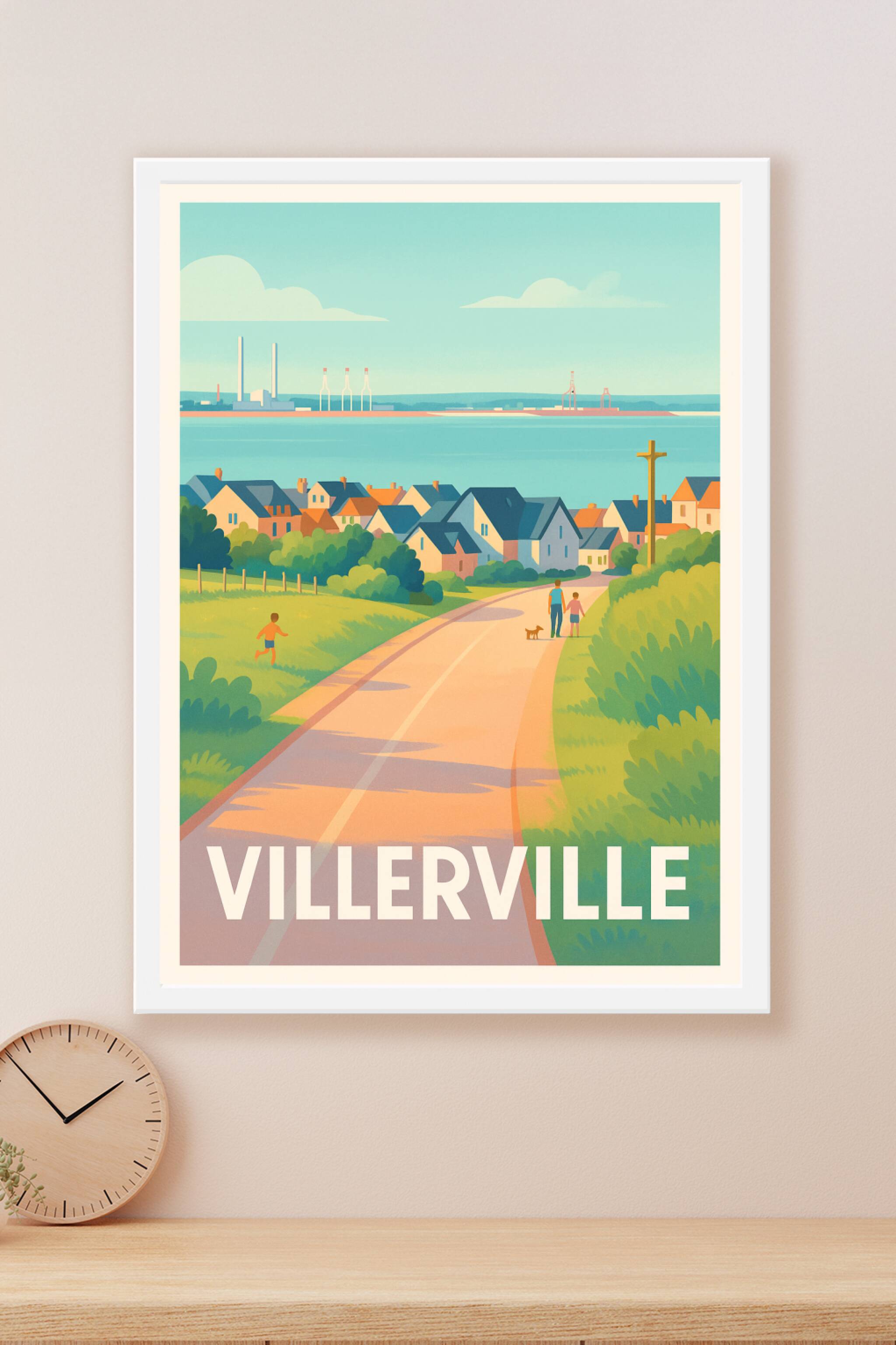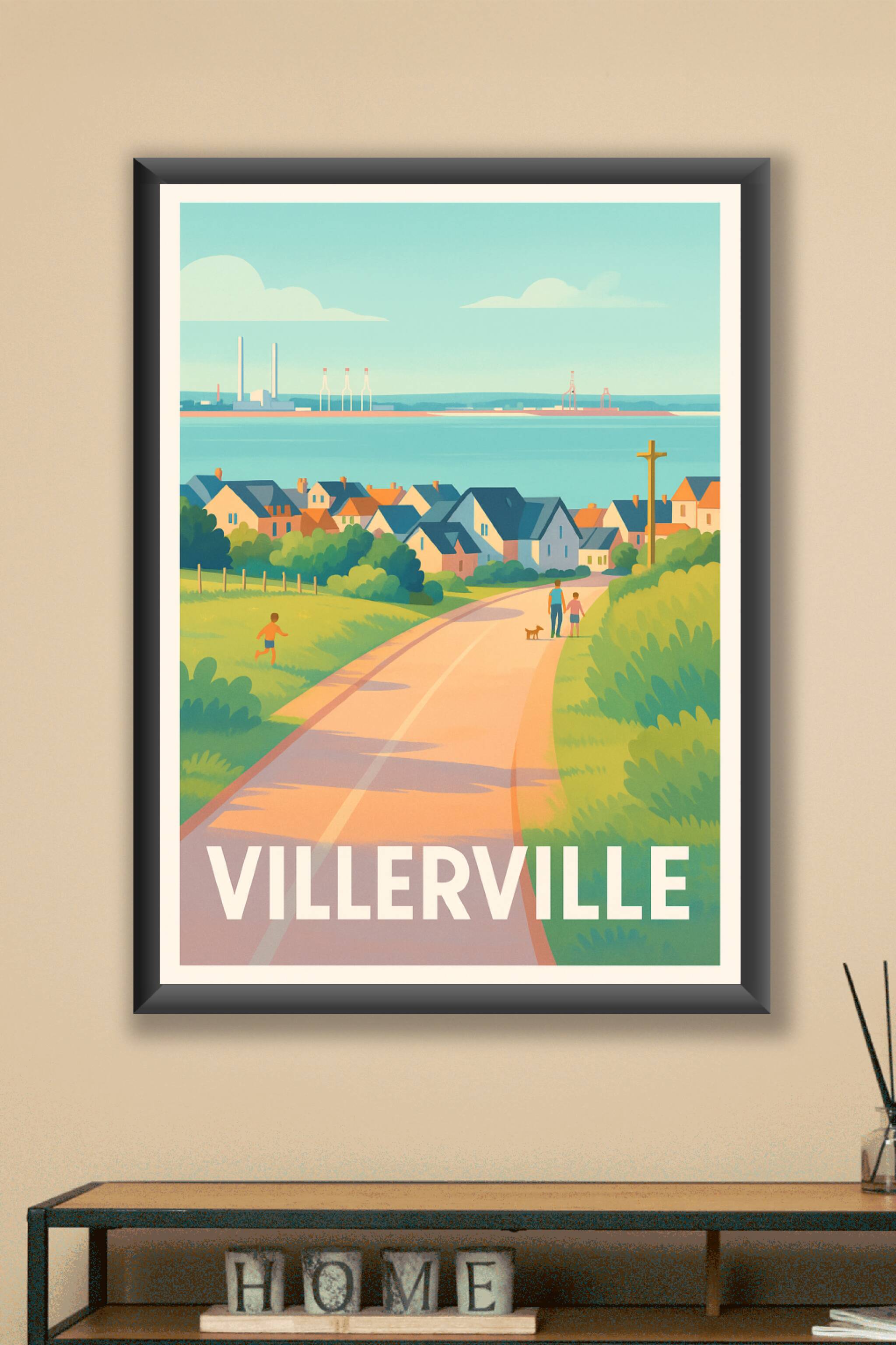 Découvrez l'atmosphère paisible et lumineuse de Villerville avec cette affiche illustrée au style vintage et coloré. Représentant une route menant ...