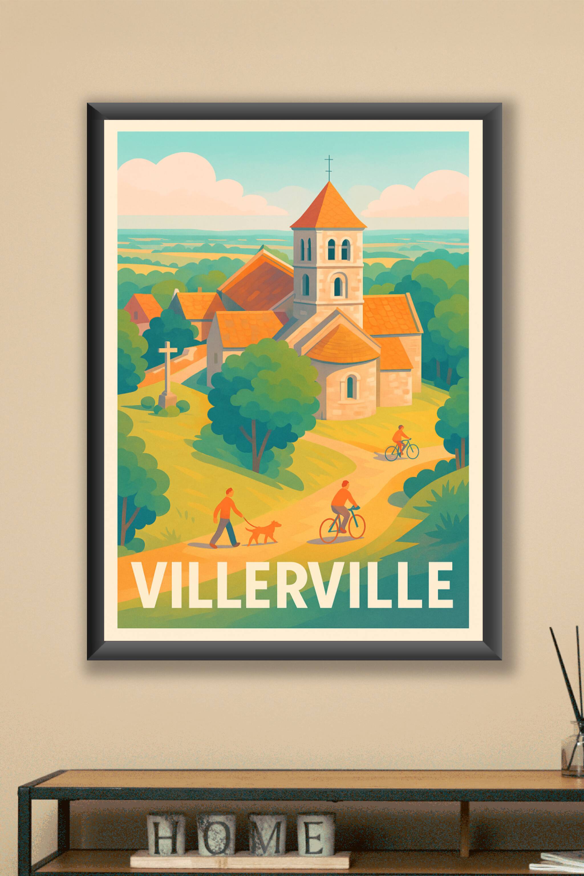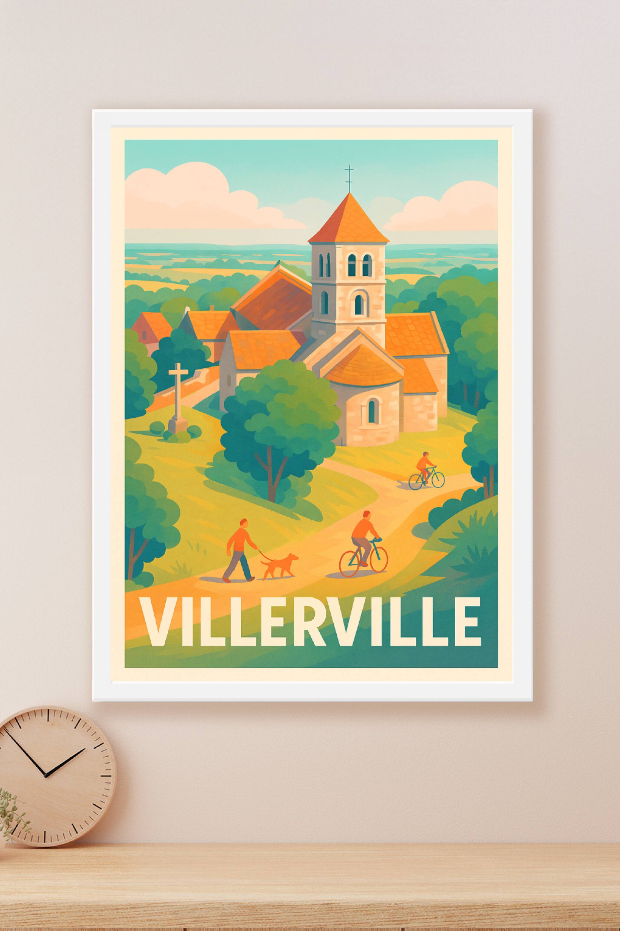 Découvrez l'affiche Villerville, une invitation à la tranquillité et à la beauté rurale normande, capturée dans un style vintage qui évoque la douceur de vivre. Ce poster illustre un charmant village avec son église au toit orangé, entouré de sentiers paisibles où promeneurs et cyclistes se croisent dans un décor bucolique.Pour sublimer votre intérieur ou offrir un souvenir unique, cette affiche est imprimée en tirage "Fine Art" sur un papier 305g coton garantissant une qualité d'impression exceptionnelle et une grande longévité. Disponible en formats A1 à A4, avec ou sans cadre, elle s'adapte parfaitement à tous les espaces et styles de décoration. Profitez d'une production 100% française pour embellir votre chez-vous avec cette scène emblématique de Villerville.