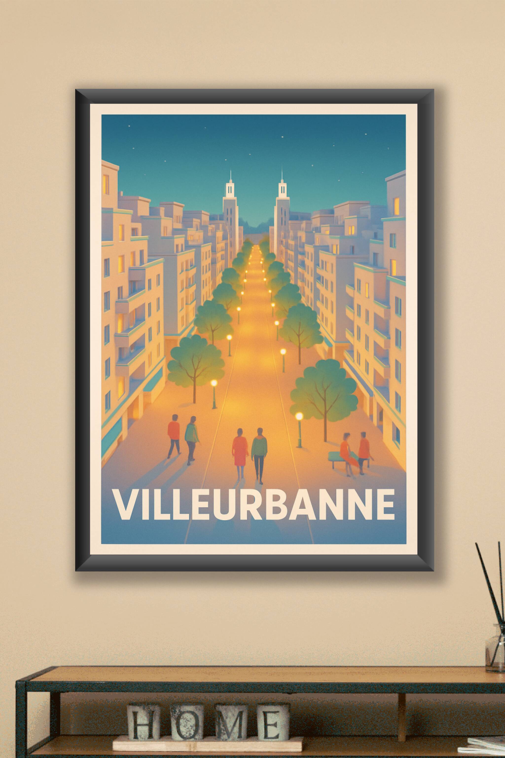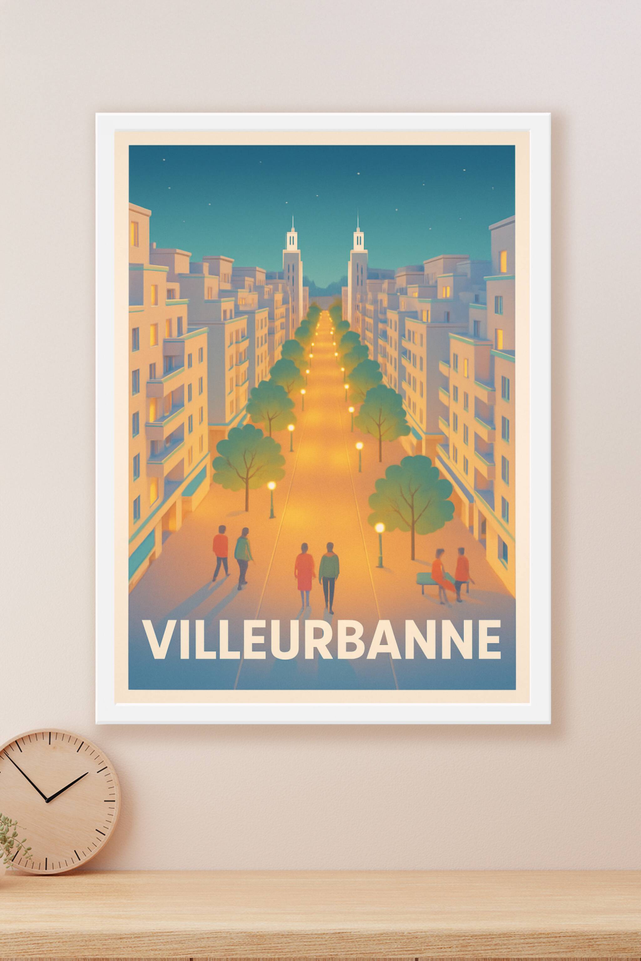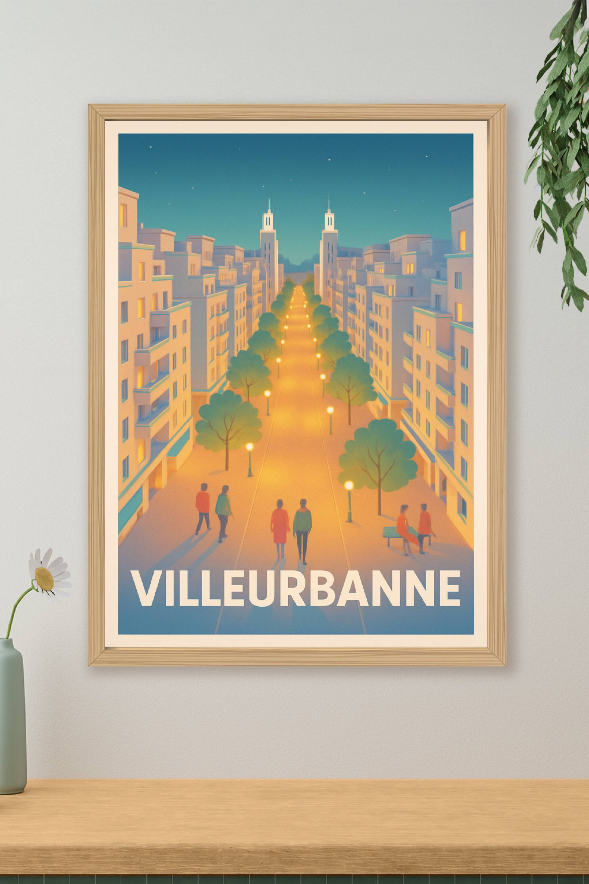 Découvrez l'atmosphère apaisante et nocturne de Villeurbanne avec cette affiche illustrée représentant une avenue bordée d'arbres et de bâtiments i...