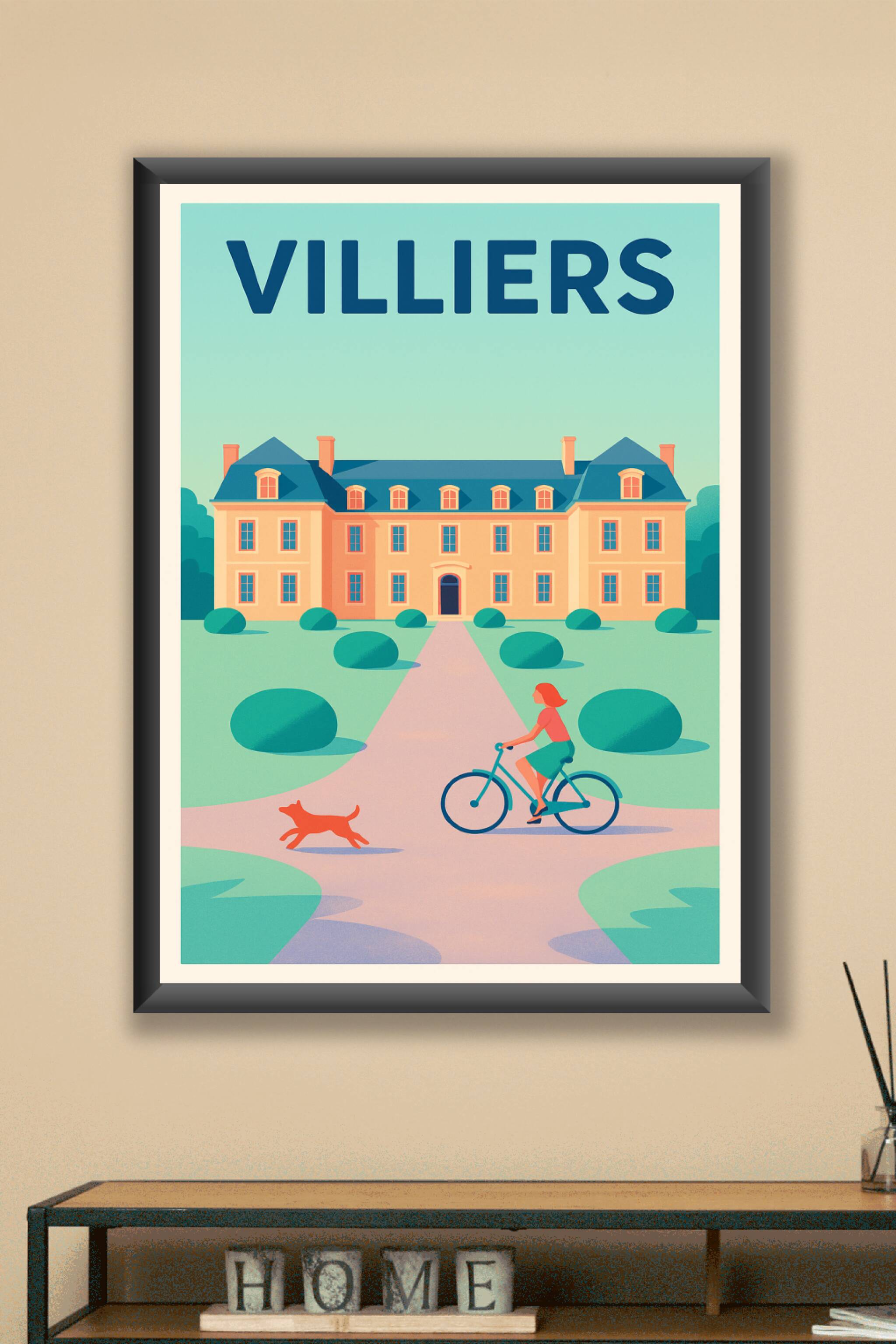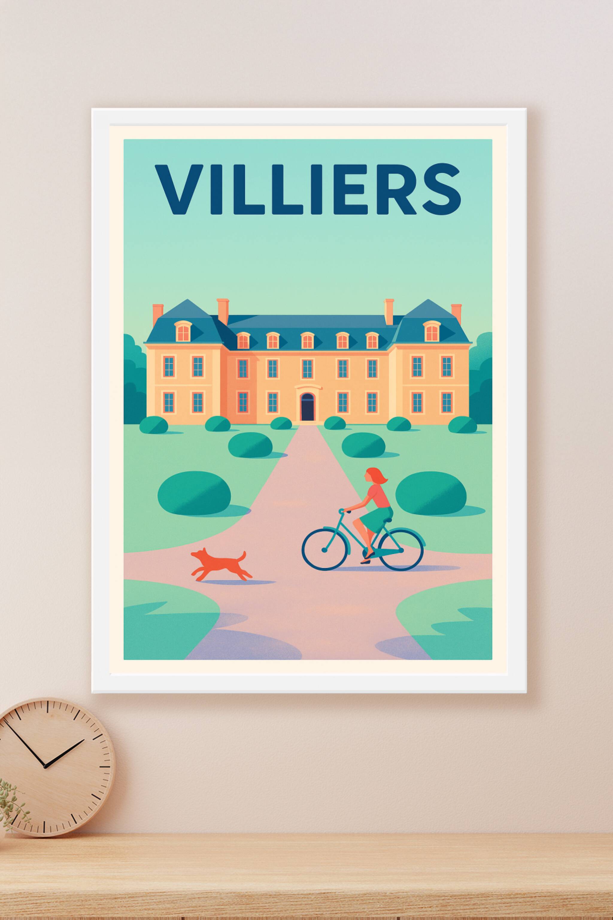 Découvrez l'élégance apaisante de Villiers avec cette affiche illustrée dans un style doux et coloré. Cette poster met en scène une promenade tranq...