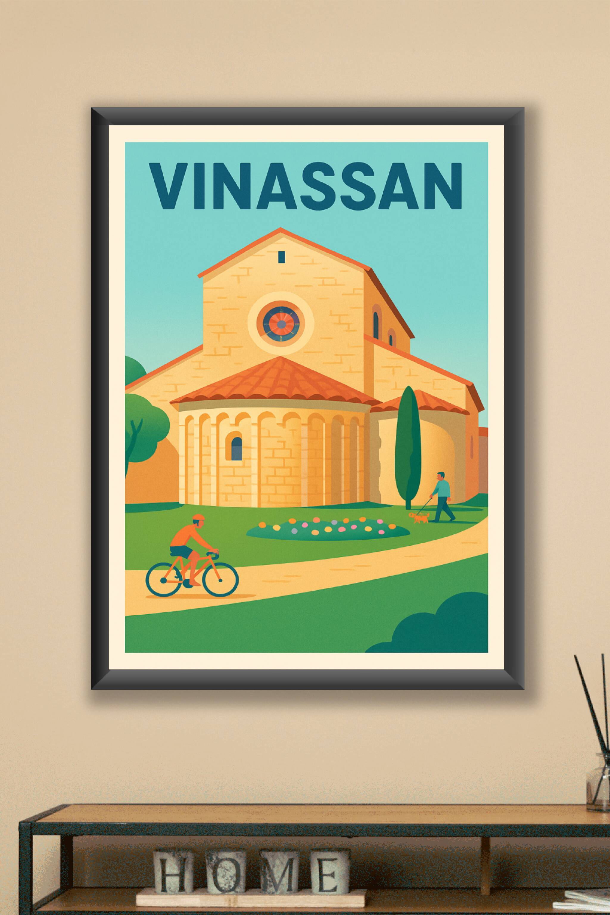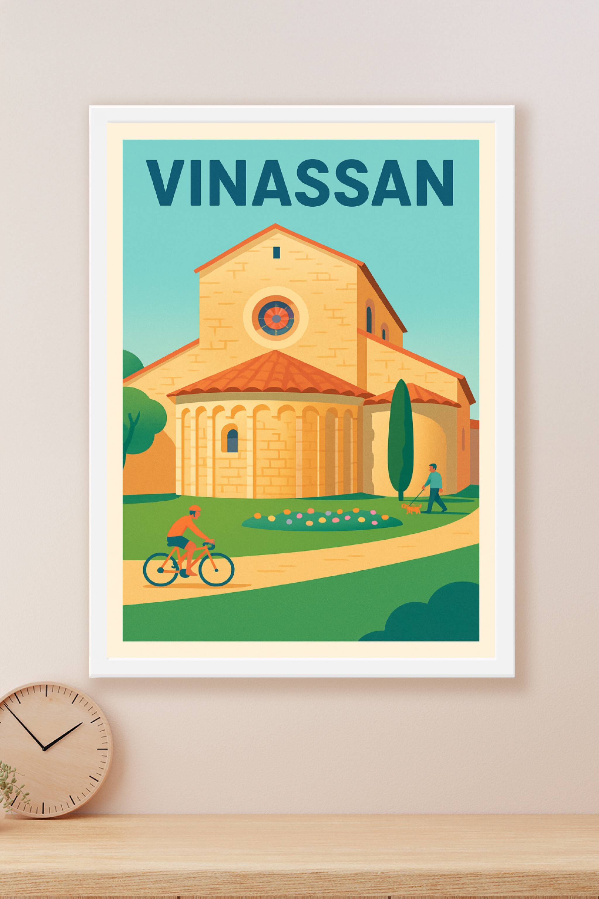Découvrez le charme paisible de Vinassan avec cette affiche au style graphique épuré, mettant en lumière l'architecture remarquable de son église e...