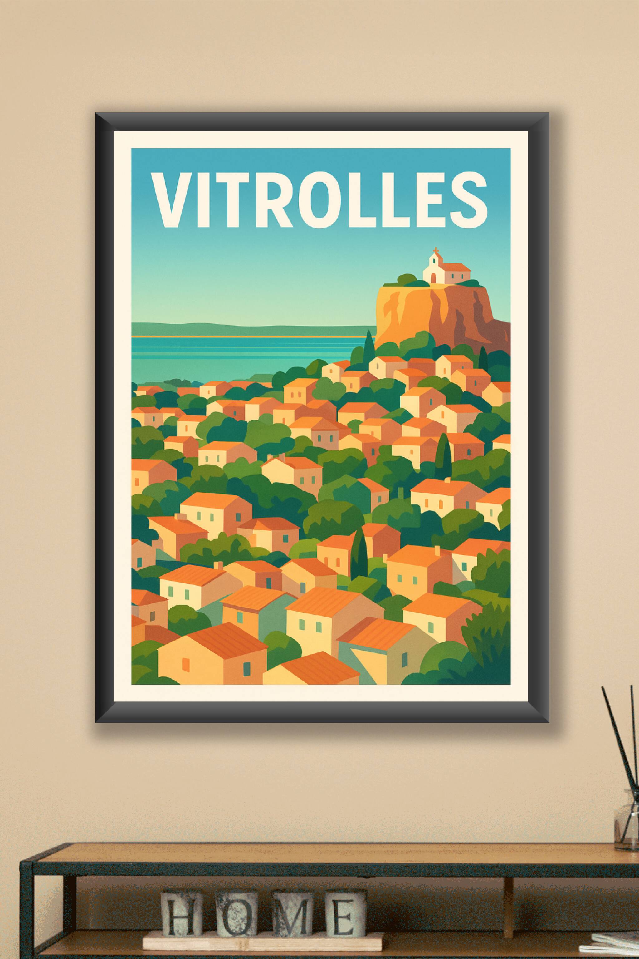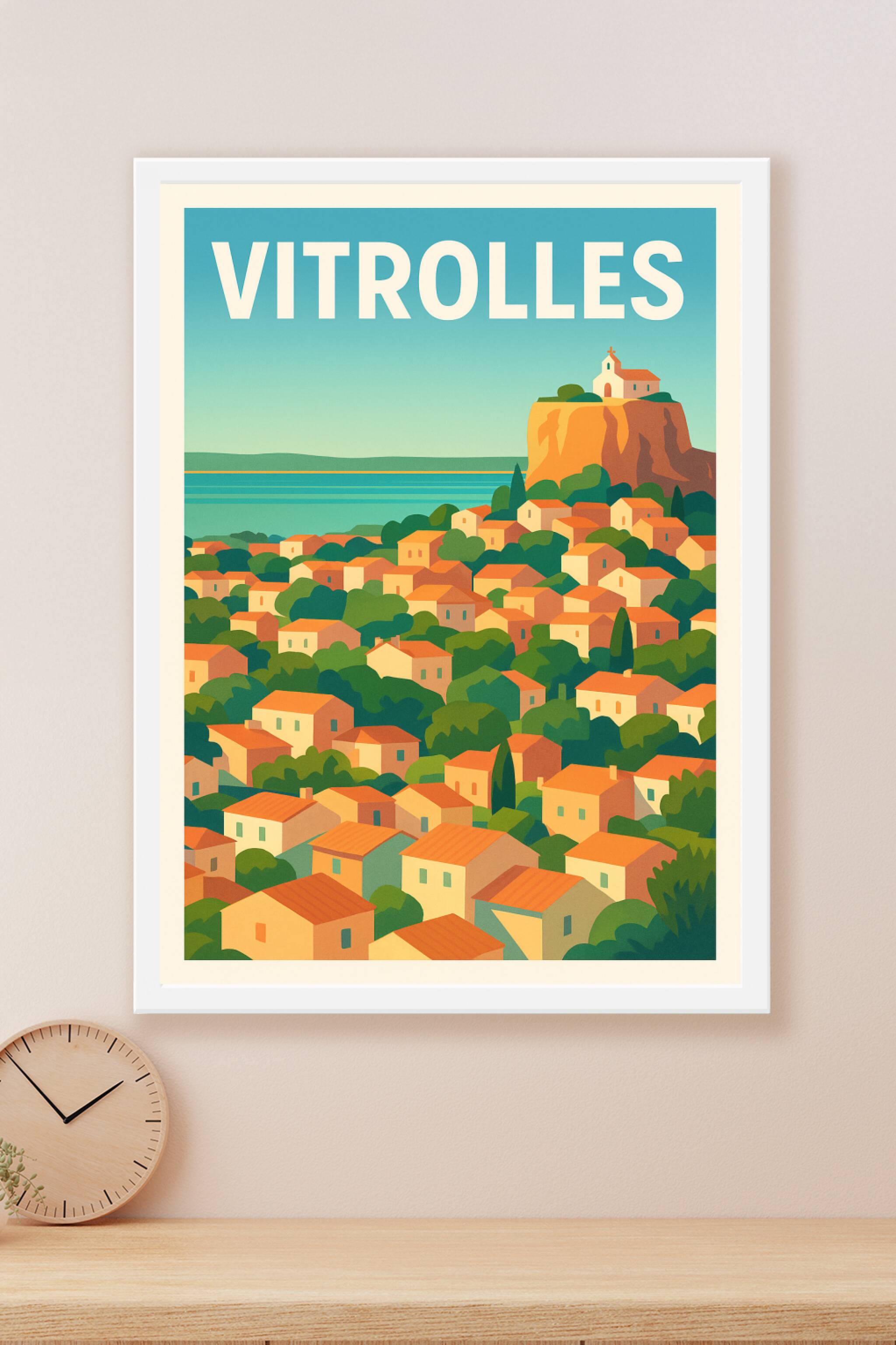 Découvrez l charmante ambiance de Vitrolles à travers cette affiche au style graphique et lumineux, qui met en avant les toits orangés et le paysag...