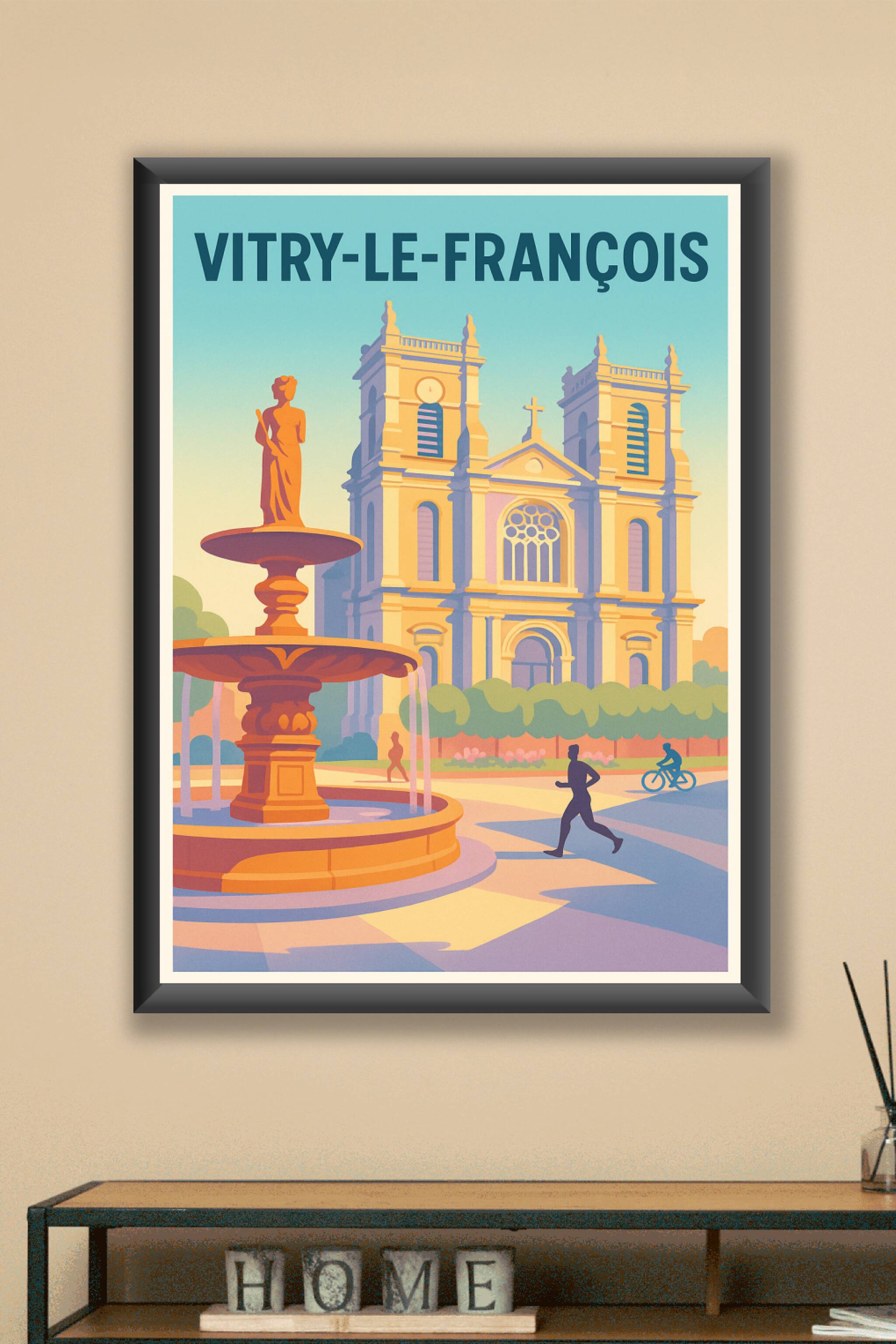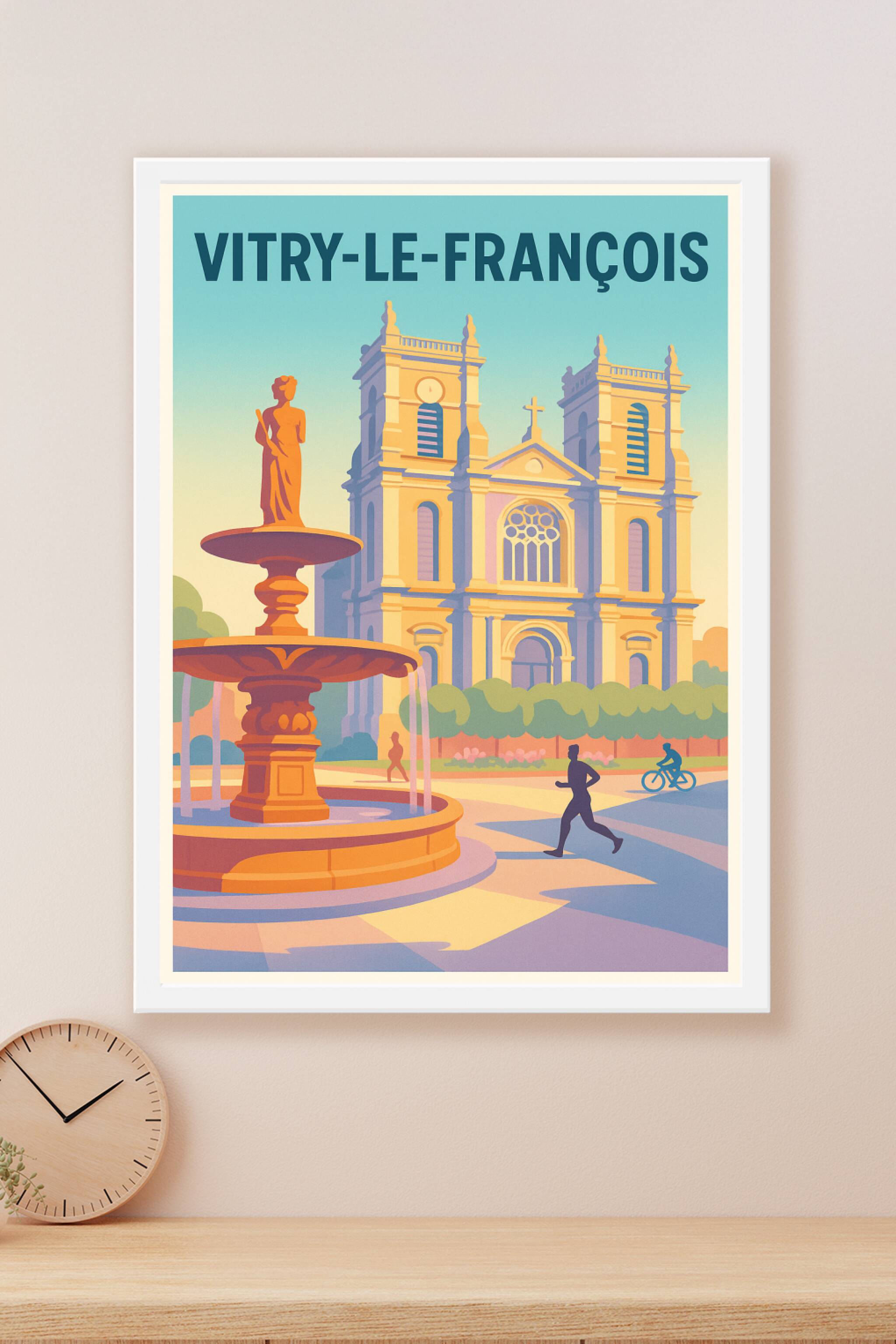 Découvrez la beauté intemporelle de Vitry-le-François à travers cette affiche élégante mettant en scène une fontaine majestueuse et une architectur...