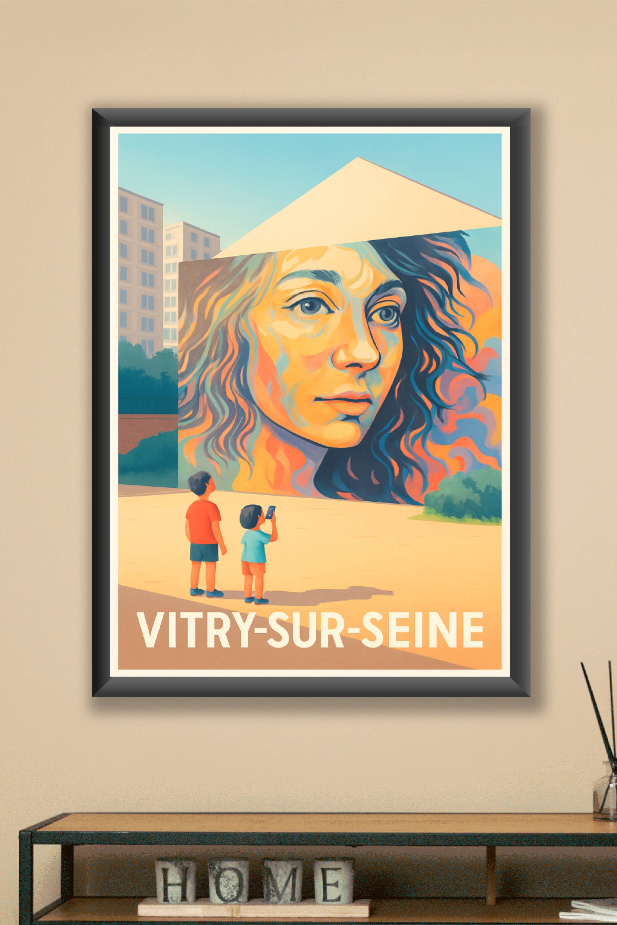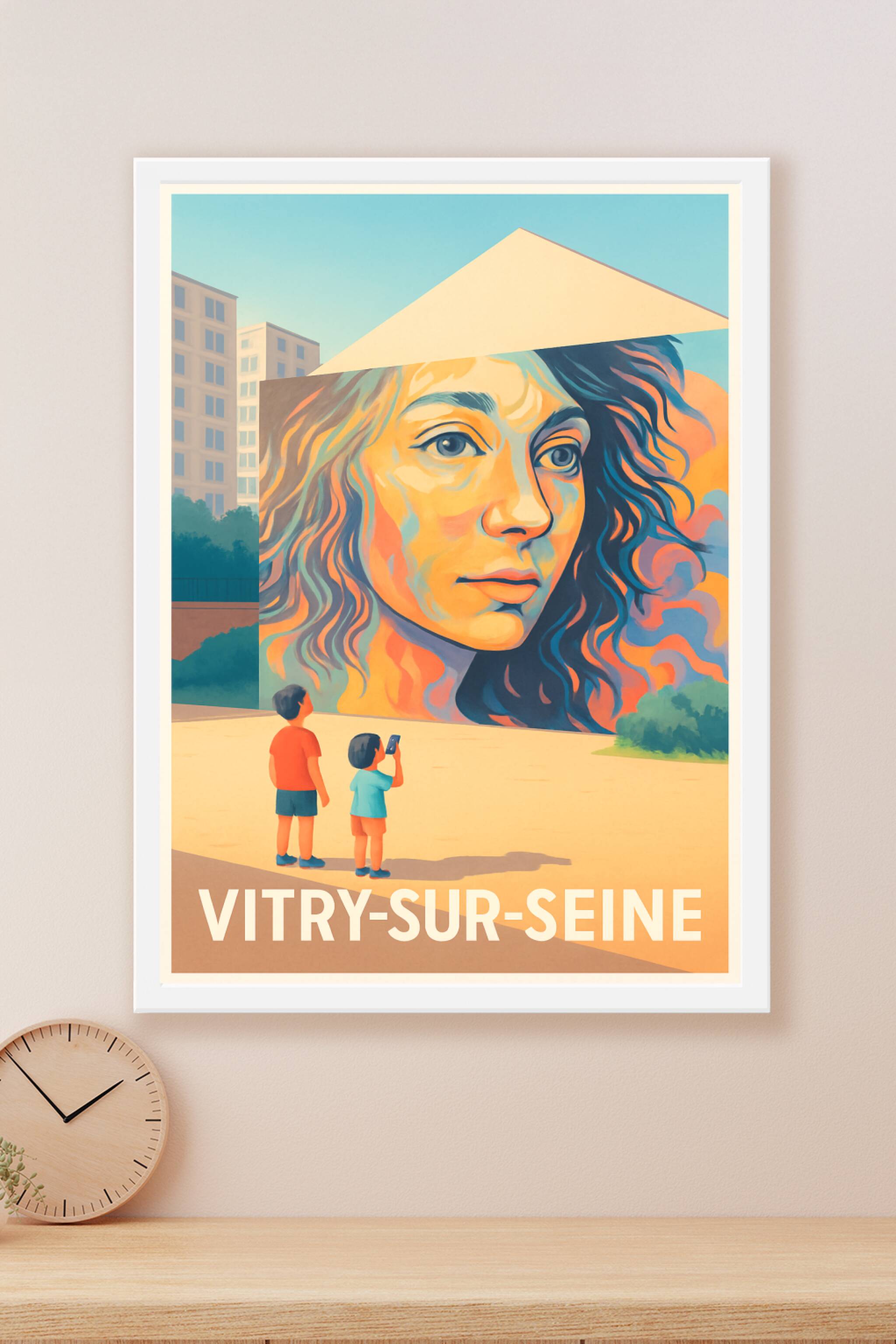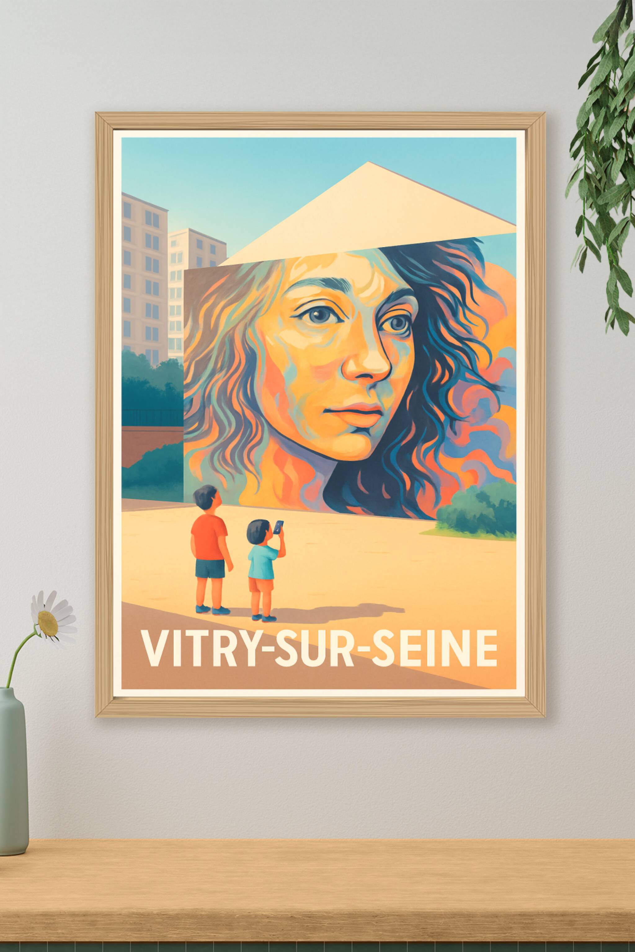 Découvrez l'âme artistique de Vitry-sur-Seine à travers cette affiche originale mettant en scène un gigantesque portrait coloré sur un mur urbain. ...