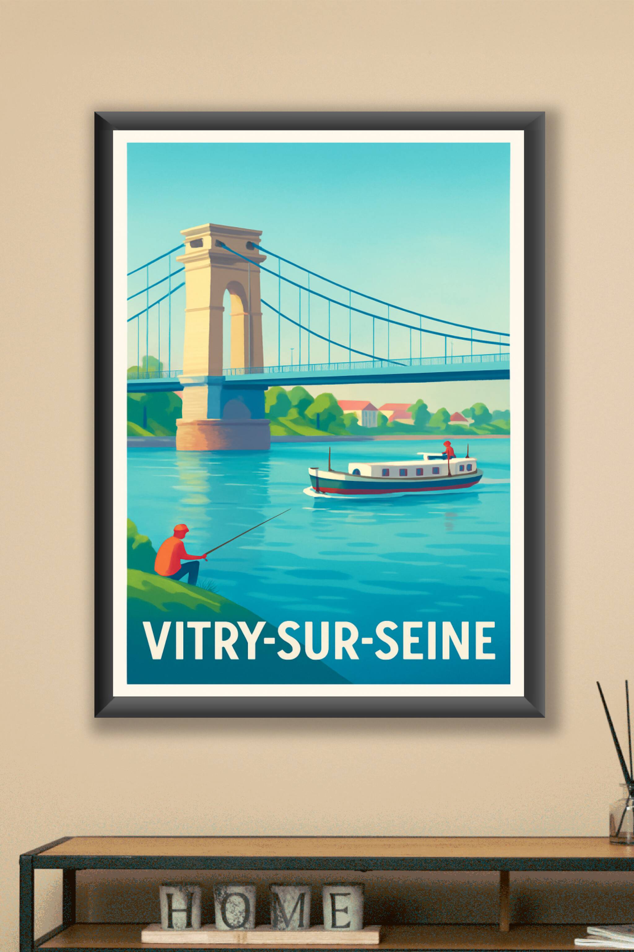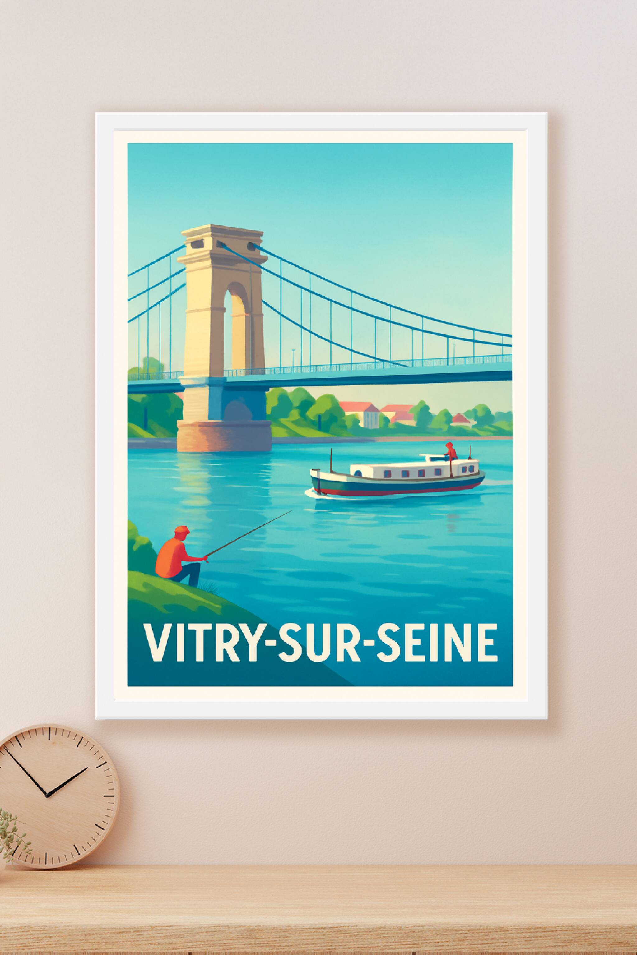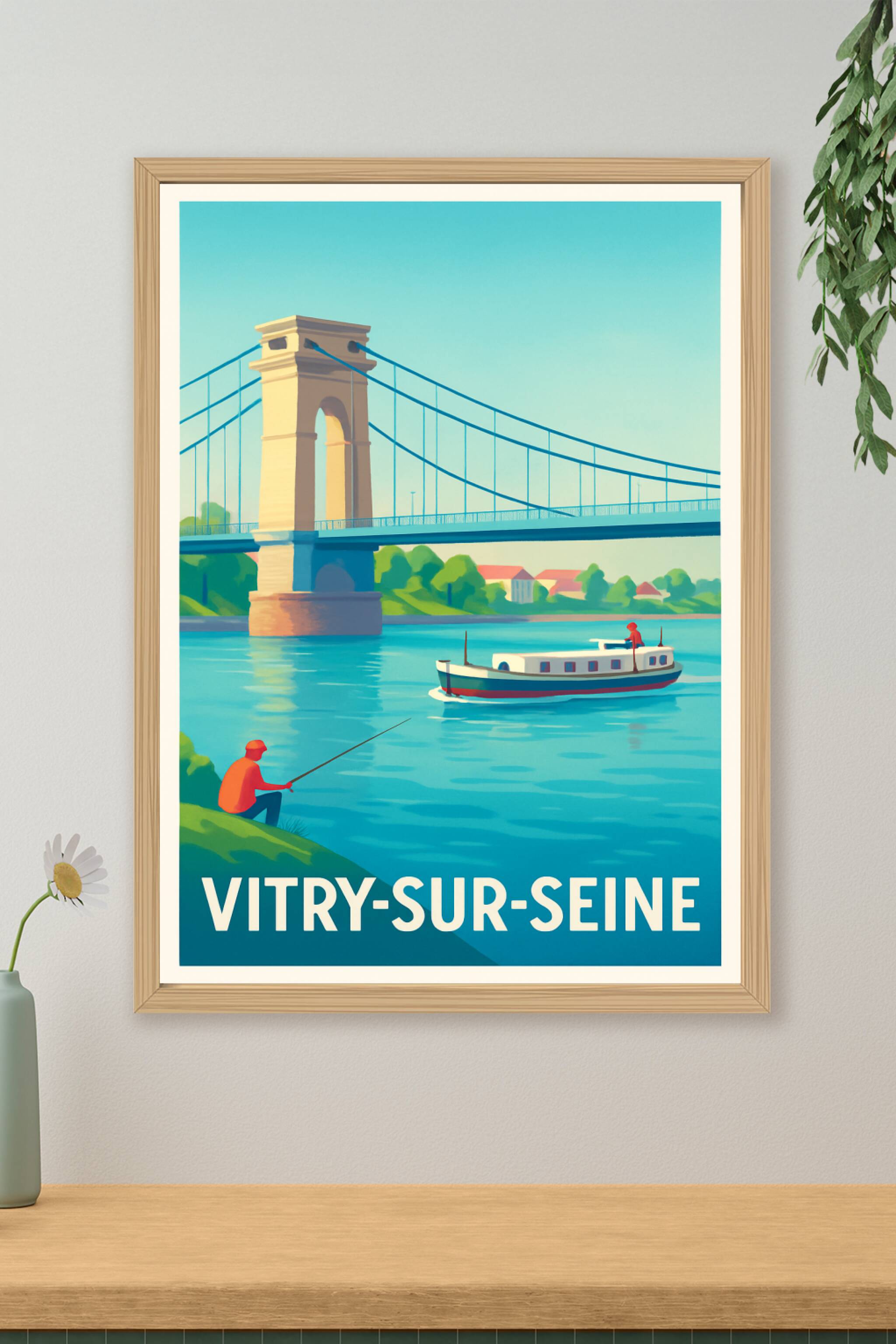Découvrez la sérénité des bords de Seine à Vitry-sur-Seine avec cette affiche au style doux et lumineux. Illustrant un pont suspendu emblématique e...