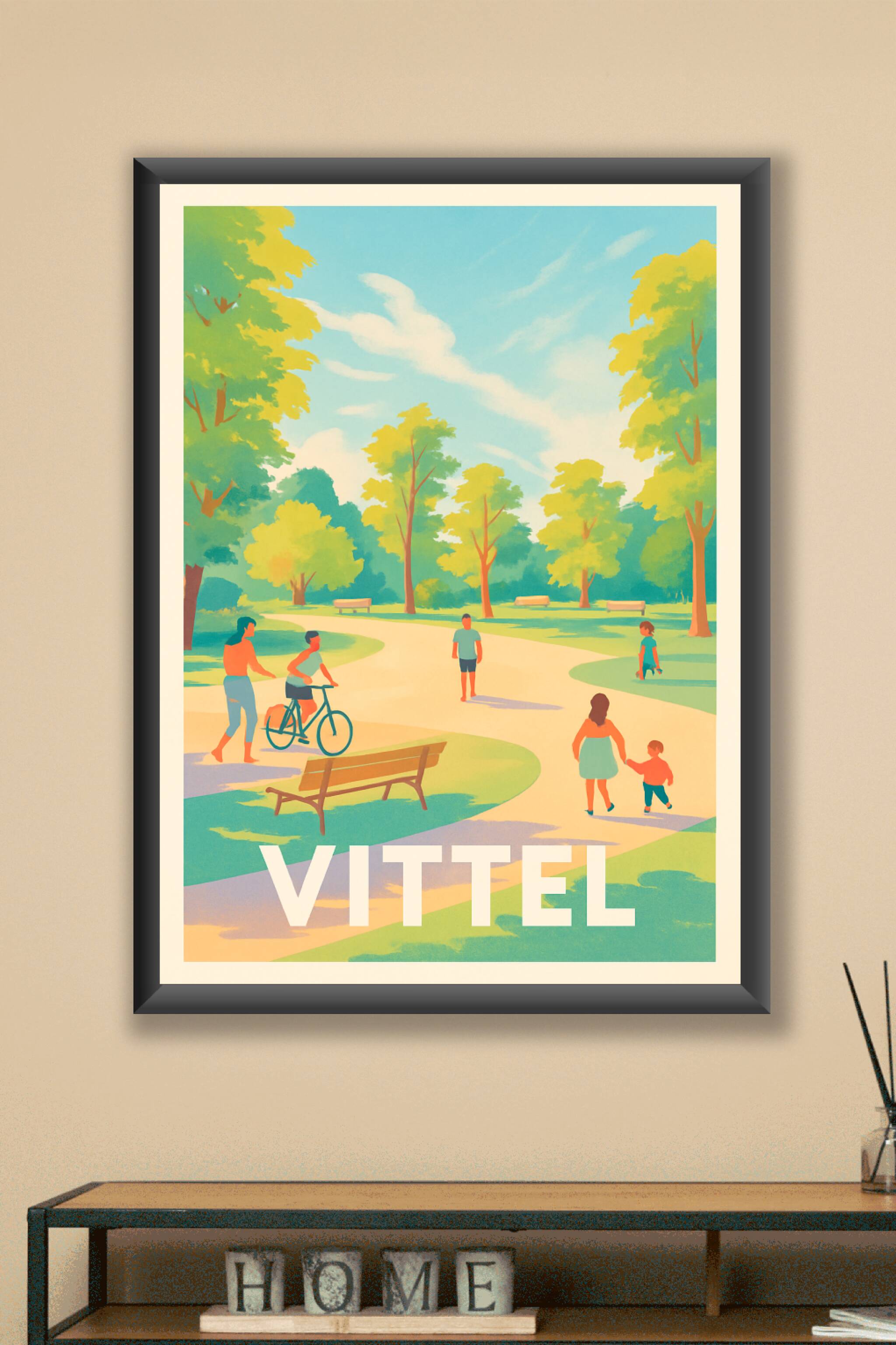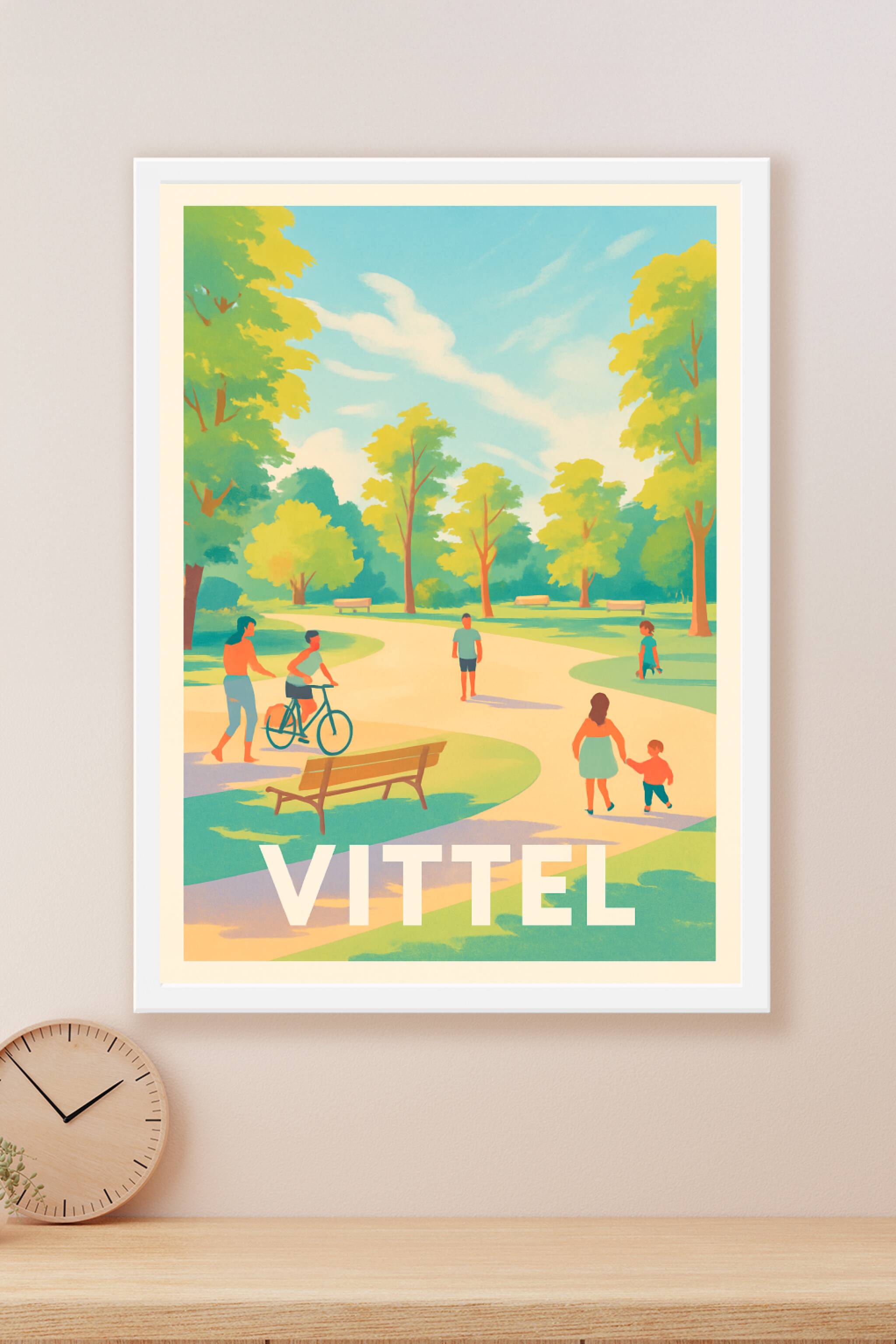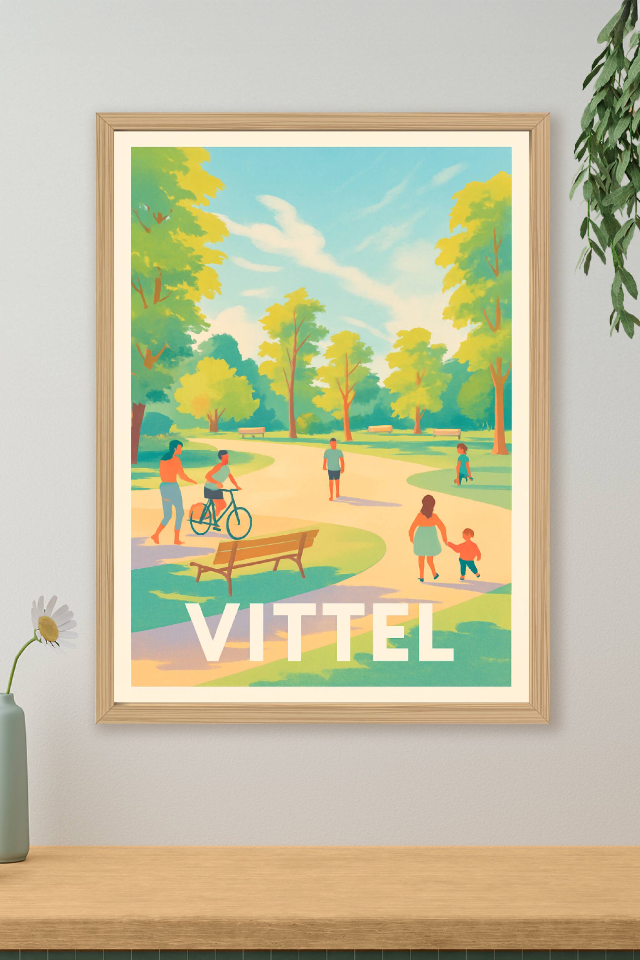 Découvrez ce poster illustré qui célèbre la douceur de vivre à Vittel, entre promenades apaisantes et espaces verts baignés de lumière. Cette affic...