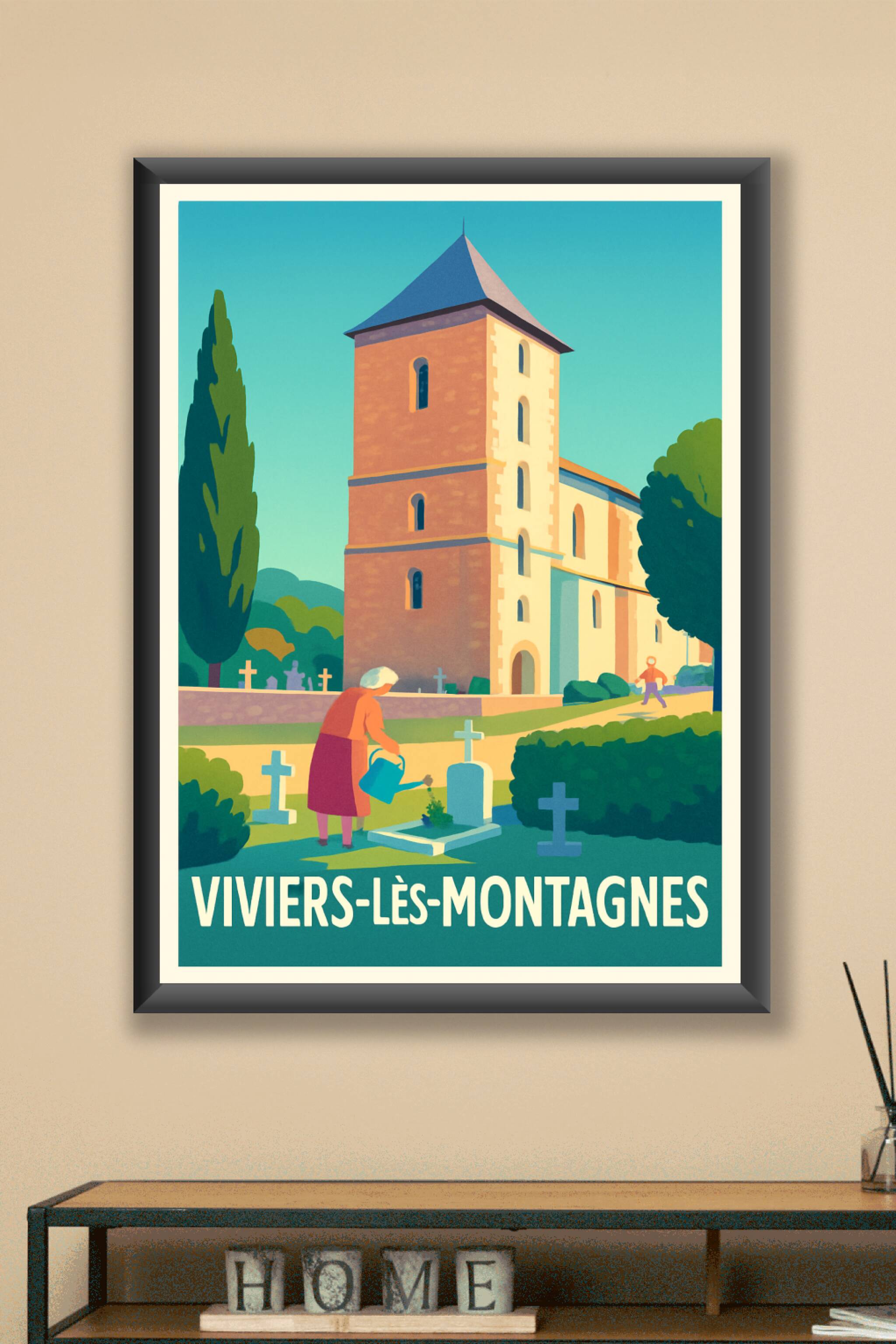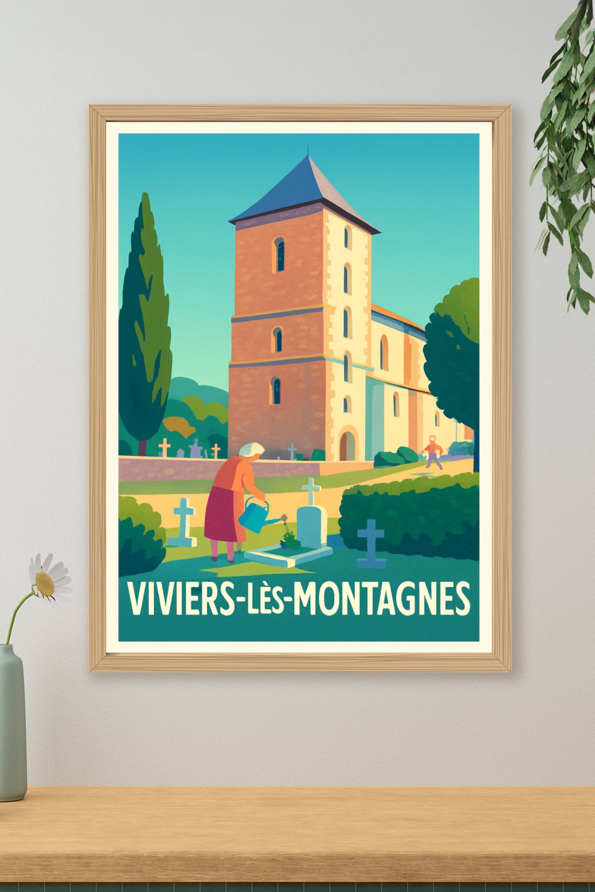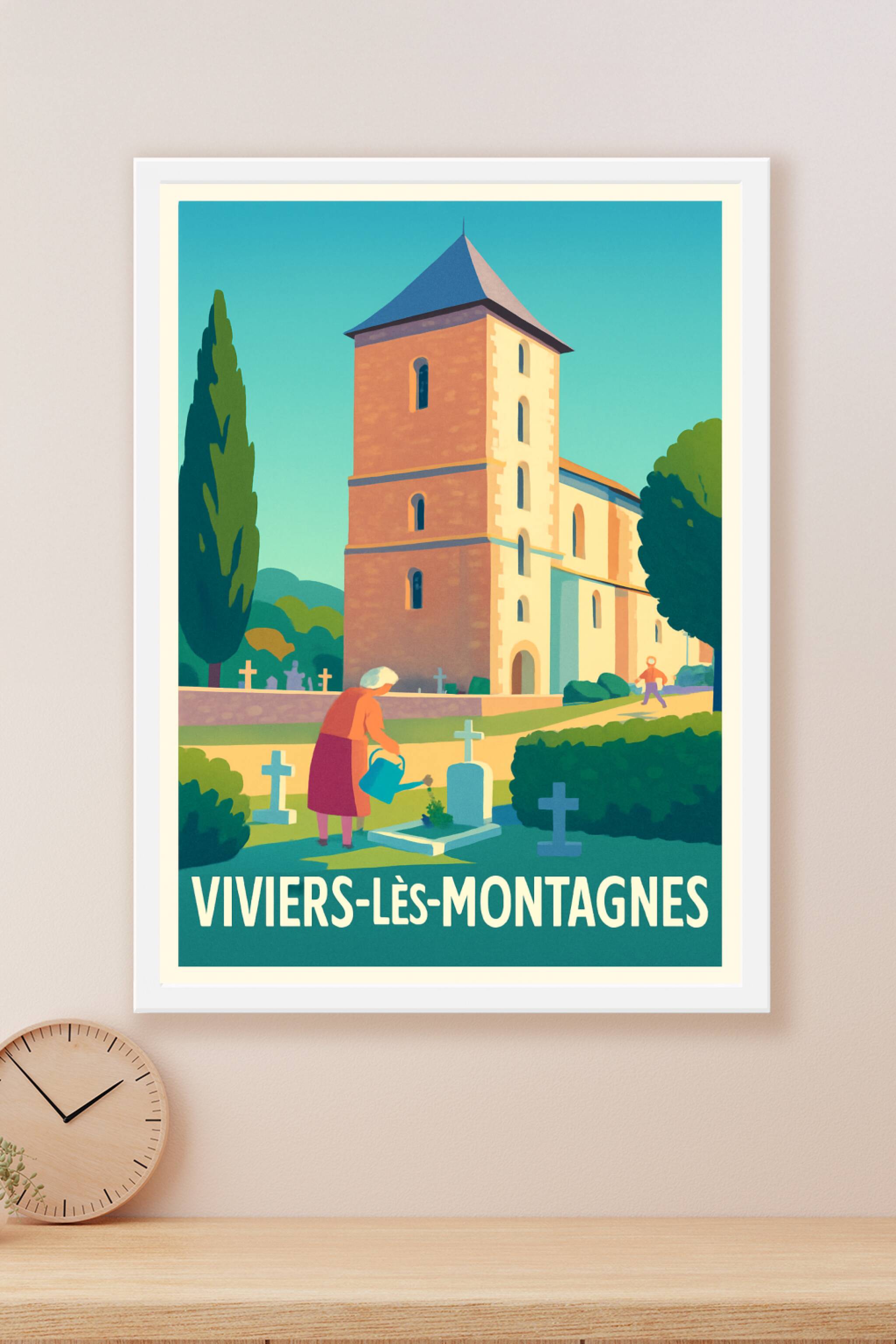 Découvrez l'élégance tranquille de Viviers-lès-Montagnes avec cette affiche illustrée mettant en scène une scène paisible au cœur du village et de ...