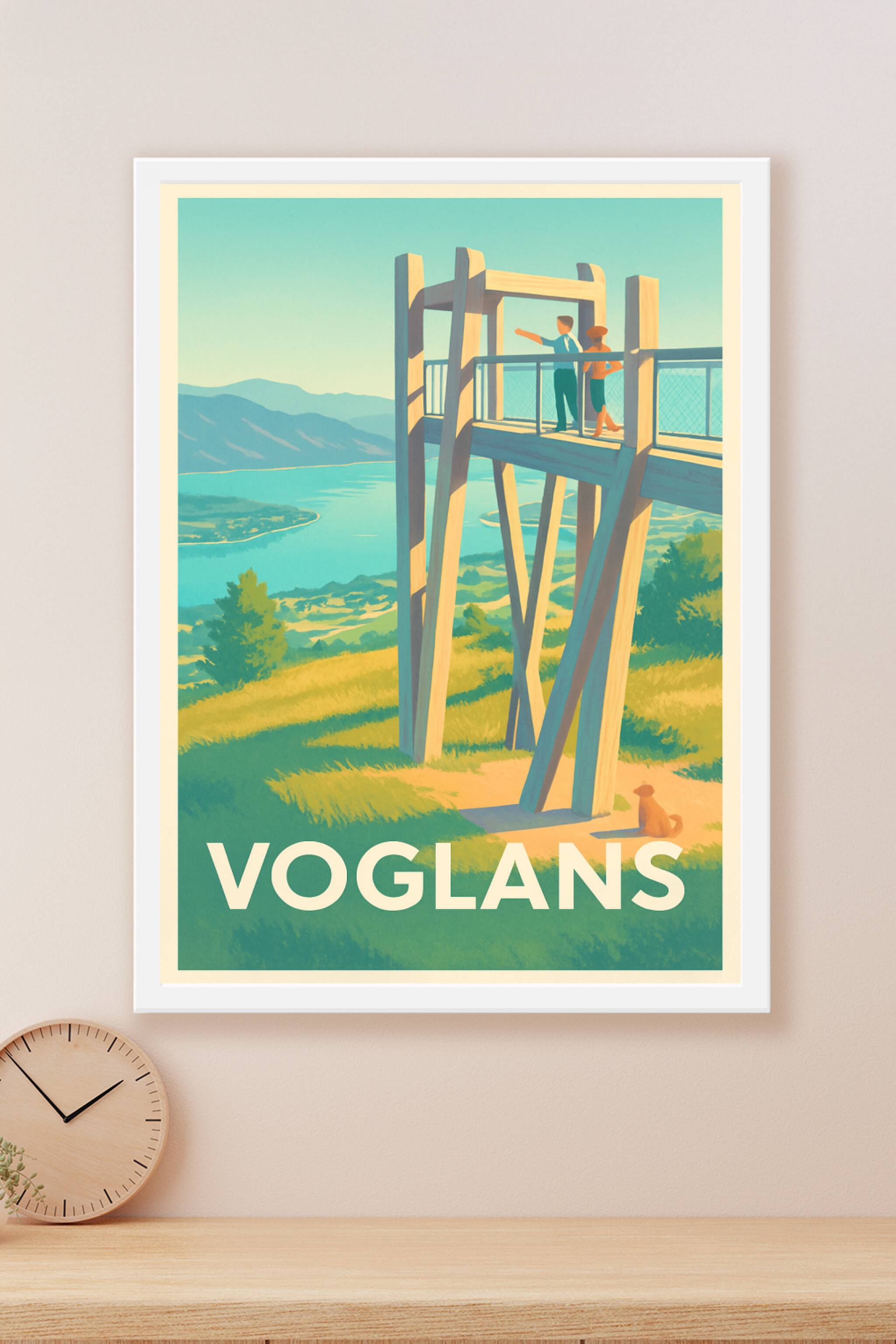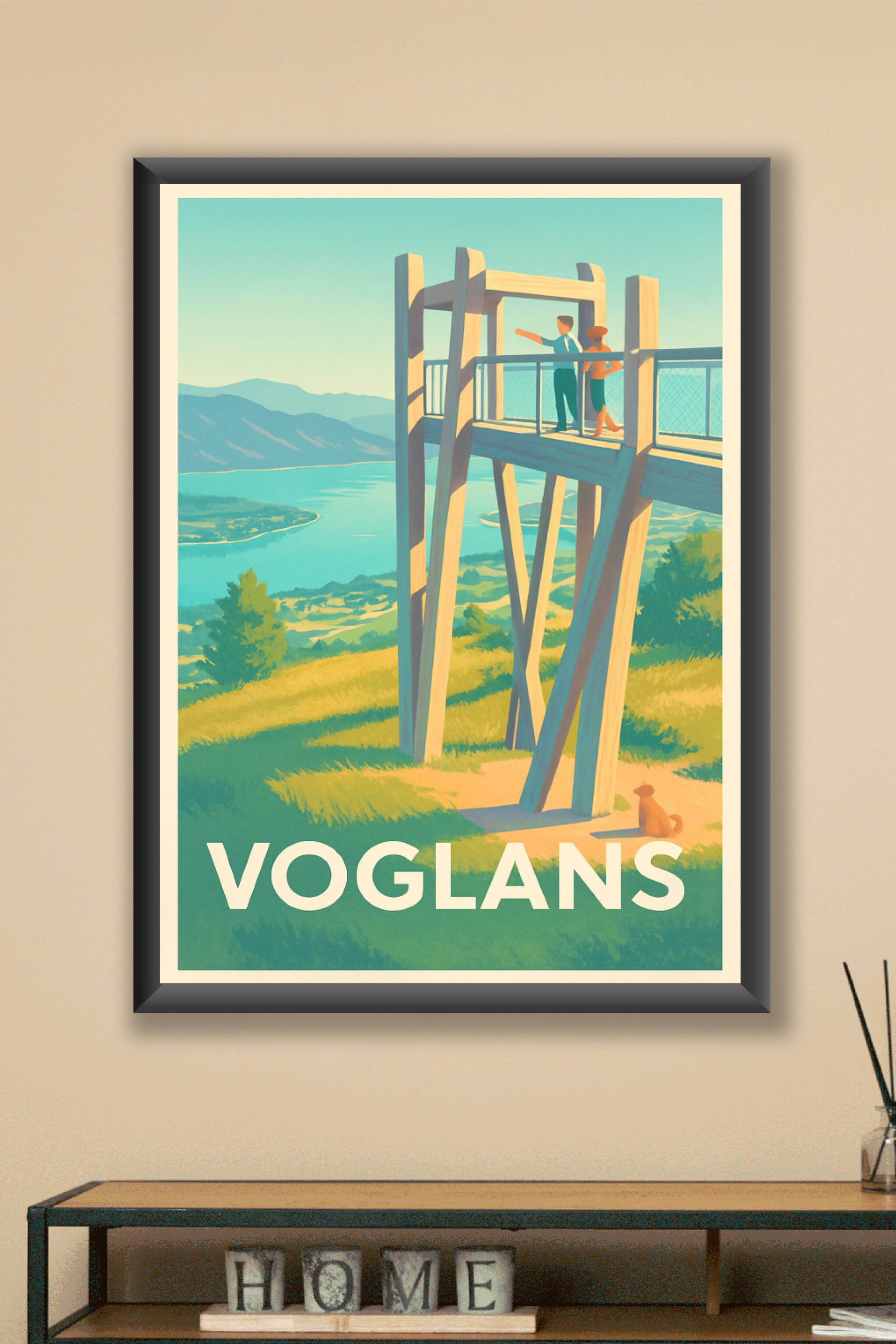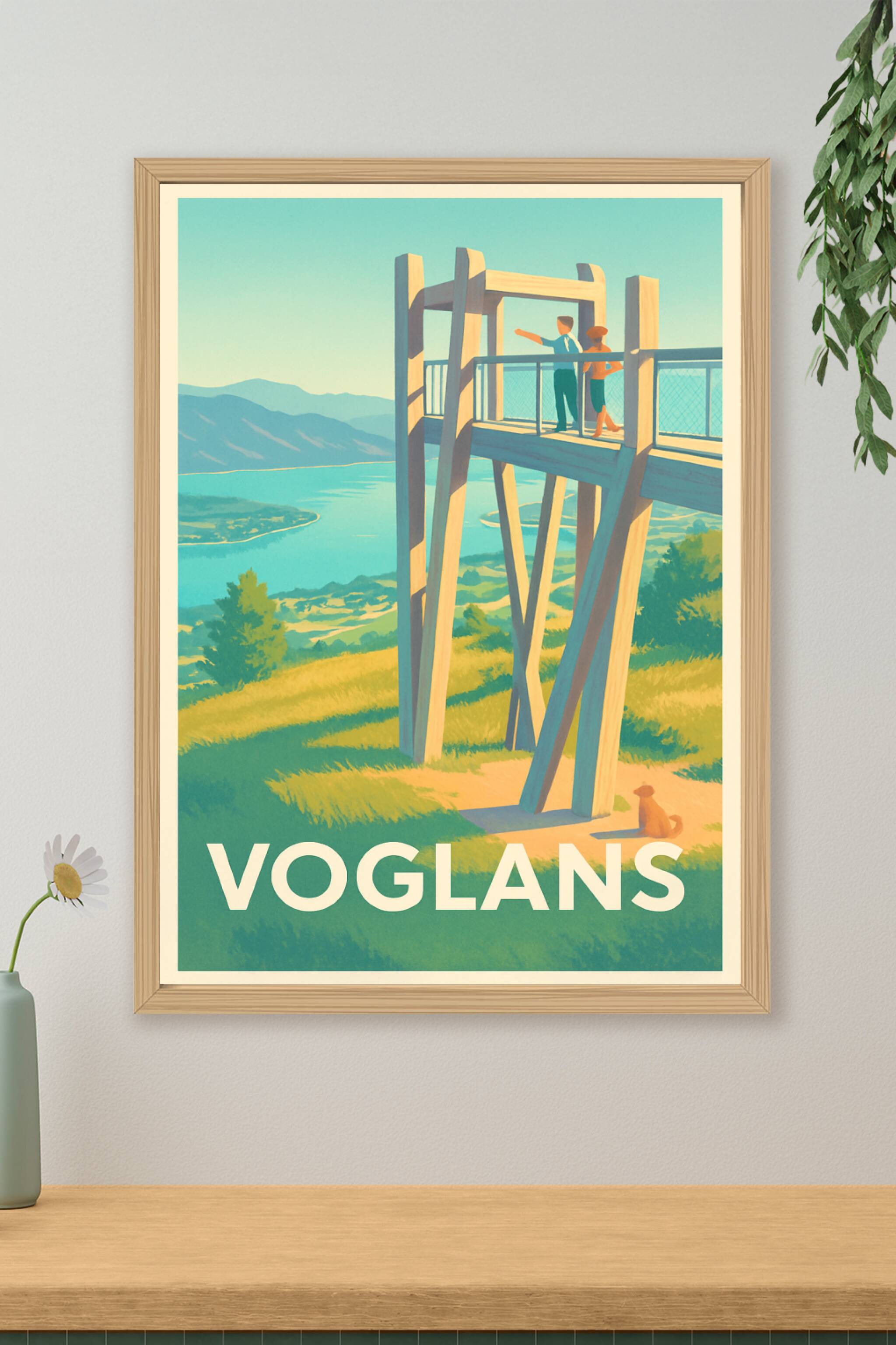 Découvrez la beauté naturelle de Voglans avec cette affiche représentant un belvédère en bois surplombant un paysage enchanteur de lacs et de monta...