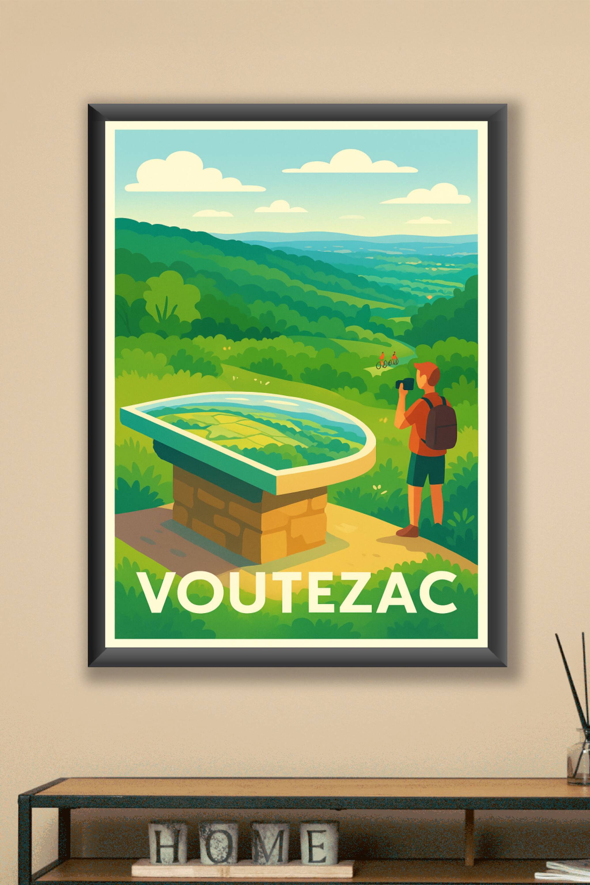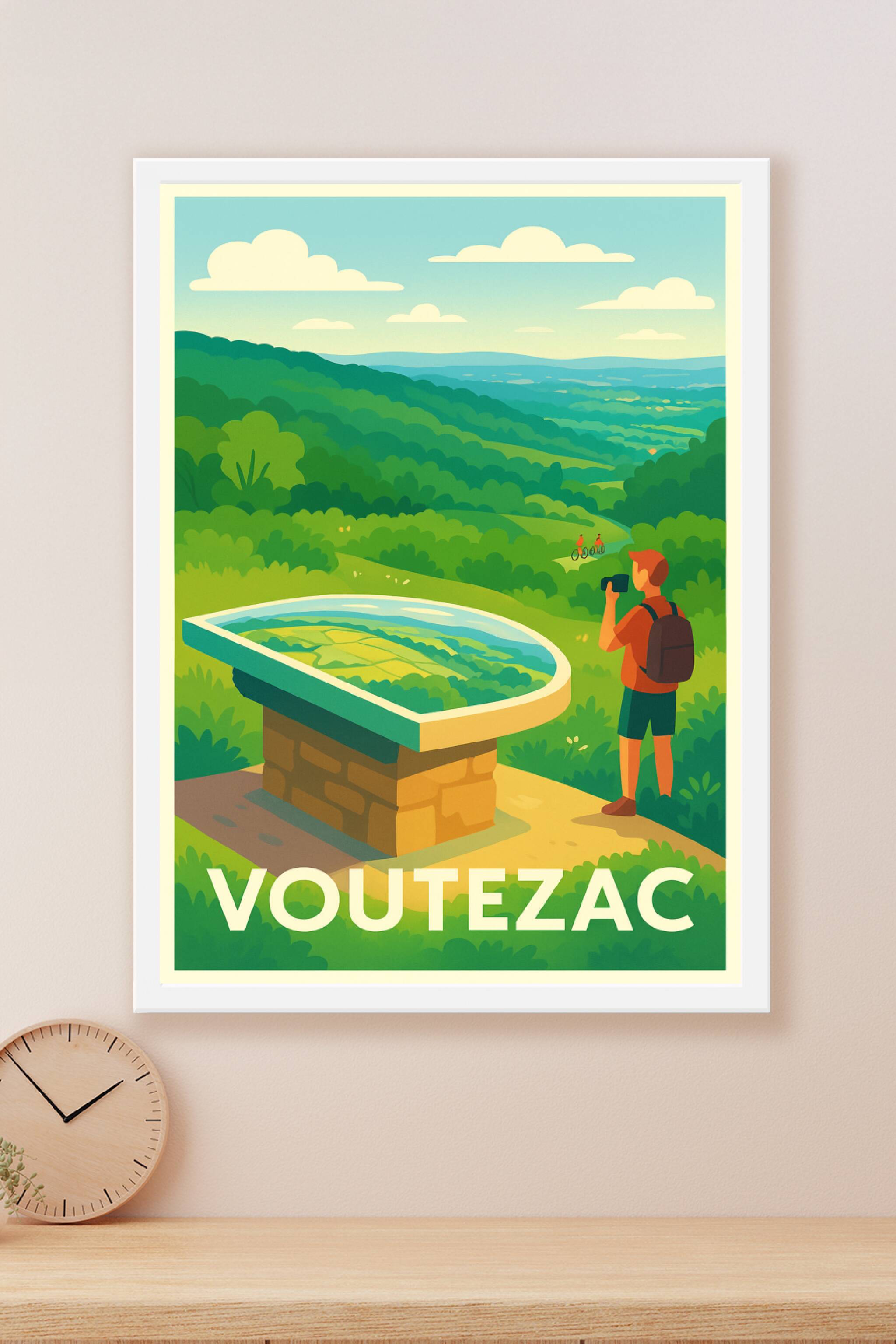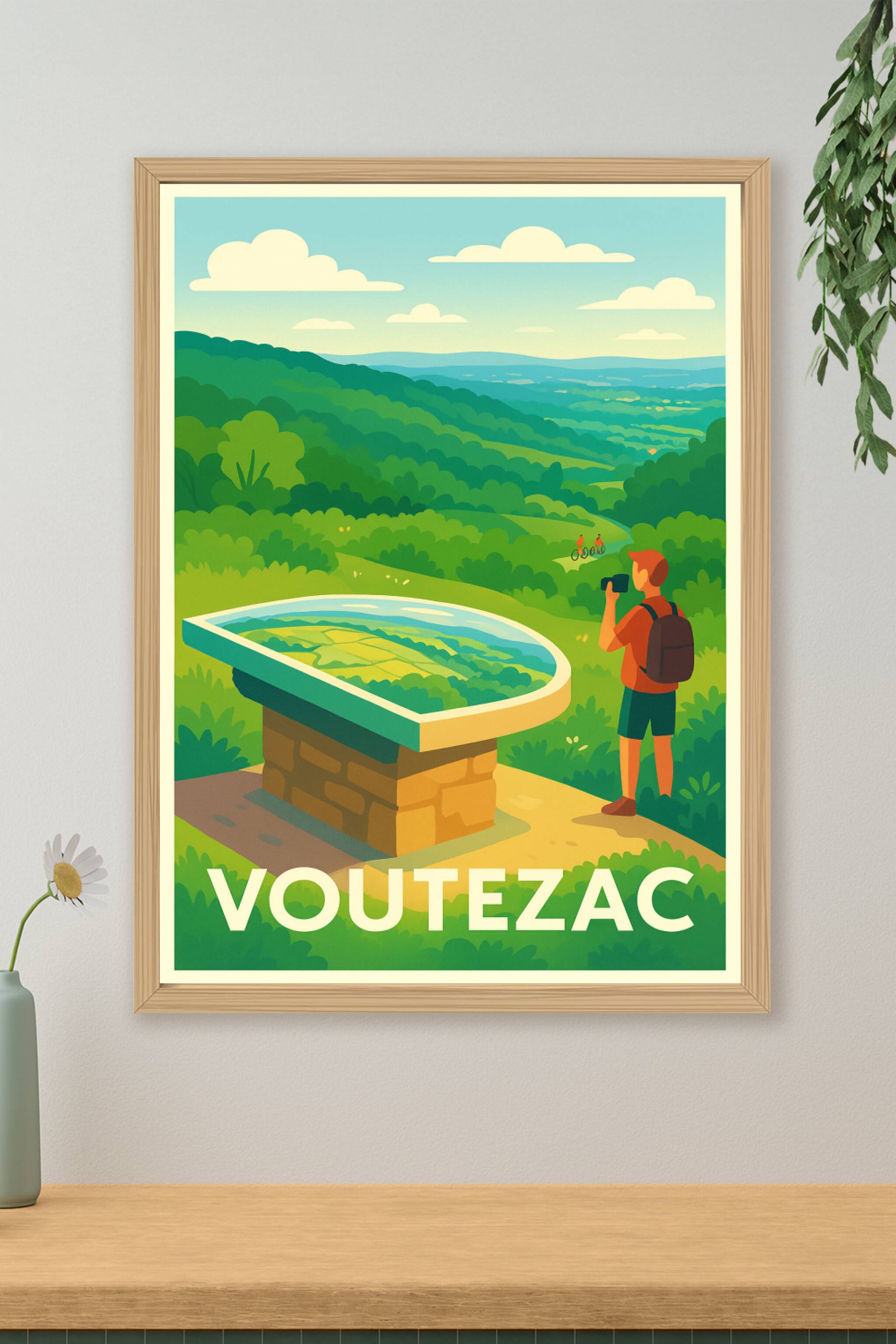 Découvrez la beauté paisible et verdoyante de Voutezac à travers cette affiche illustrée au style doux et moderne. Un instant capturé où la nature ...