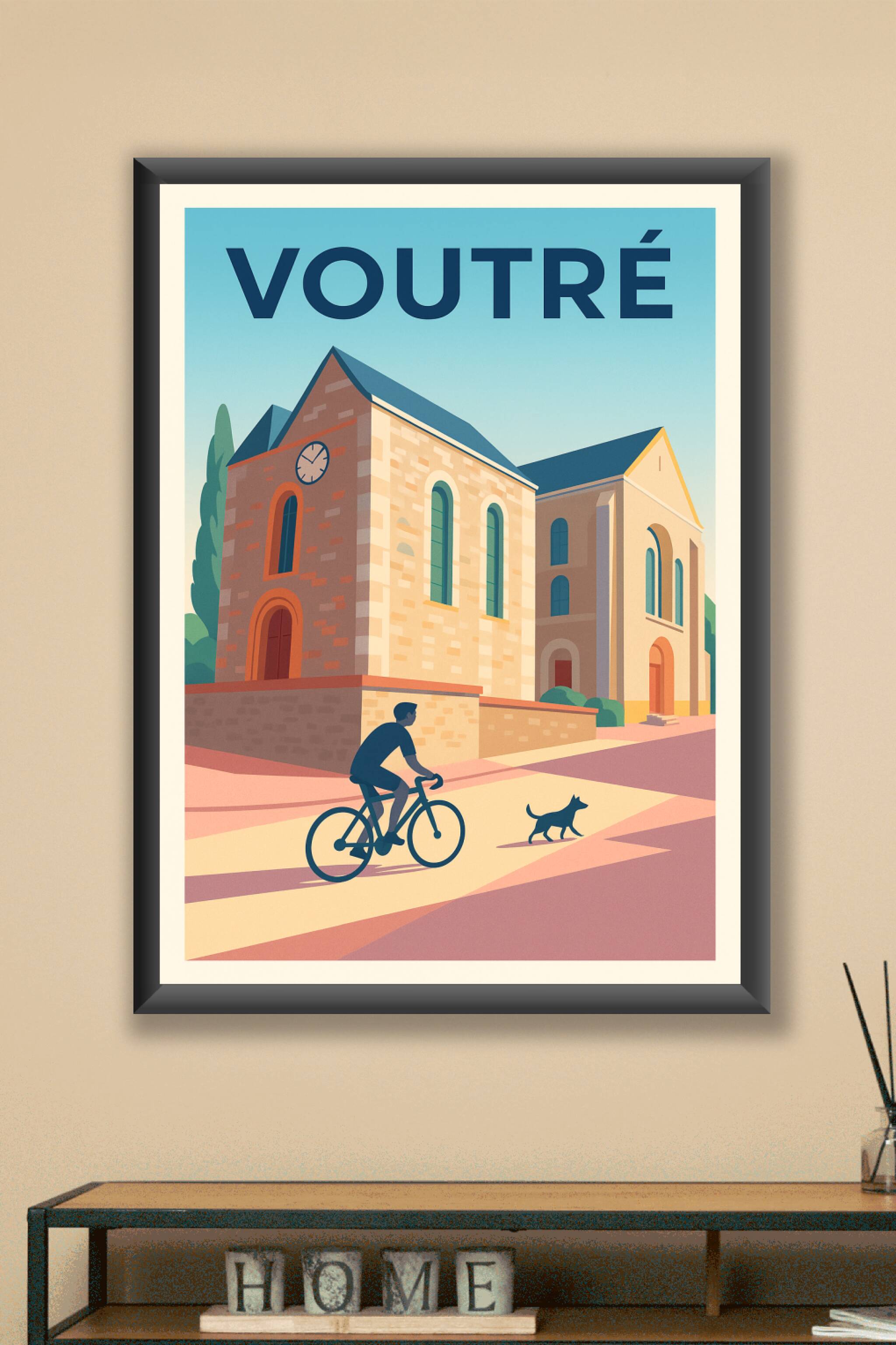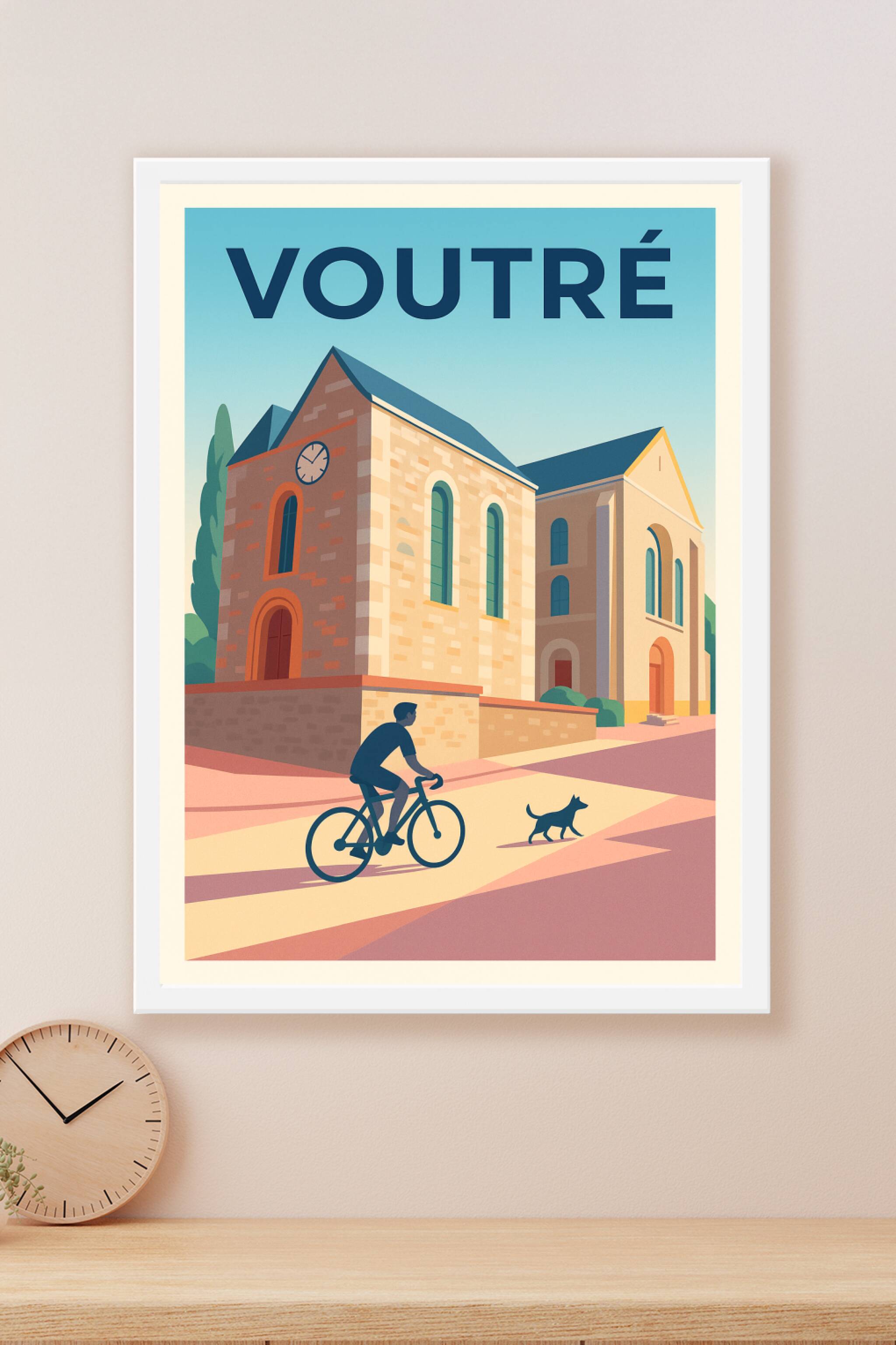Découvrez l'atmosphère sereine de Voutré avec cette affiche illustrée, où un cycliste et son chien traversent les ruelles baignées de lumière douce...