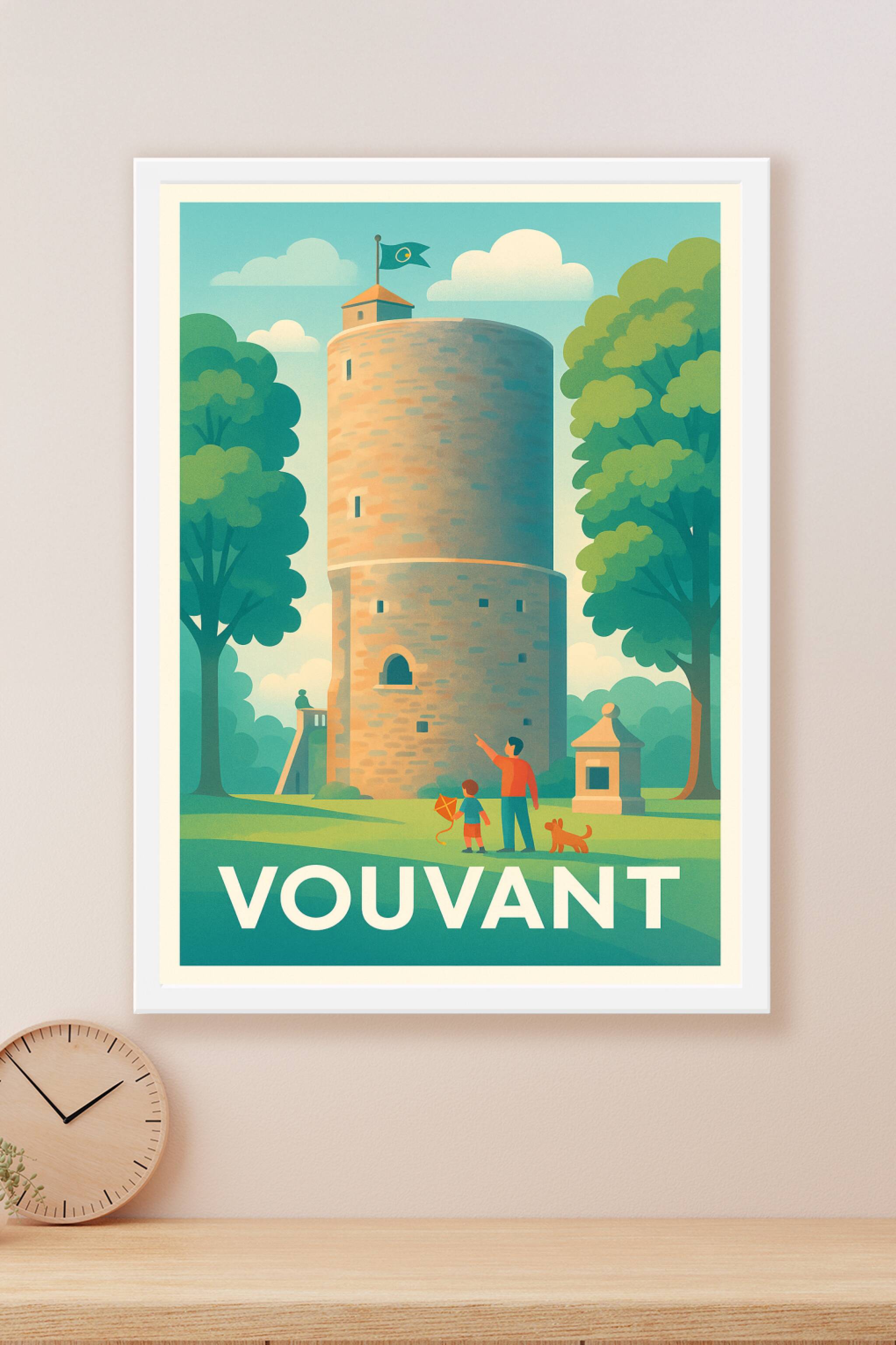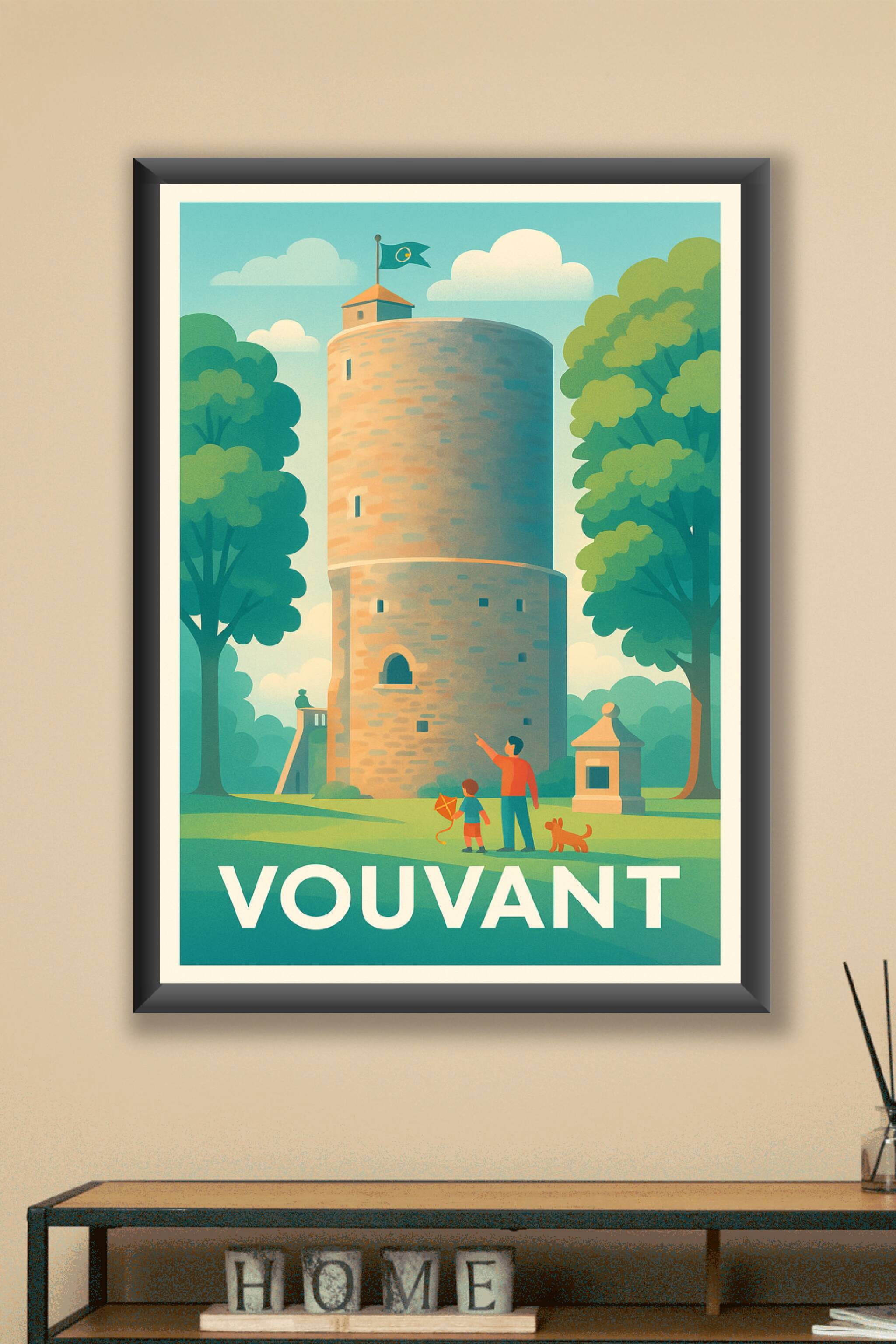 Découvrez l'atmosphère paisible et historique de Vouvant avec cette affiche illustrée mettant en scène la célèbre tour médiévale, entourée d'arbres...