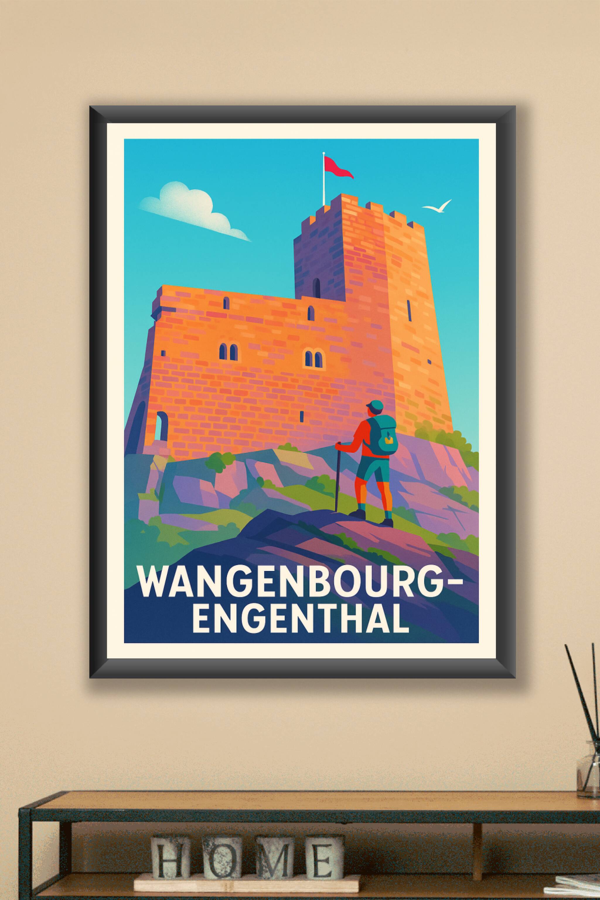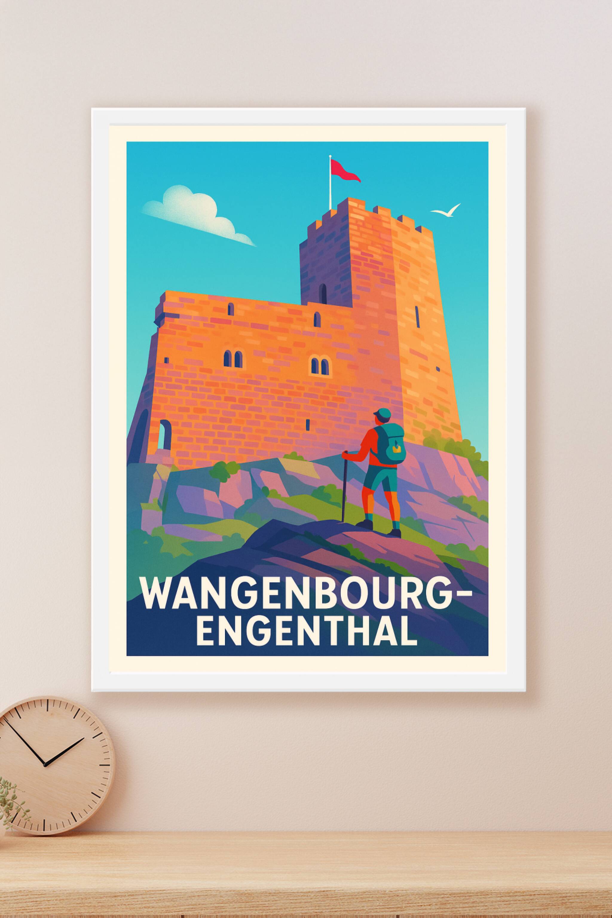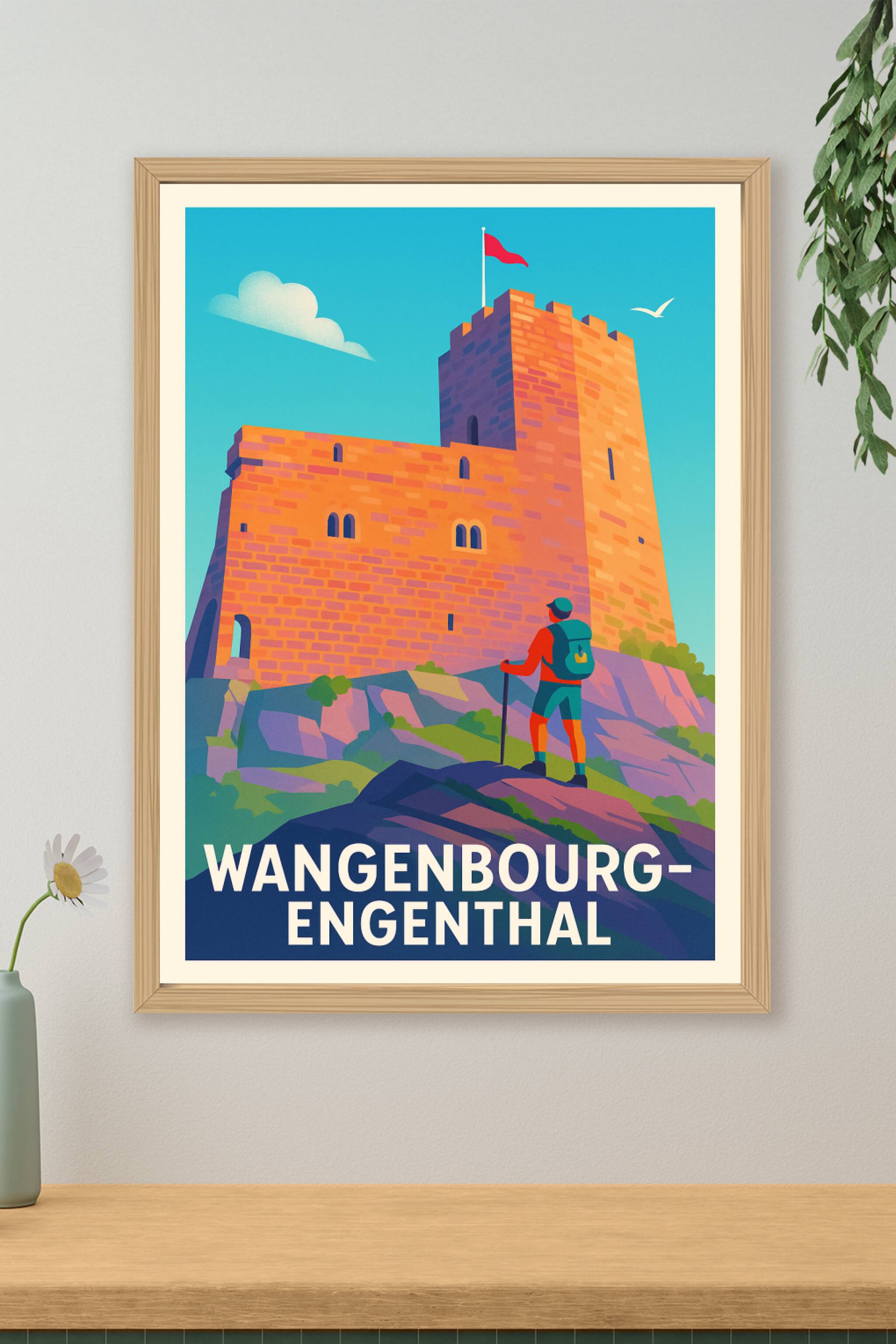 Découvrez l'imposante beauté du château de Wangenbourg-Engenthal à travers cette affiche au style coloré et dynamique. Représentant un randonneur f...