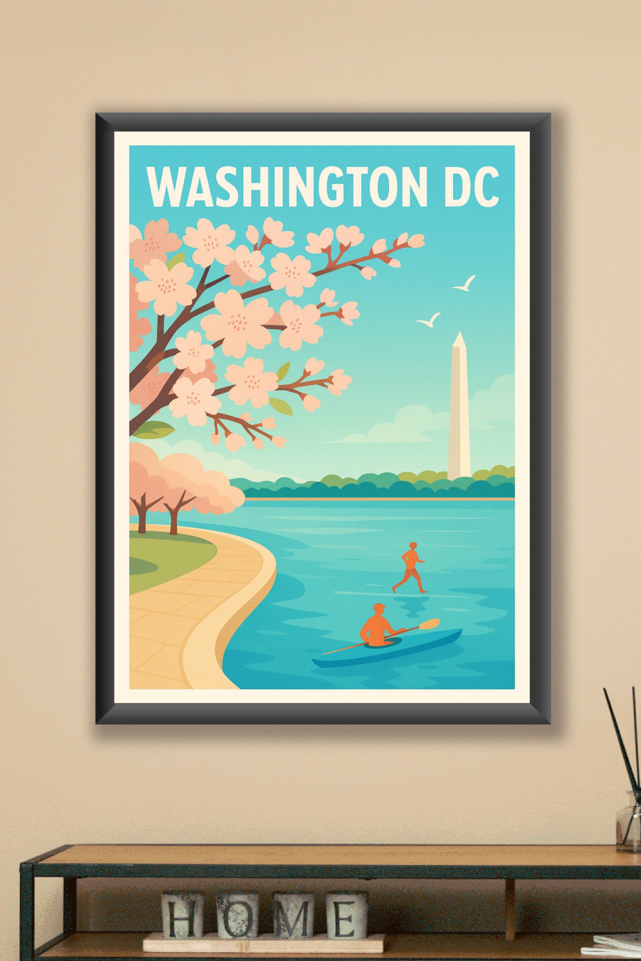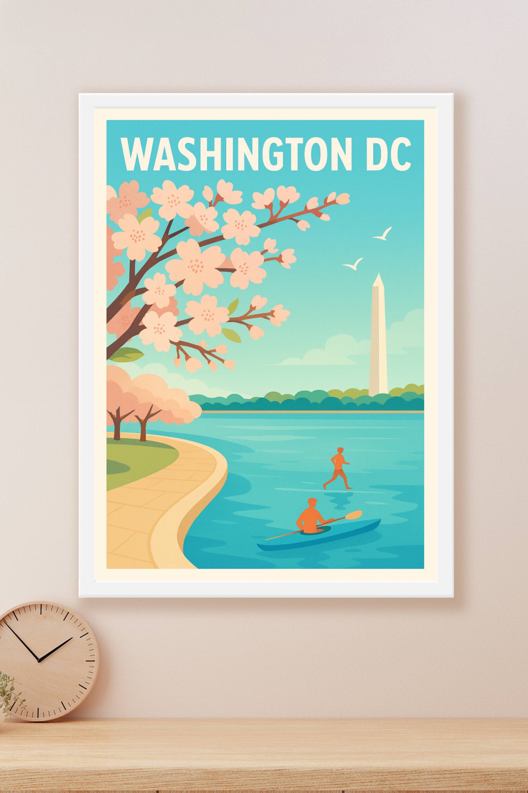 Apportez une touche de sérénité et de fraîcheur à votre décoration avec cette affiche représentant Washington DC au printemps. Les cerisiers en fleurs s'épanouissent au bord de l'eau, avec en arrière-plan l'emblématique monument de Washington et deux silhouettes en pleine activité nautique. Ce poster au design épuré et coloré évoque l'esprit dynamique et naturel de la capitale américaine.Cette affiche est imprimée en tirage "Fine Art" sur un papier 305g coton, garantissant une qualité d'impression exceptionnelle et une durabilité remarquable. Disponible en plusieurs formats, du A1 au A4, avec ou sans cadre, elle s'adapte parfaitement à tous les espaces et styles d'intérieur.Fabriquée en France, cette pièce unique sublimera votre mur ou fera un cadeau idéal pour les amoureux de Washington DC et des ambiances printanières.