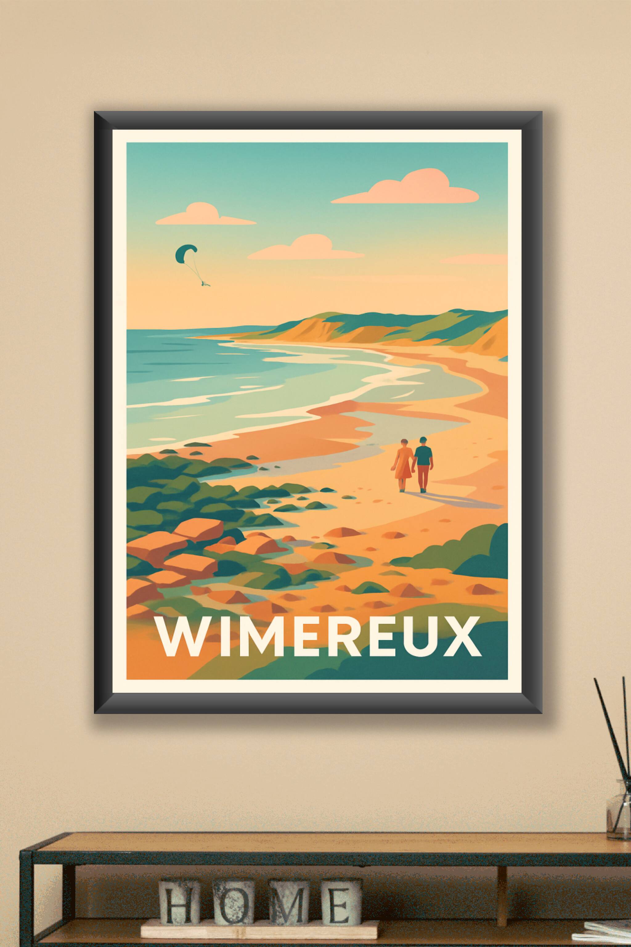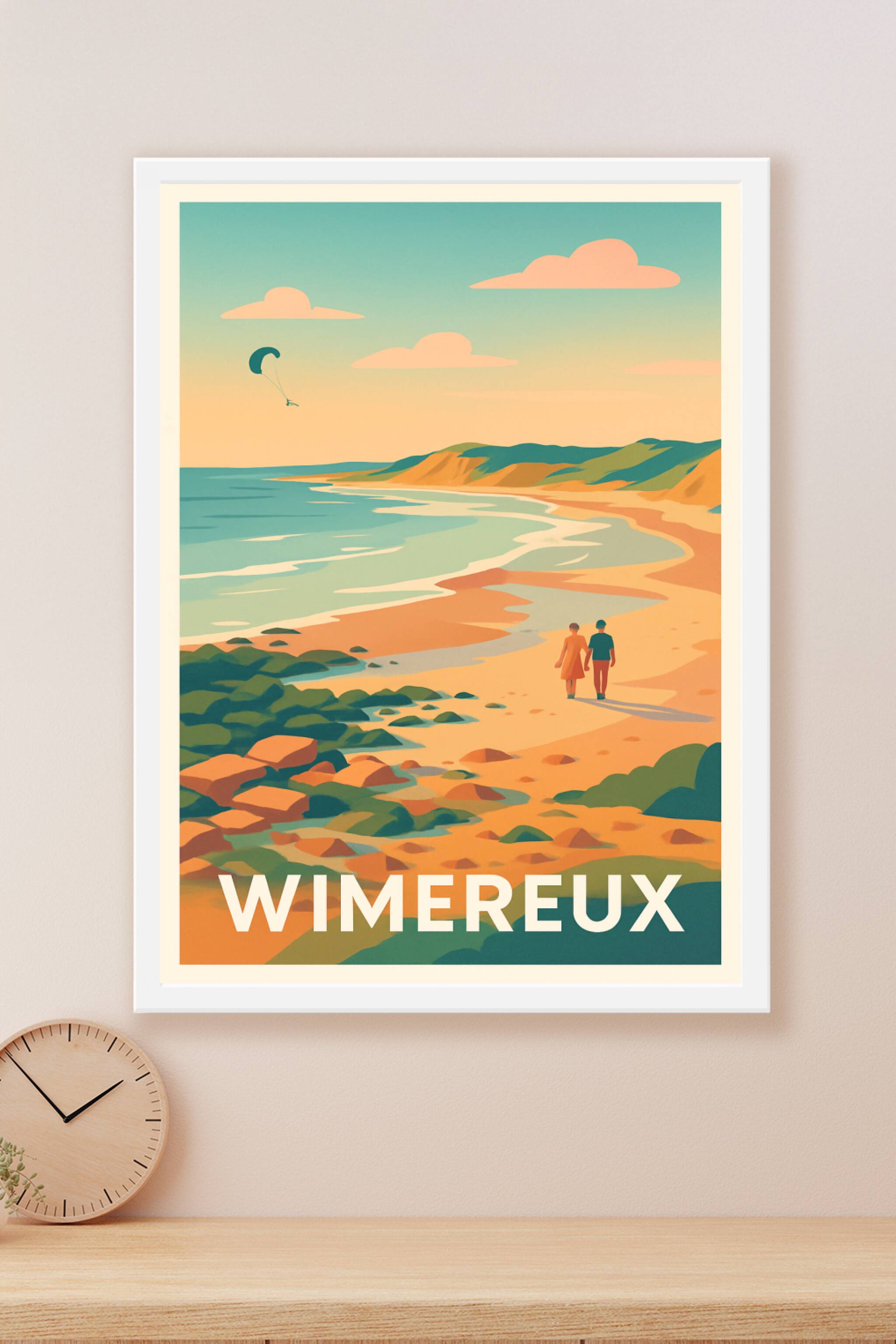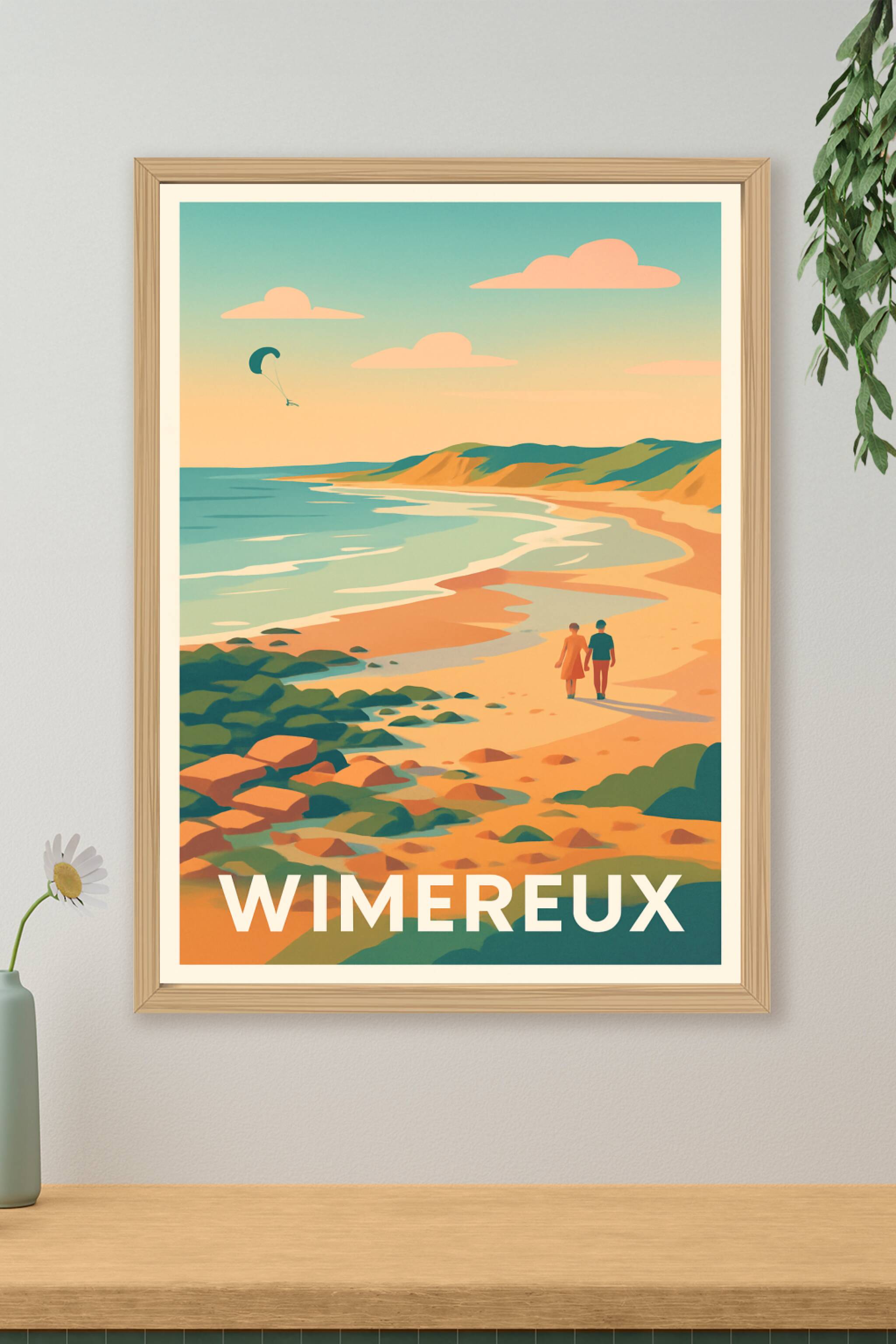 Découvrez la douceur et la sérénité de Wimereux à travers cette affiche illustrée où un couple se balade le long d'une plage aux tons chaleureux et...