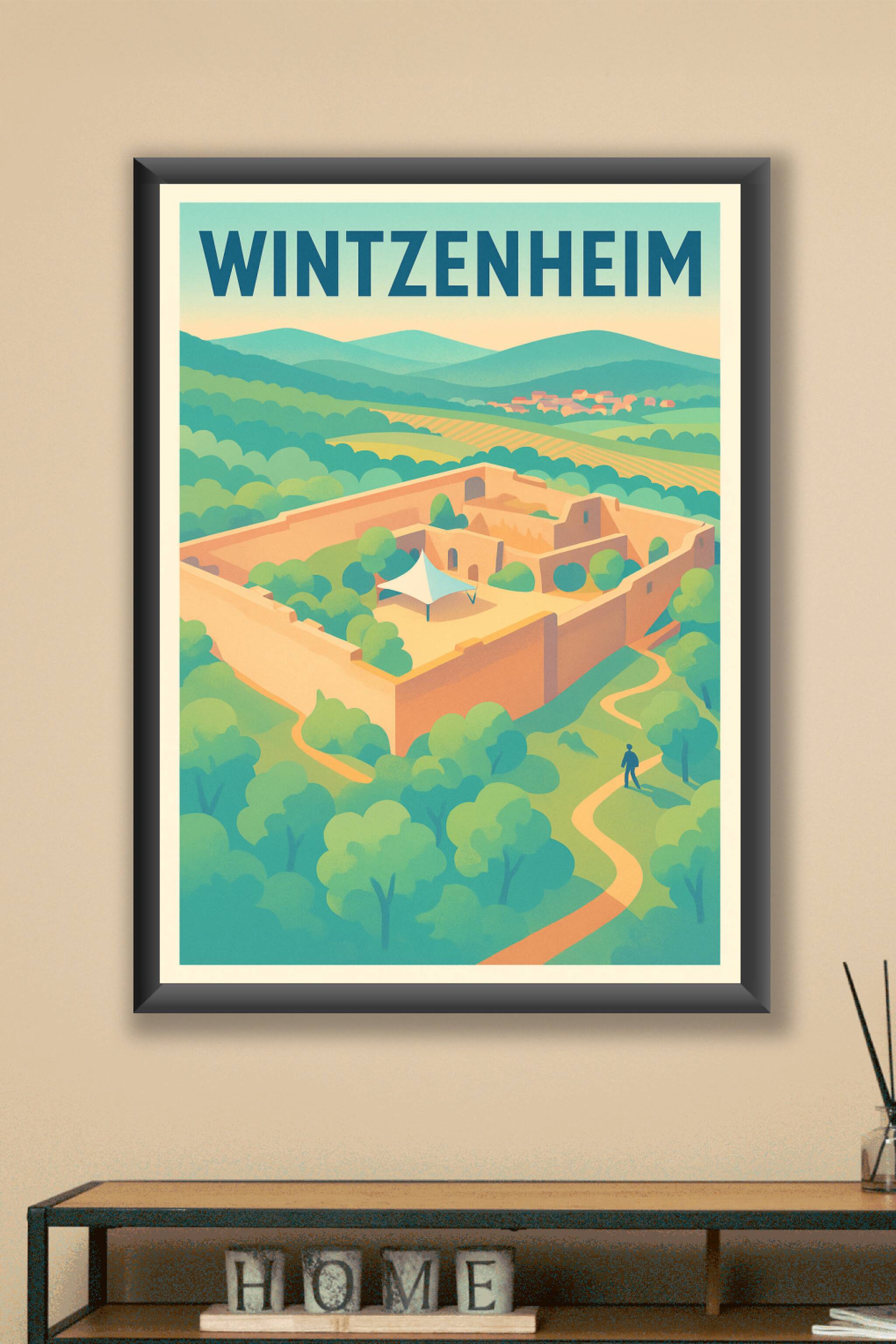 Découvrez l'ambiance paisible et verdoyante de Wintzenheim à travers cette affiche illustrée qui met en valeur ses ruines historiques entourées de ...