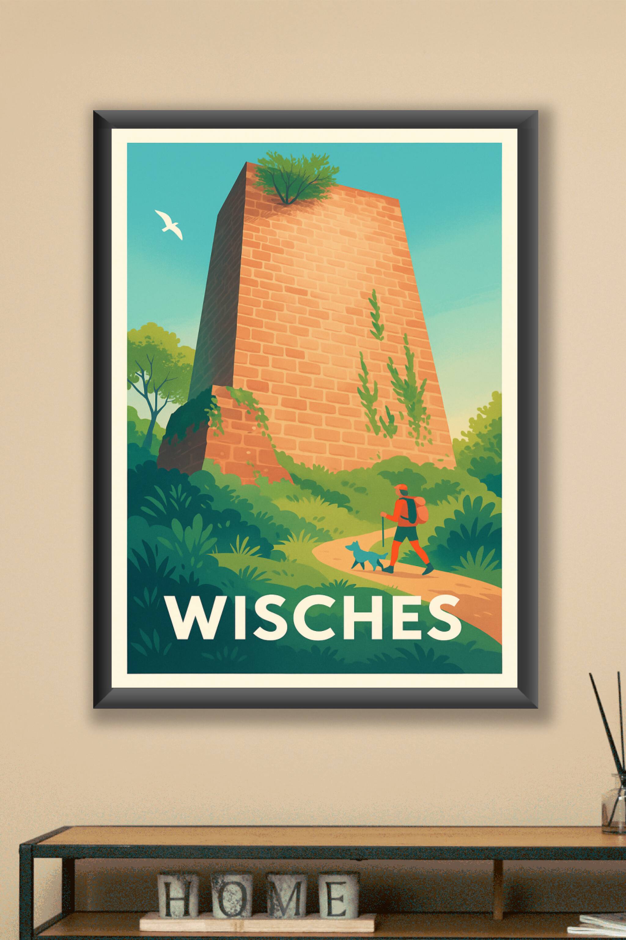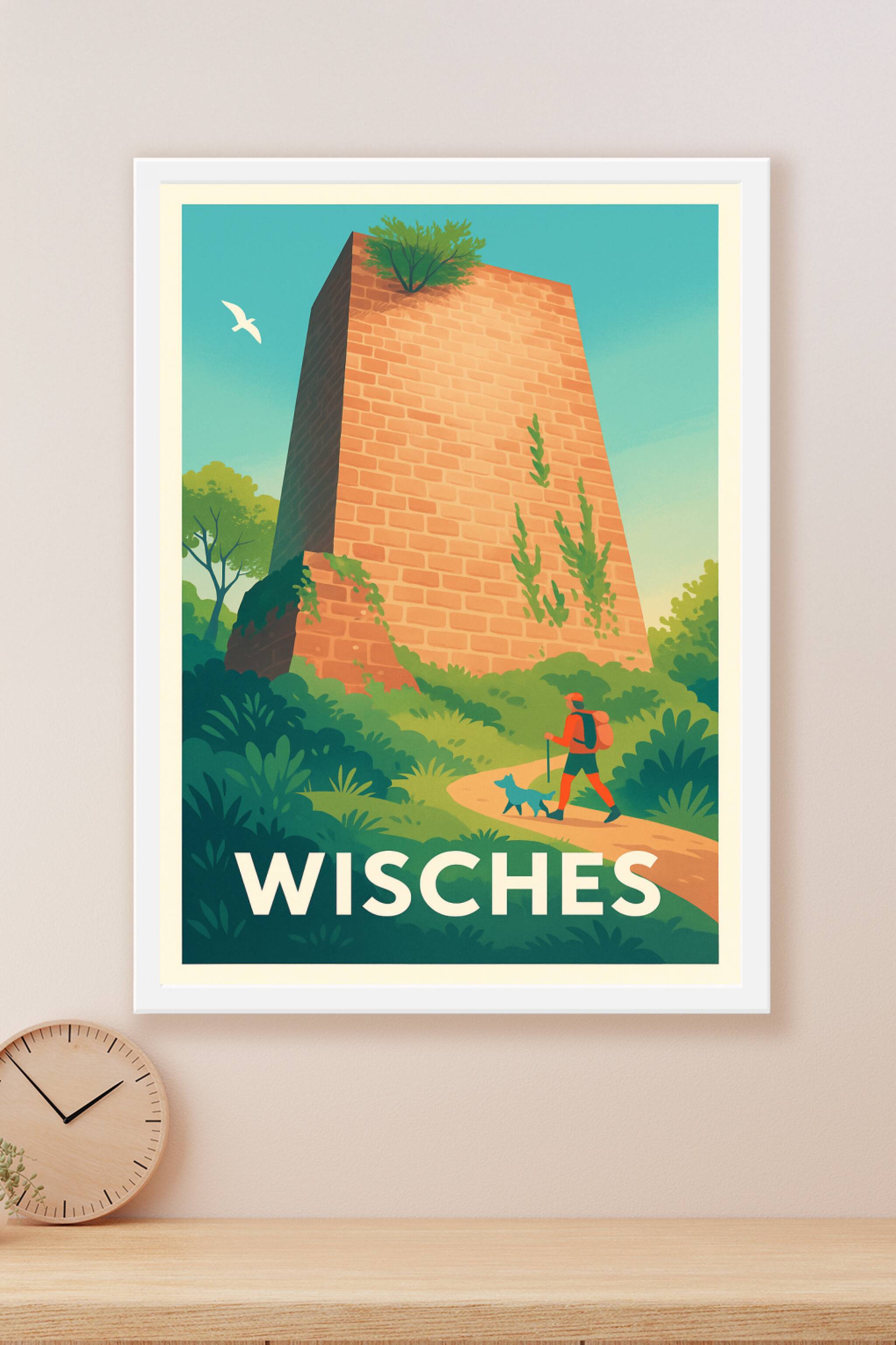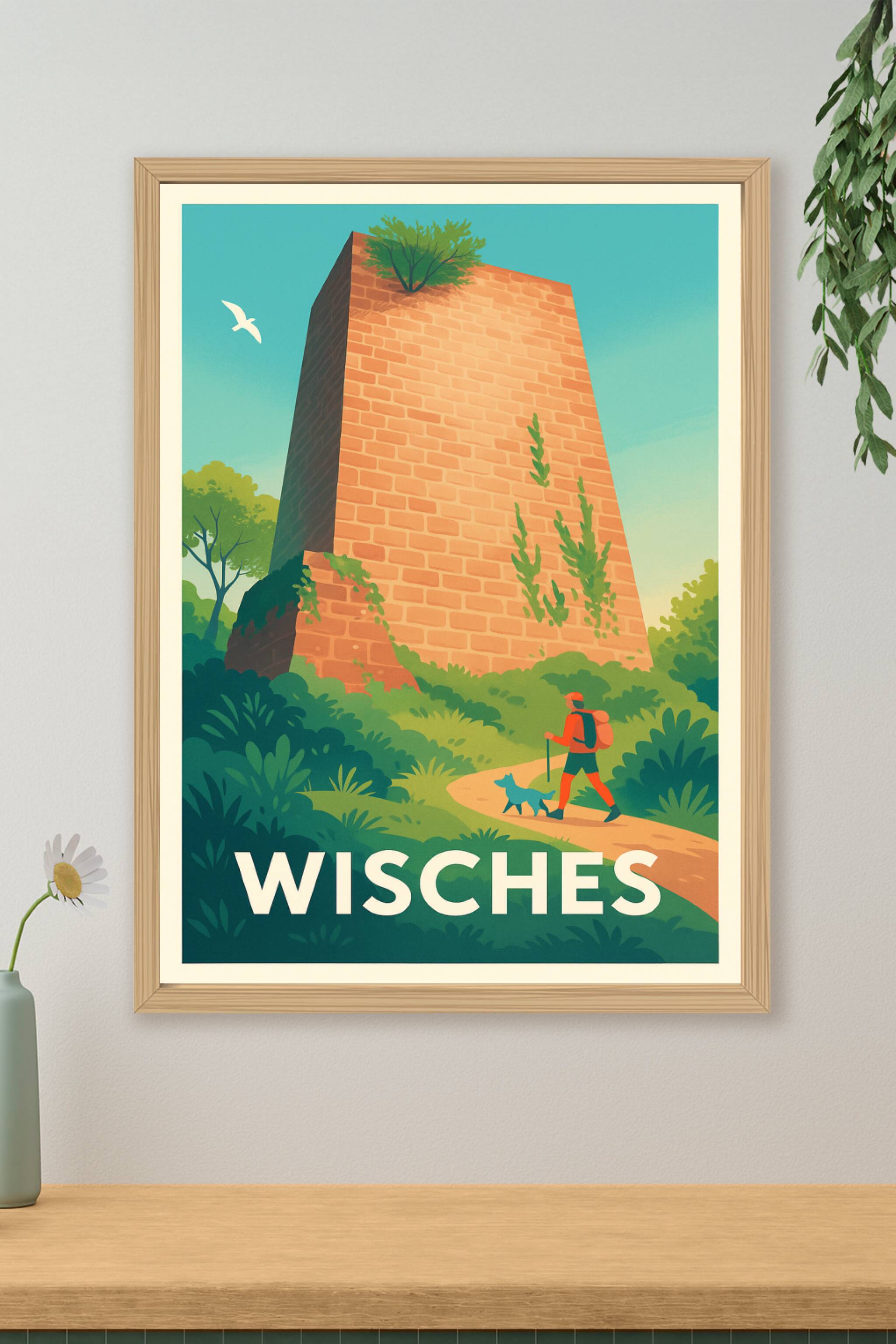 Découvrez la beauté sauvage de Wisches avec cette affiche illustrée représentant une randonnée paisible autour d'une ancienne tour en pierres. Véri...