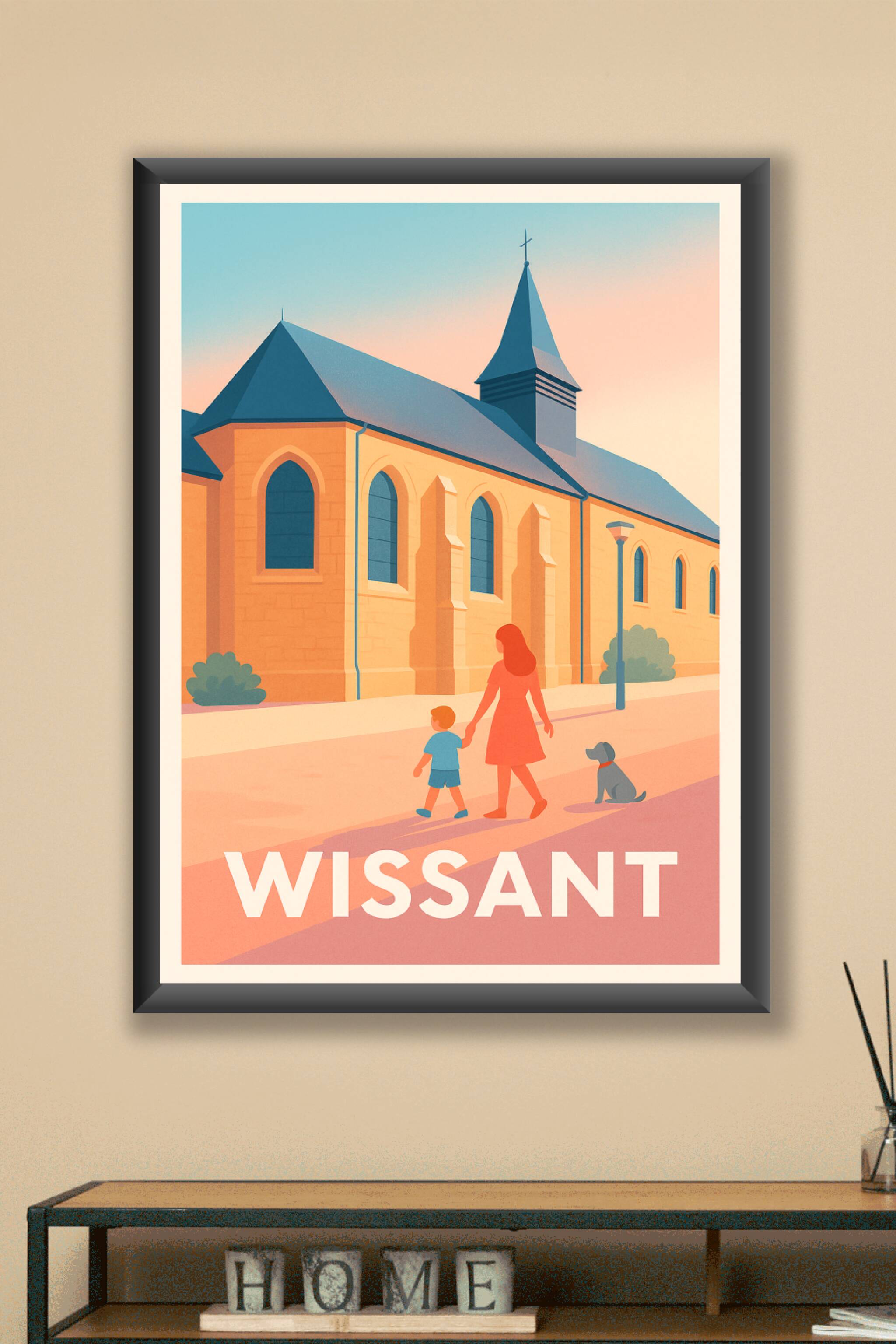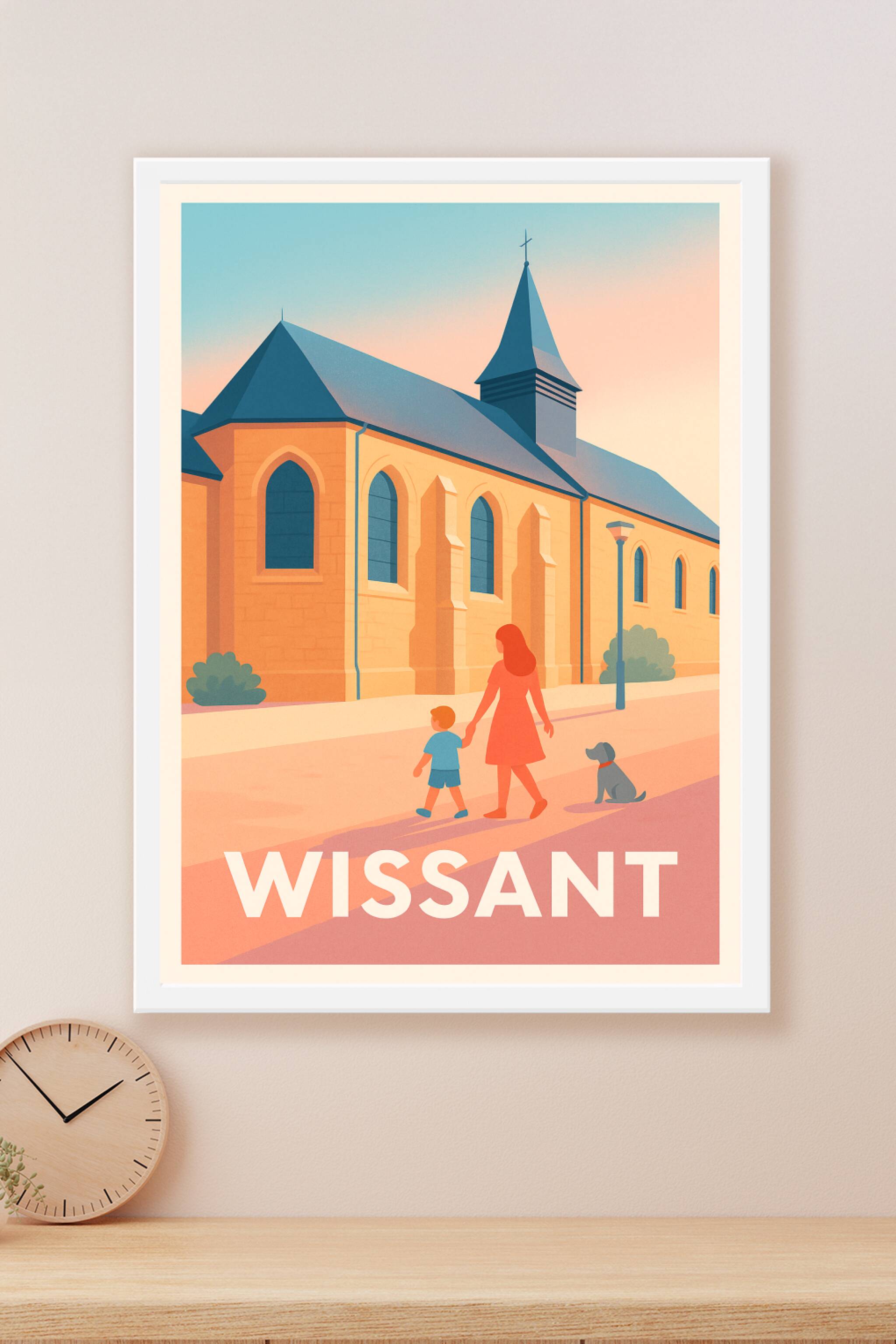 Découvrez la quiétude de Wissant à travers cette affiche illustrée au style épuré et chaleureux, représentant une scène familiale devant une église...