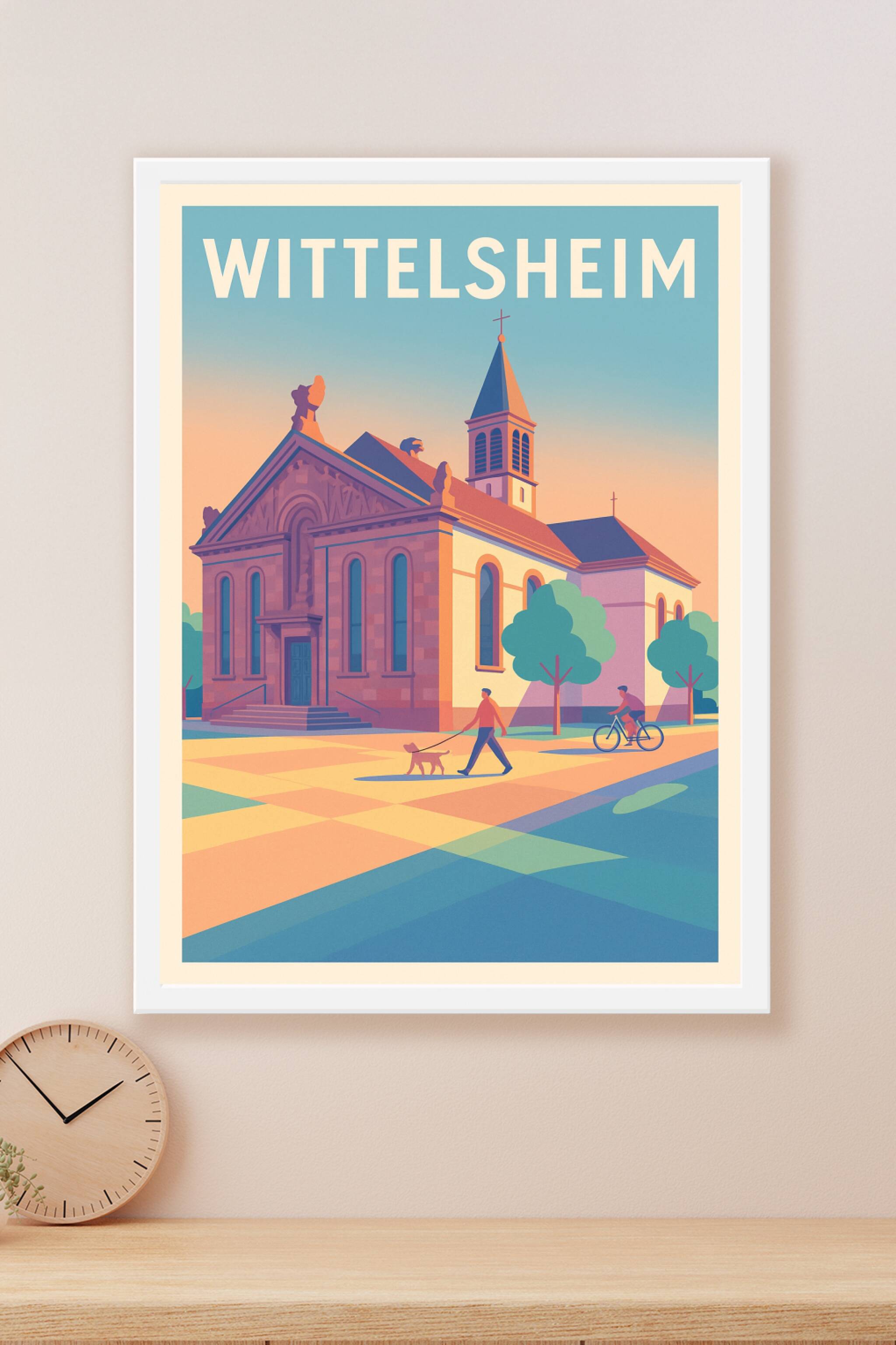 Découvrez l'atmosphère tranquille et authentique de Wittelsheim avec cette affiche illustrée mettant en scène un édifice emblématique sous une lumi...