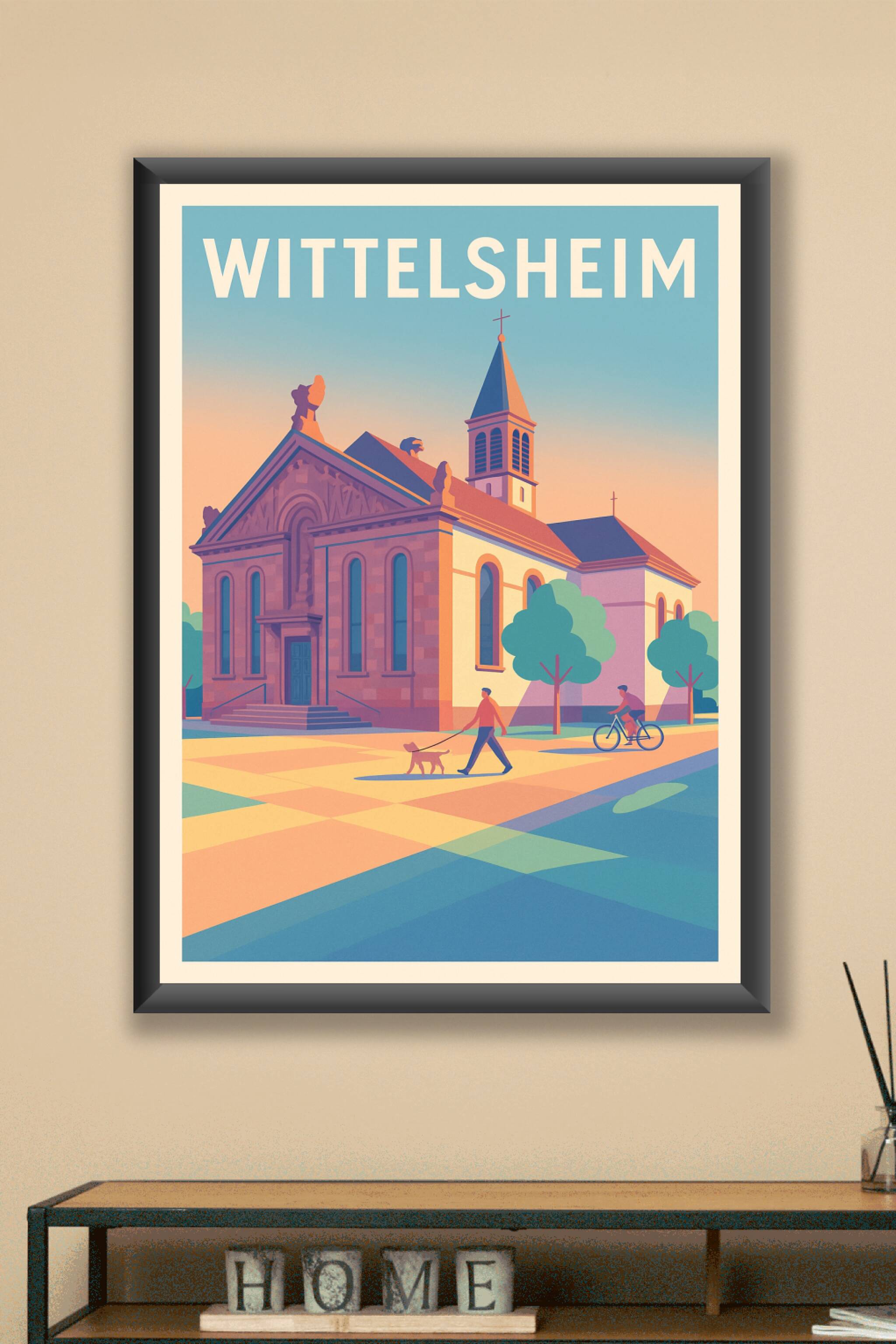 Découvrez l'atmosphère tranquille et authentique de Wittelsheim avec cette affiche illustrée mettant en scène un édifice emblématique sous une lumière douce et chaleureuse. Ce poster saisit parfaitement l'essence d'une ville alsacienne entre histoire et modernité, avec des personnages profitant d'une promenade paisible. Imprimé en tirage "Fine Art" sur papier 305g coton d'une qualité remarquable, ce poster est disponible en formats A1 à A4, avec ou sans cadre. Offrez-vous ou à vos proches cette pièce d'exception, parfaite pour sublimer votre intérieur avec une touche locale élégante, alliant rendu artistique et impression premium 100% fabriquée en France.