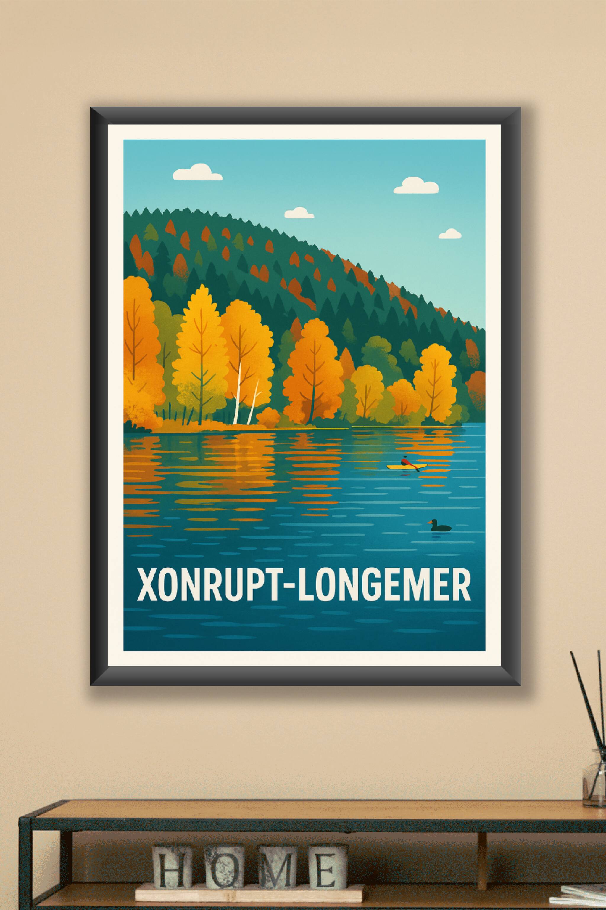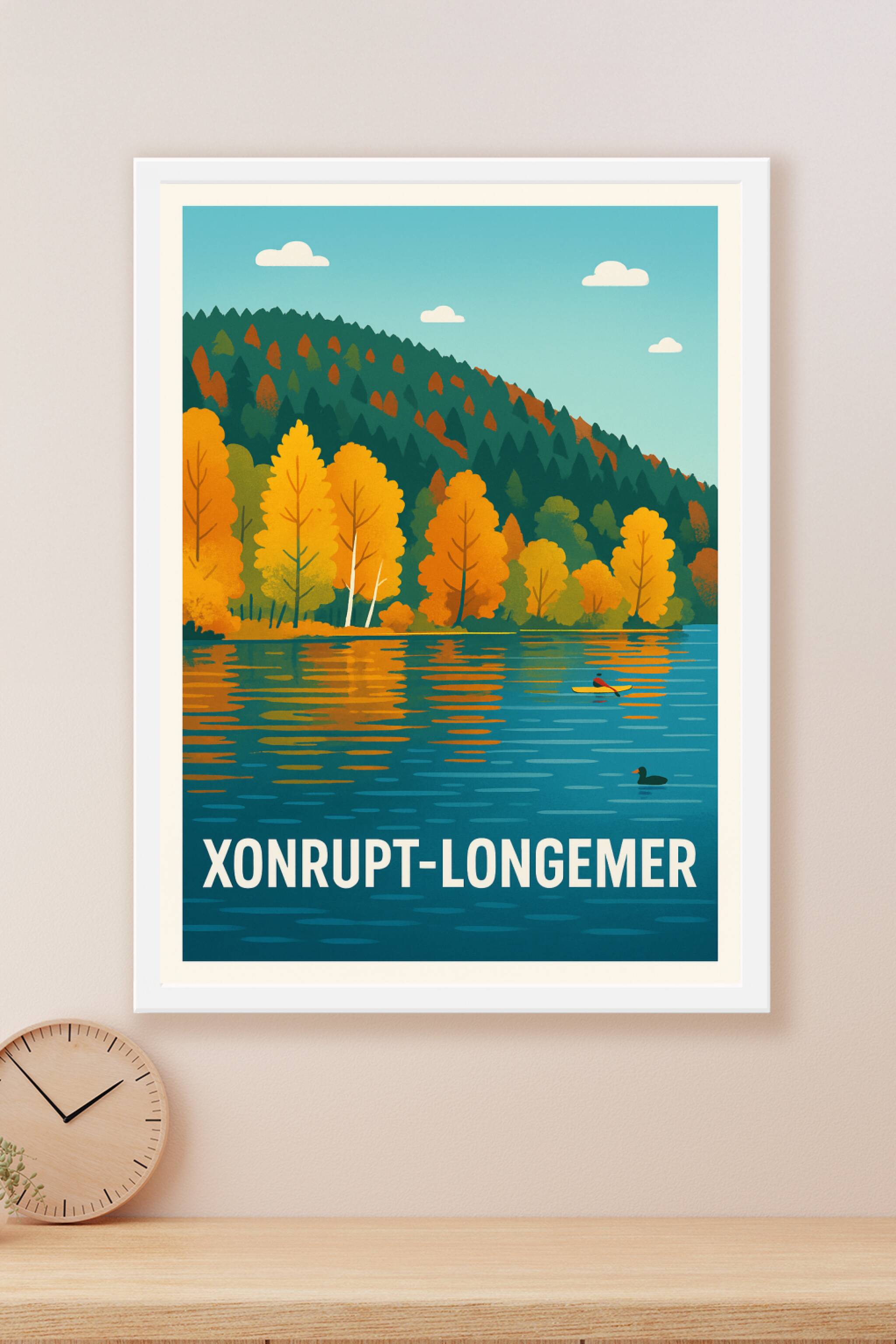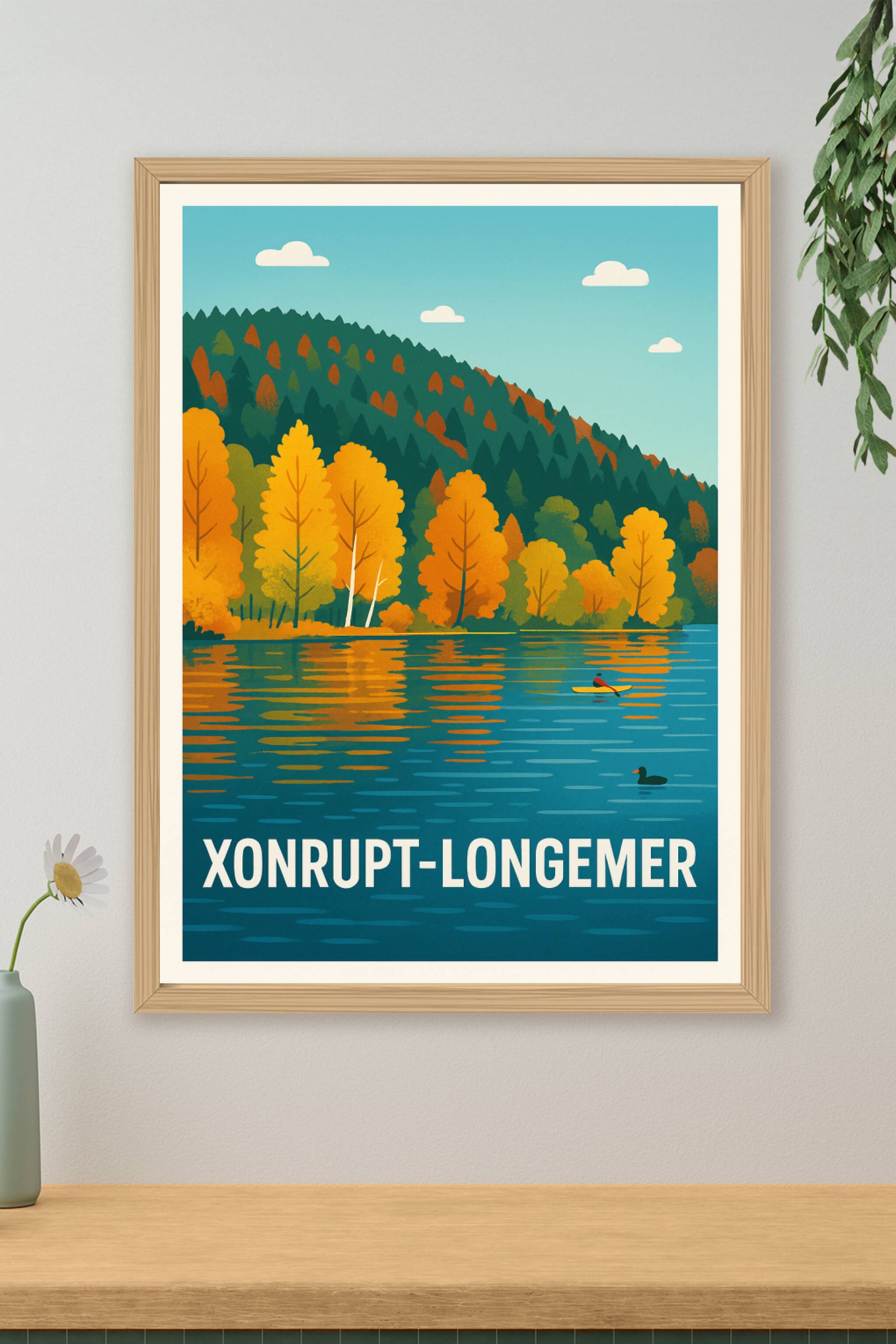 Découvrez la beauté paisible et colorée de Xonrupt-Longemer à travers cette affiche au style rétro moderne. Le poster met en scène les eaux calmes ...