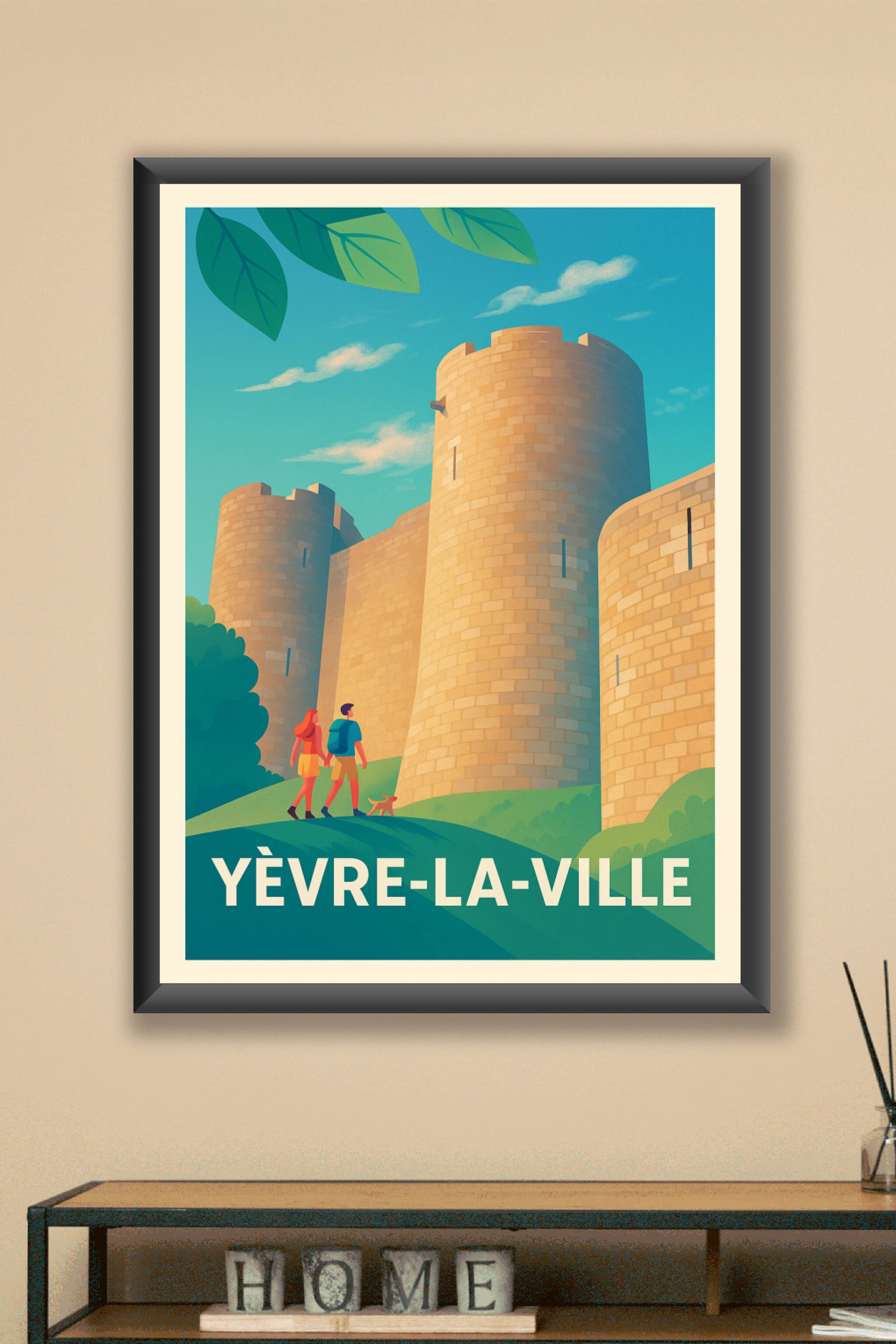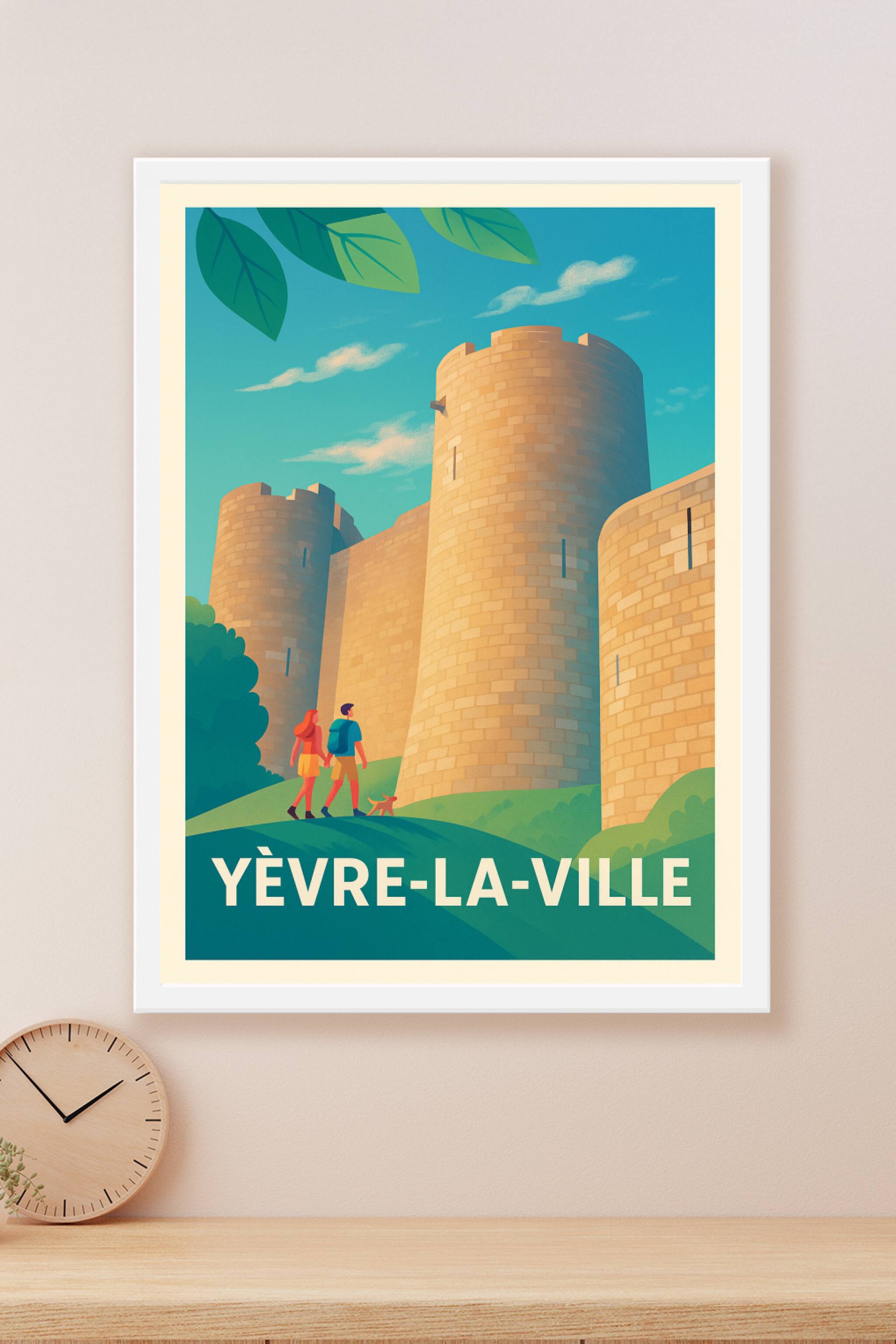 Découvrez le charme médiéval de Yèvre-la-Ville avec cette affiche illustrée mettant en valeur ses imposantes tours en pierre sous un ciel azur. Ce poster capture l'ambiance paisible et bucolique d'une promenade en couple avec leur chien, au cœur d'un paysage verdoyant. Imprimé en tirage "Fine Art" sur papier 305g coton, il garantit une netteté et des couleurs éclatantes pour une décoration intérieure élégante. Disponible en formats A1 à A4, avec ou sans cadre, cette affiche est un hommage parfait à l'histoire et à la beauté de cette ville pittoresque. Profitez d'une impression premium 100% made in France pour embellir votre espace ou offrir un souvenir unique aux amoureux de la région.