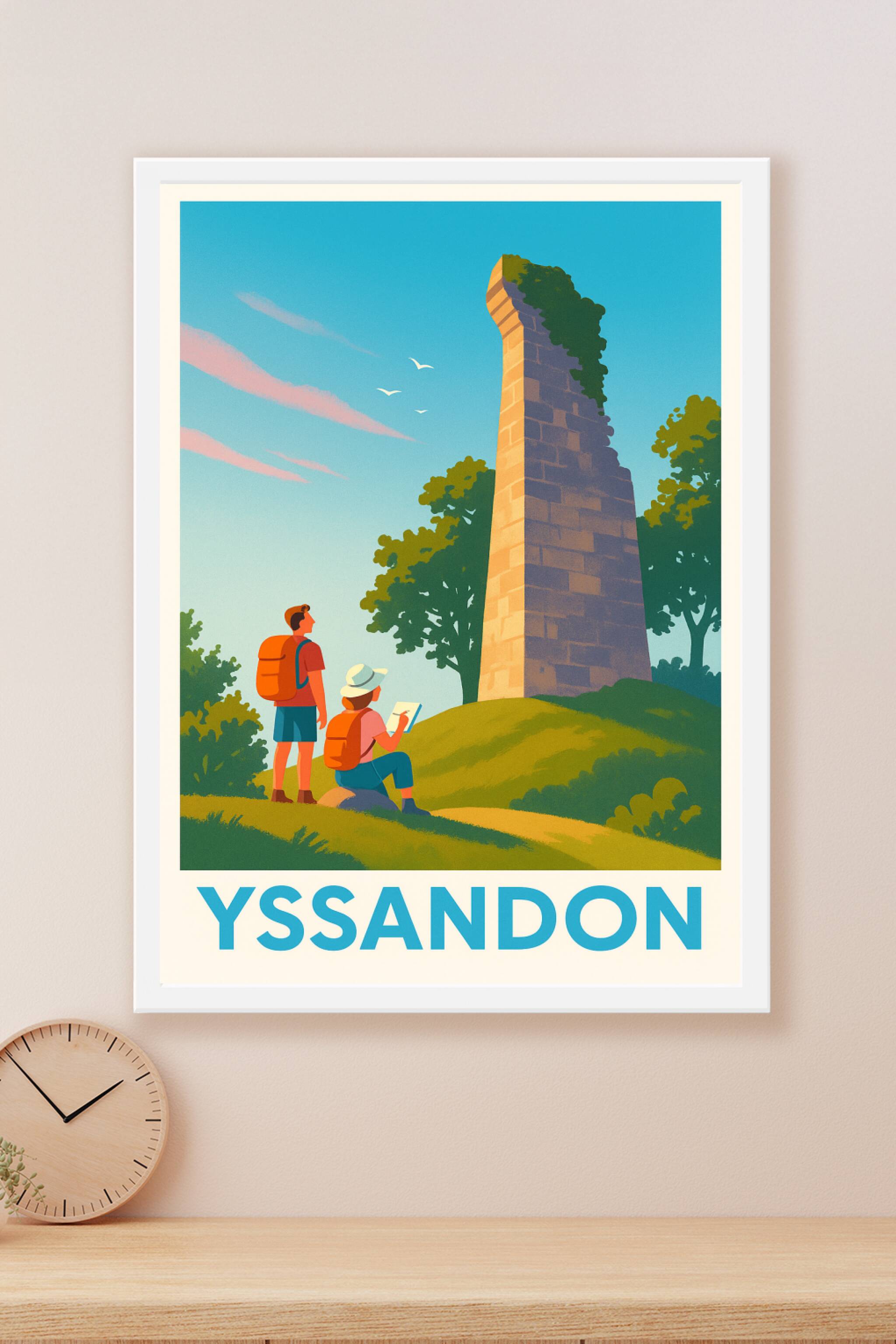 Découvrez la sérénité du petit village d'Yssandon avec cette affiche illustrée qui met en valeur ses vestiges pittoresques dans un cadre naturel apaisant. Cette affiche poster capture l'instant où deux randonneurs contemplent un monument ancien entouré de verdure et sous un ciel dégagé.Ce poster est imprimé en tirage "Fine Art" sur papier 305g coton, garantissant une qualité d'impression et une durabilité exceptionnelles. Disponible en formats A1 à A4, avec ou sans cadre, ce tirage apportera une touche authentique et naturelle à votre décoration intérieure.Idéal pour les amateurs de voyage, d'histoire et de paysages bucoliques, cette affiche premium est fabriquée en France et embellira votre intérieur ou fera un cadeau original et élégant.