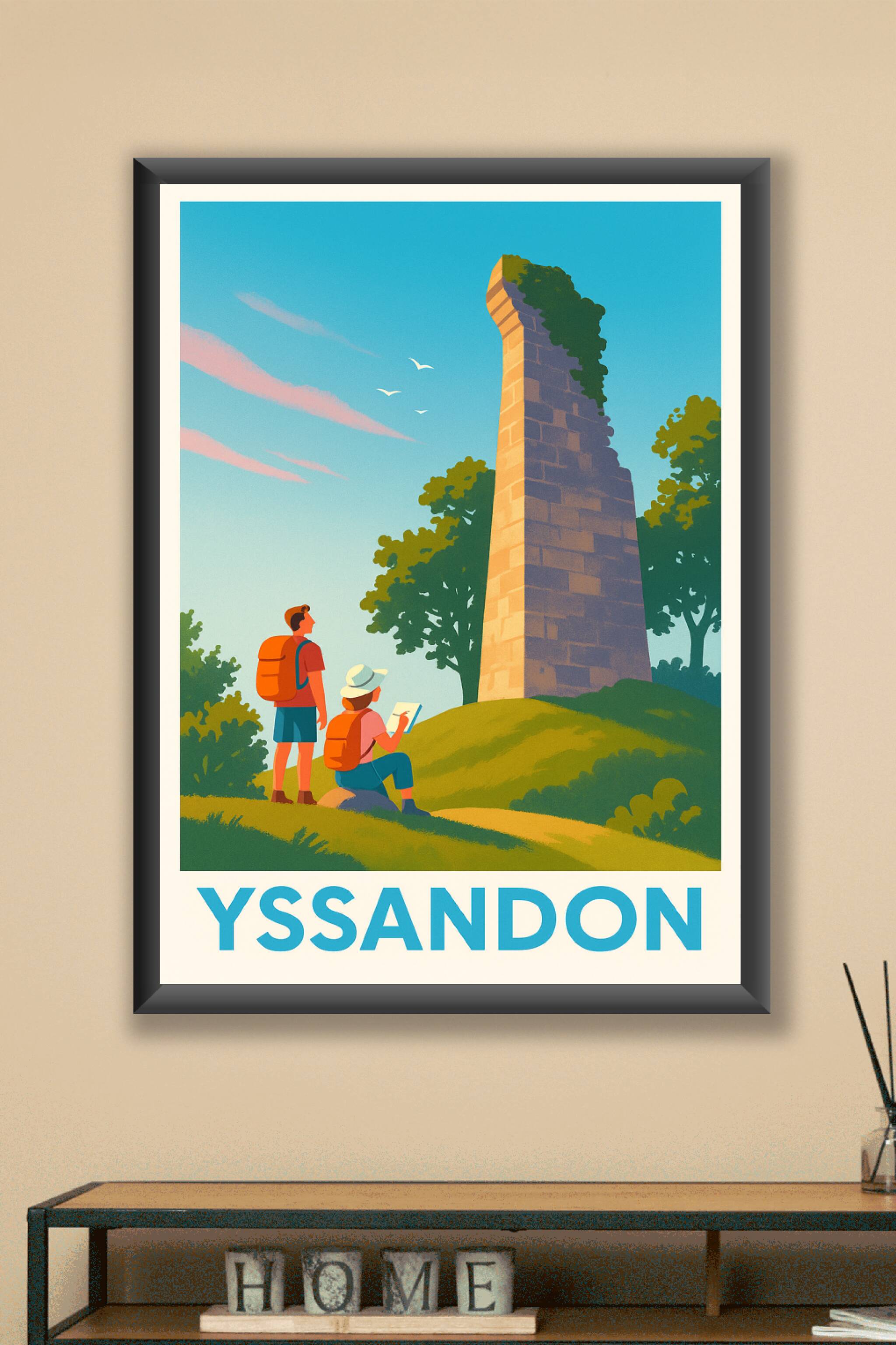 Découvrez la sérénité du petit village d'Yssandon avec cette affiche illustrée qui met en valeur ses vestiges pittoresques dans un cadre naturel ap...