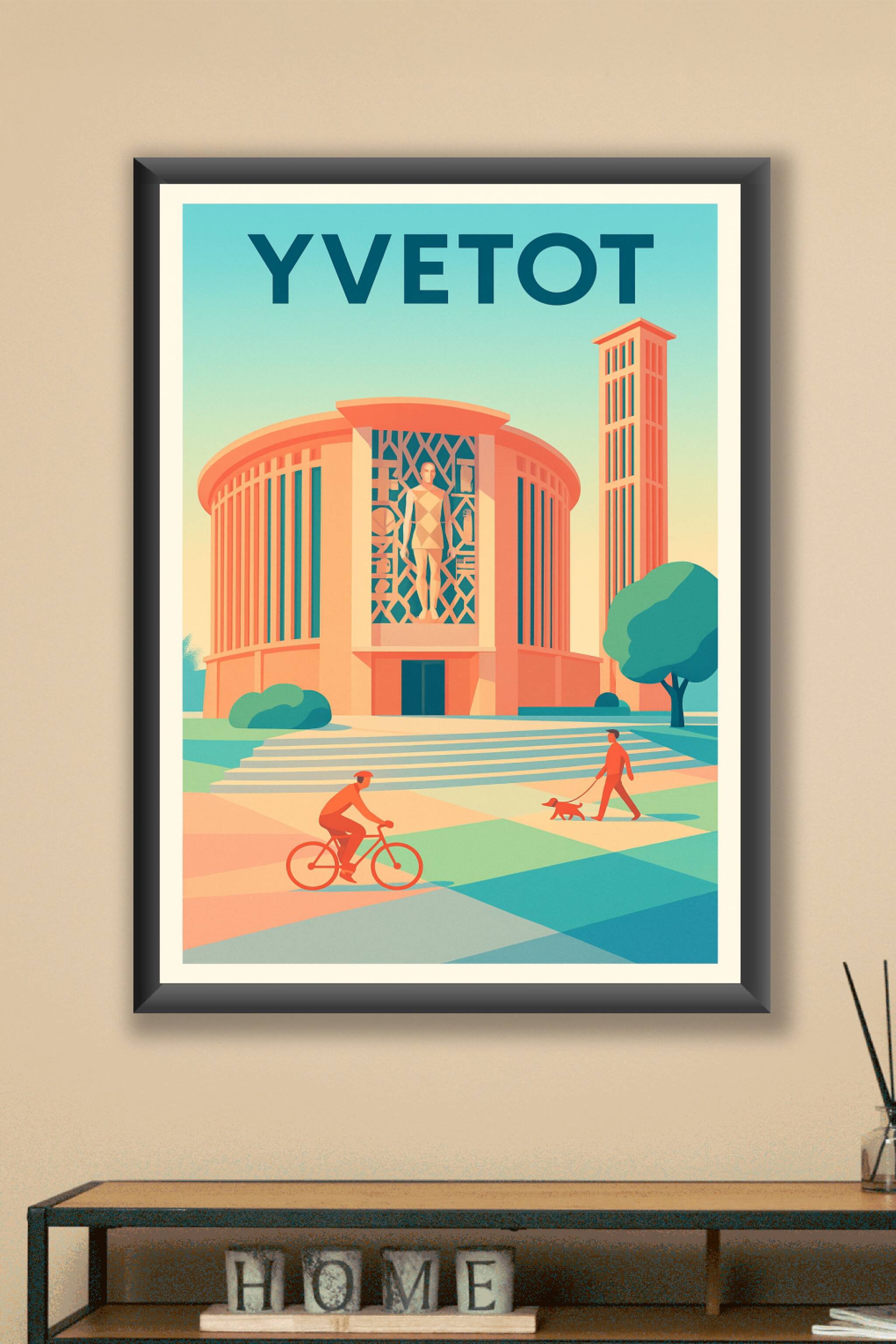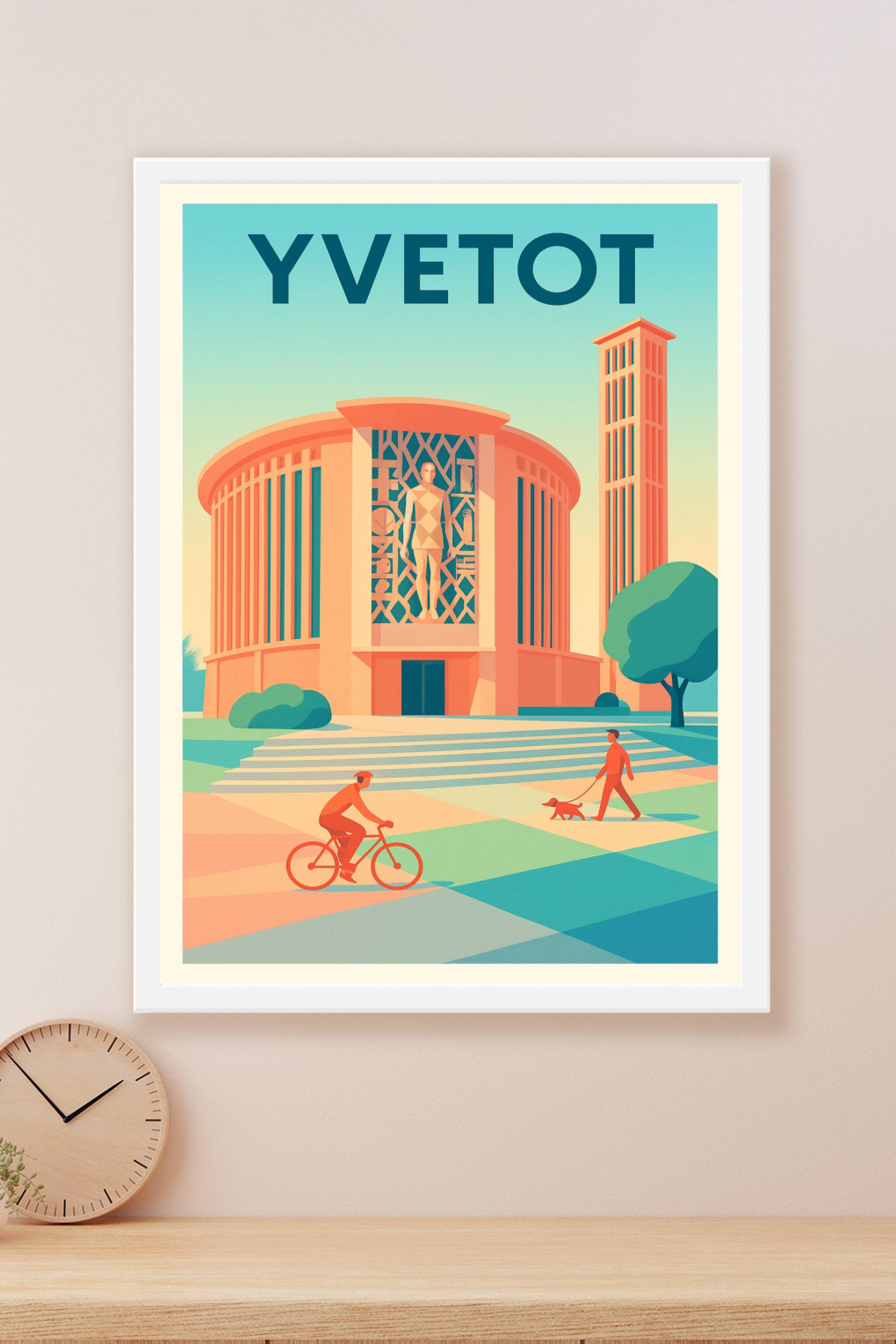 Découvrez l'élégance architecturale et la sérénité d'Yvetot à travers cette affiche aux teintes rétro et modernes. Ce poster met en lumière un bâti...