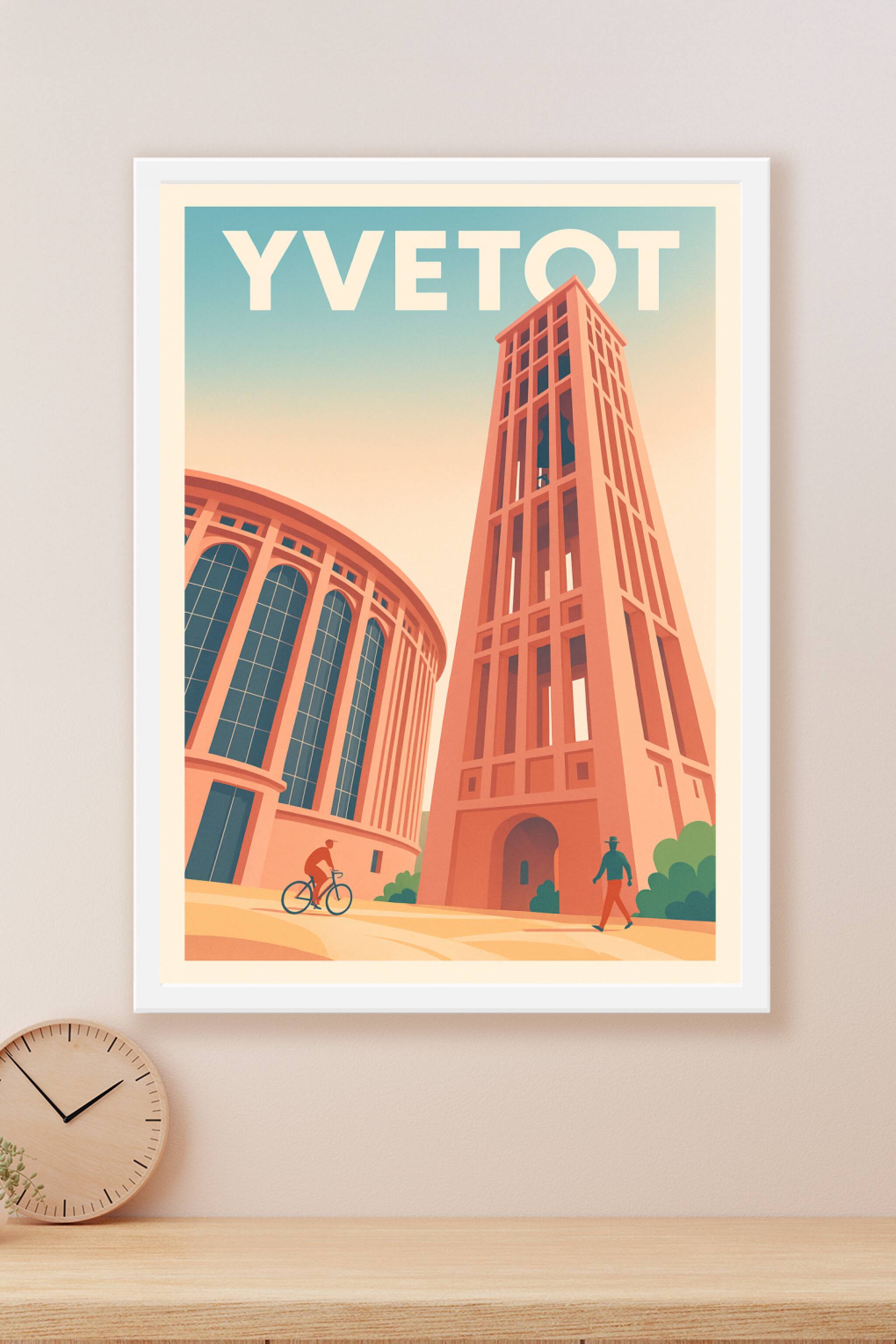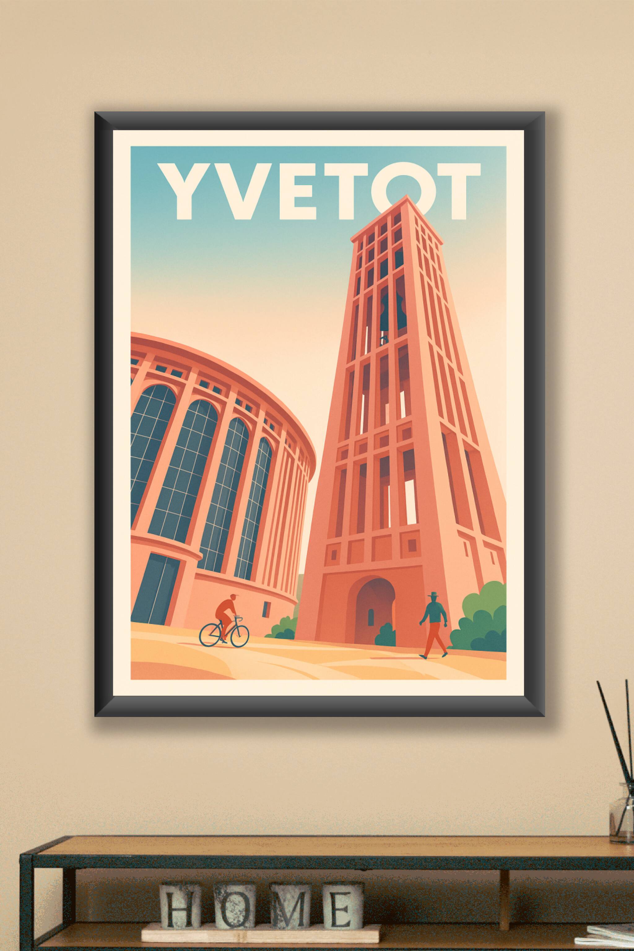 Plongez au cœur d'Yvetot avec cette affiche au design moderne mettant en scène ses bâtiments emblématiques, symboles d'un patrimoine réinterprété a...