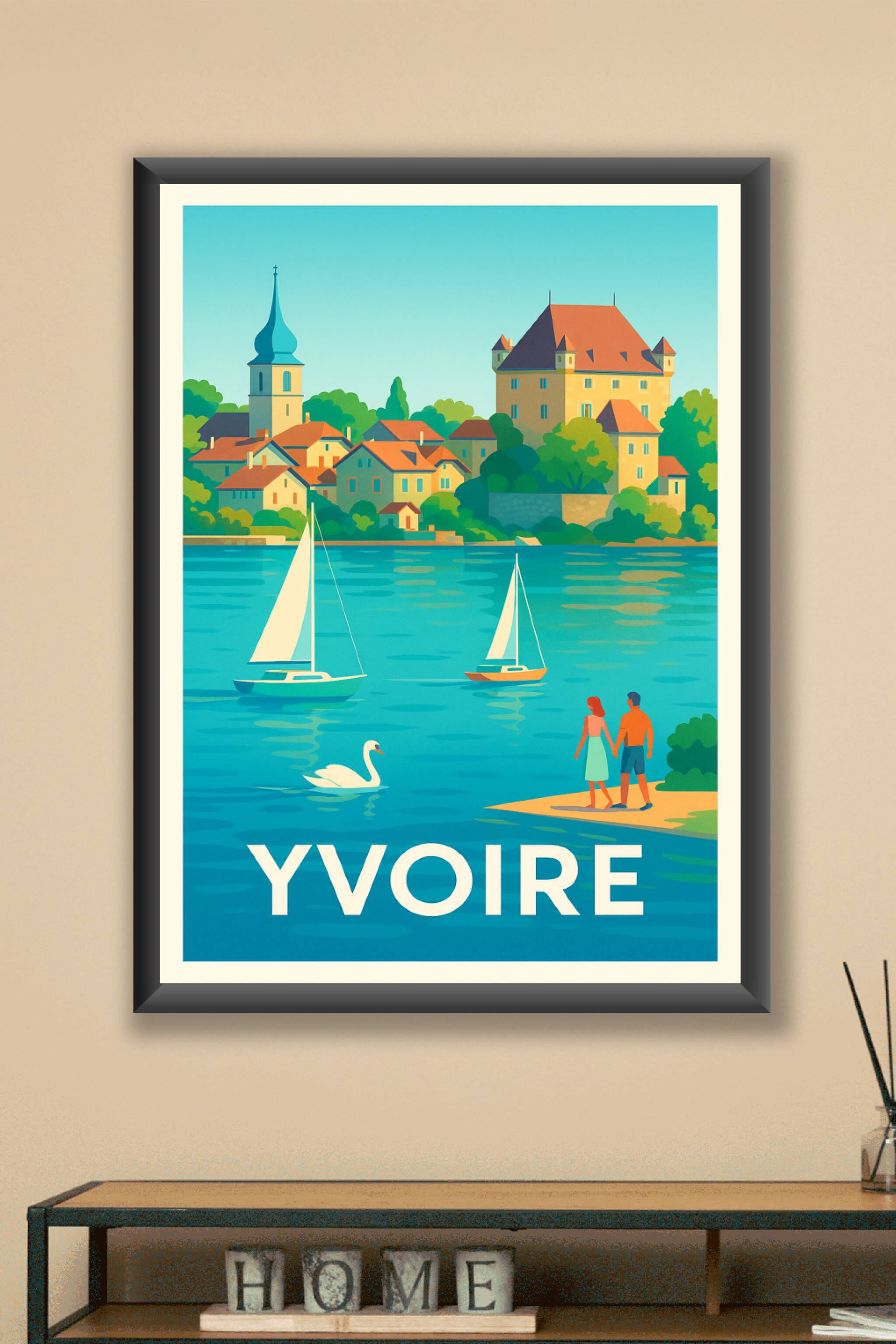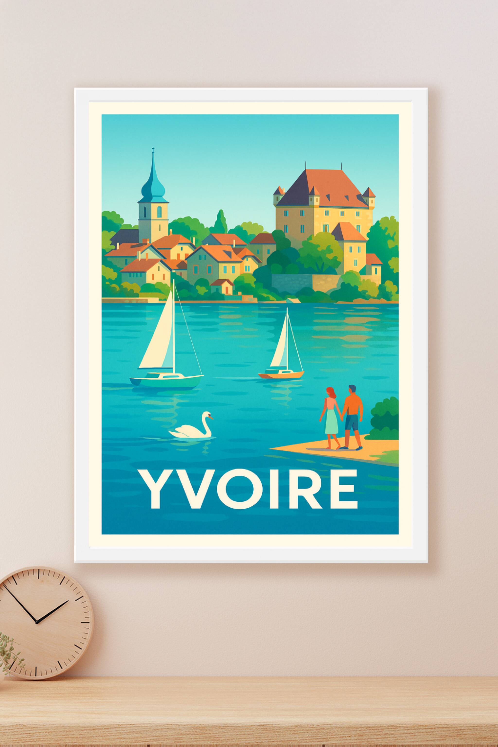 Découvrez l'élégance et la sérénité du village d'Yvoire avec cette affiche estivale évoquant les balades au bord du lac et les voiliers glissant su...