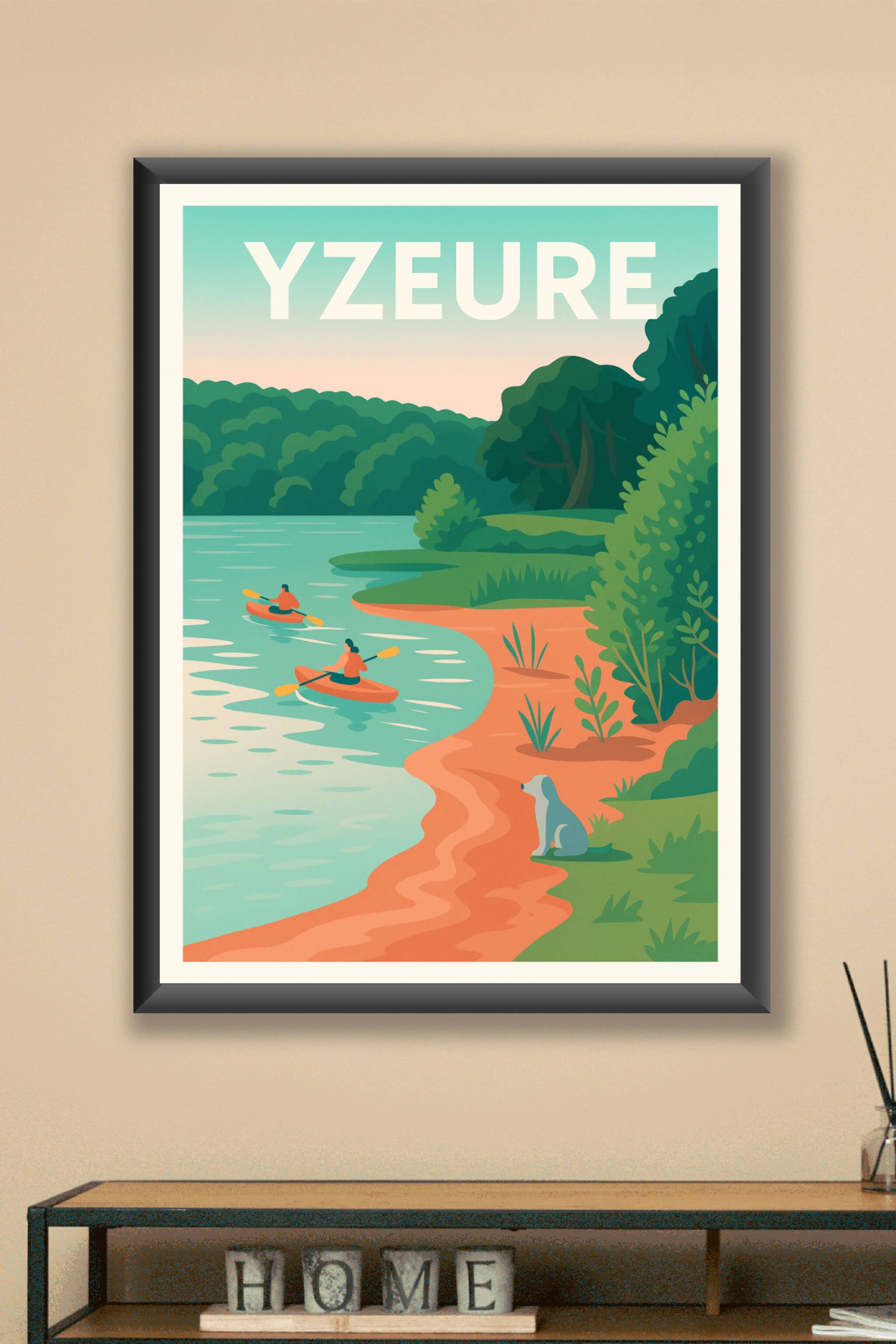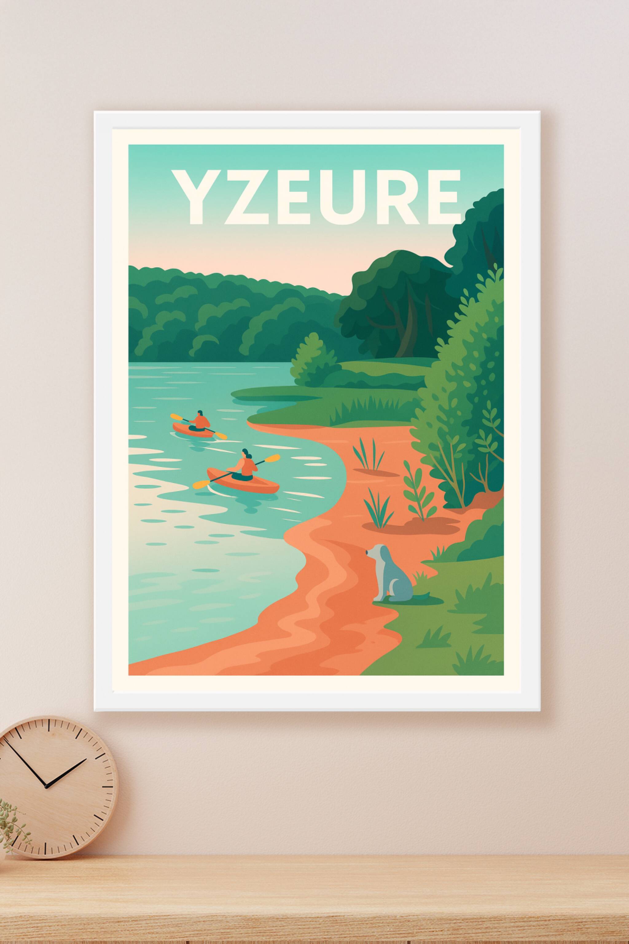 Découvrez la sérénité d'Yzeure à travers cette affiche illustrée qui capture un instant paisible au bord de l'eau, avec des kayaks glissant doucement sur la rivière et un chien contemplant le paysage. Cette poster au style doux et coloré invite à la détente et à la nature dans votre intérieur. Imprimée en tirage "Fine Art" sur un papier 305g coton de haute qualité, cette affiche assure des couleurs éclatantes et une durabilité exceptionnelle. Disponible en formats A1 à A4, avec ou sans cadre, elle est parfaite pour habiller vos murs d'une touche bucolique et authentique. Un choix idéal pour les amoureux des paysages paisibles et des escapades en plein air.