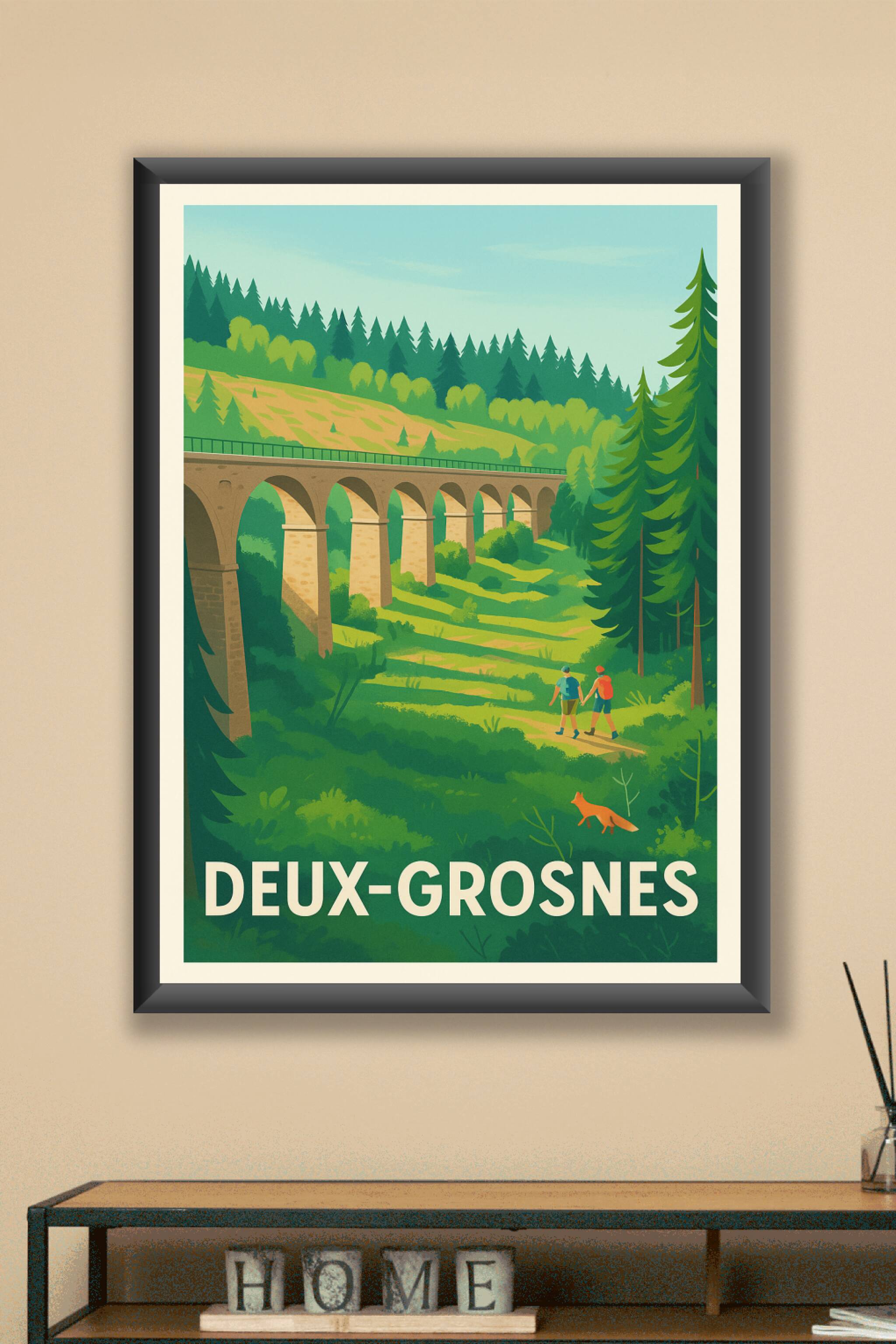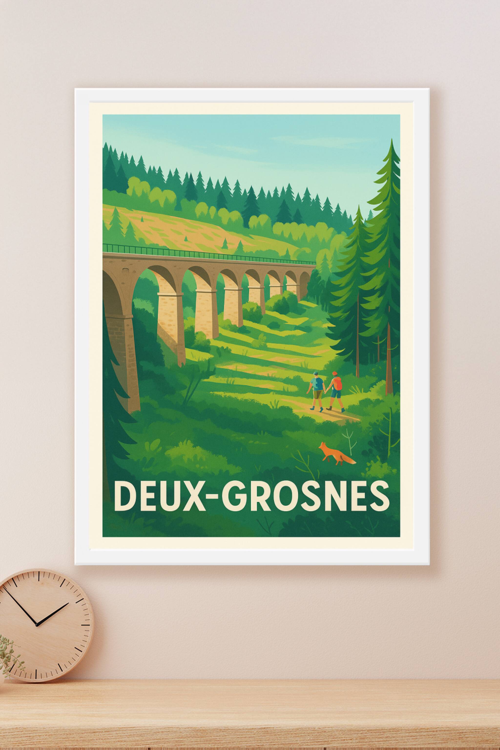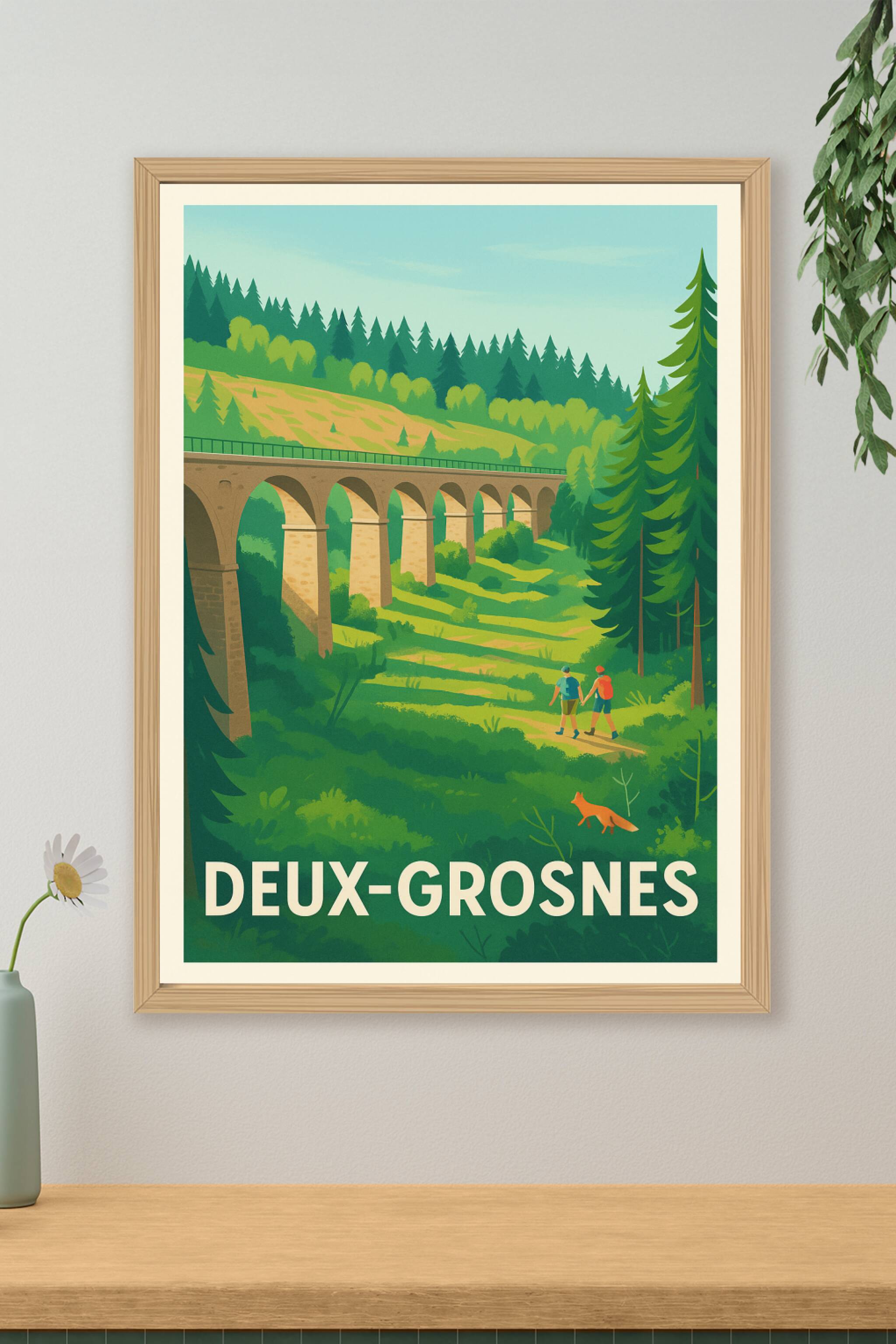 Découvrez la beauté authentique de Deux-Grosnes à travers cette affiche illustrée, mettant en scène un paysage verdoyant et son viaduc emblématique...