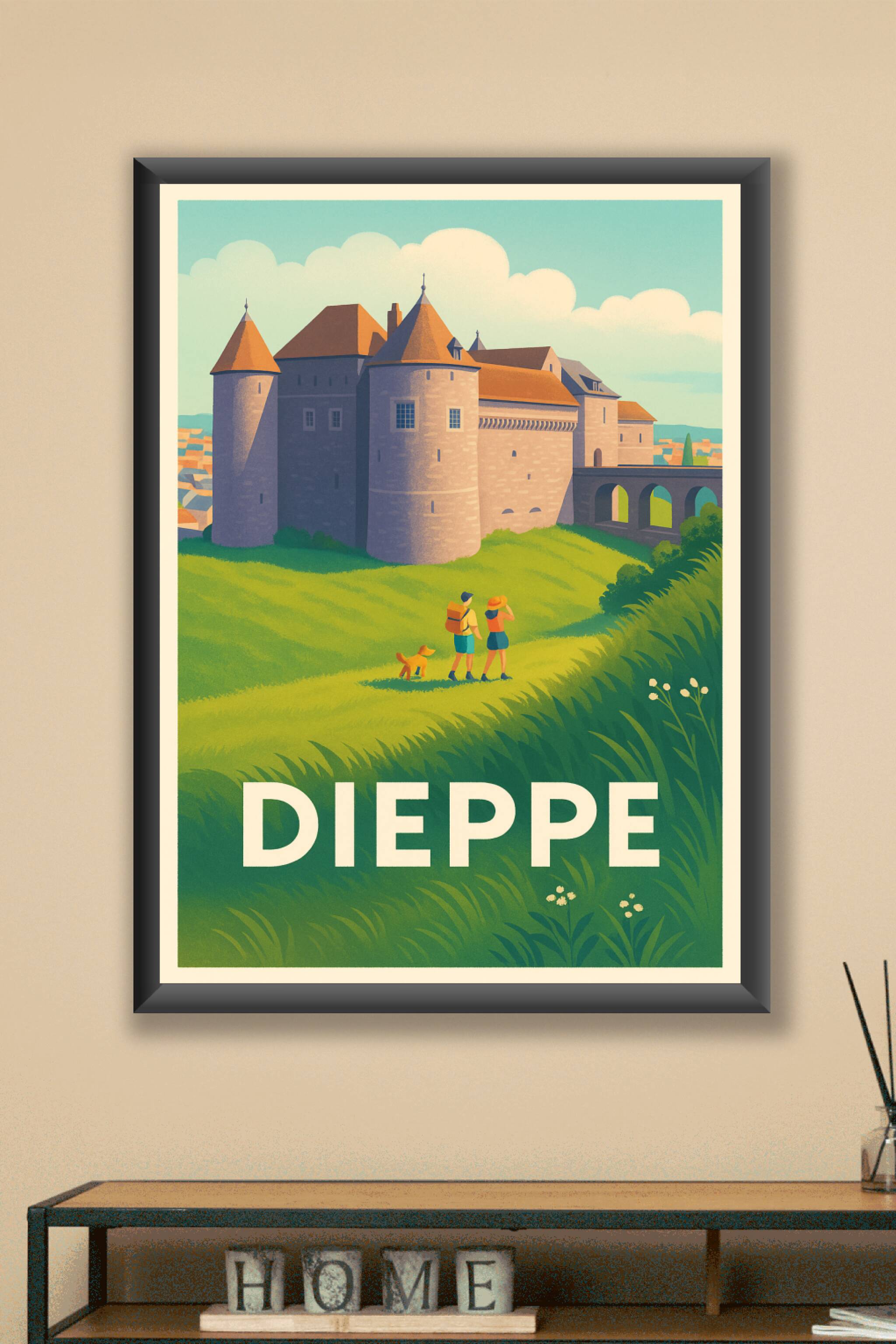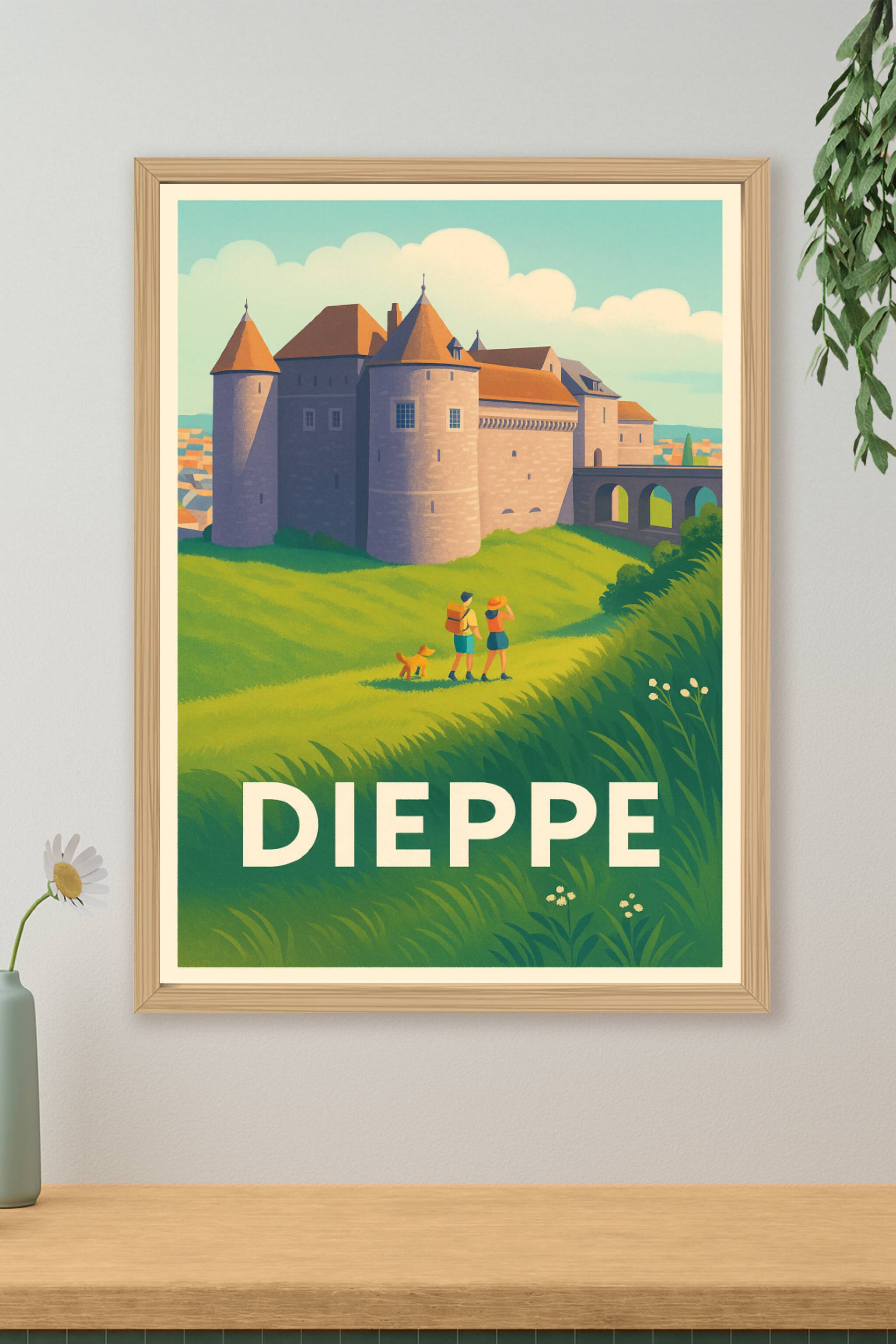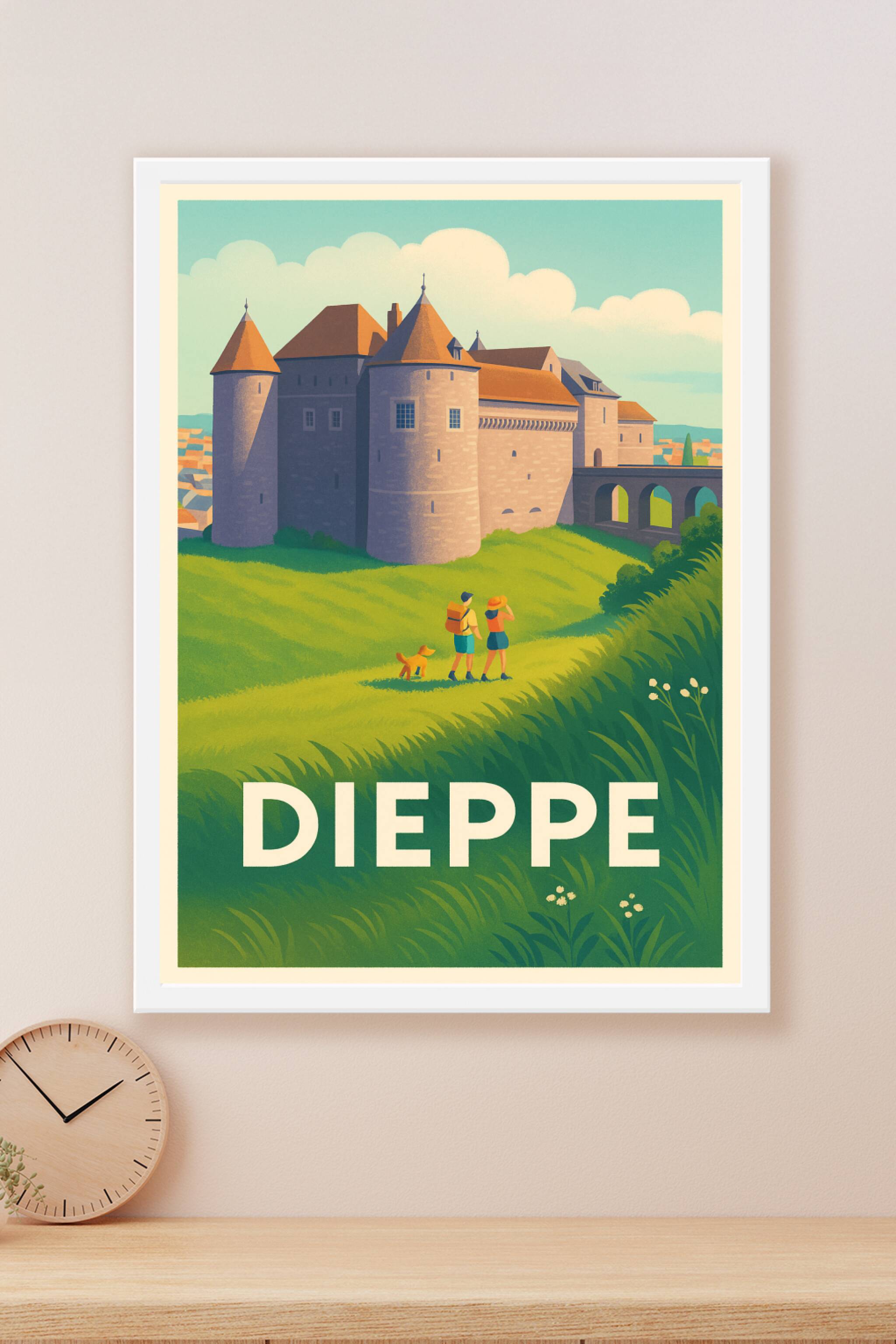 Découvrez l'élégance et le charme authentique de Dieppe à travers cette affiche illustrée mettant en valeur ses toits en tuiles rouges, son église ...