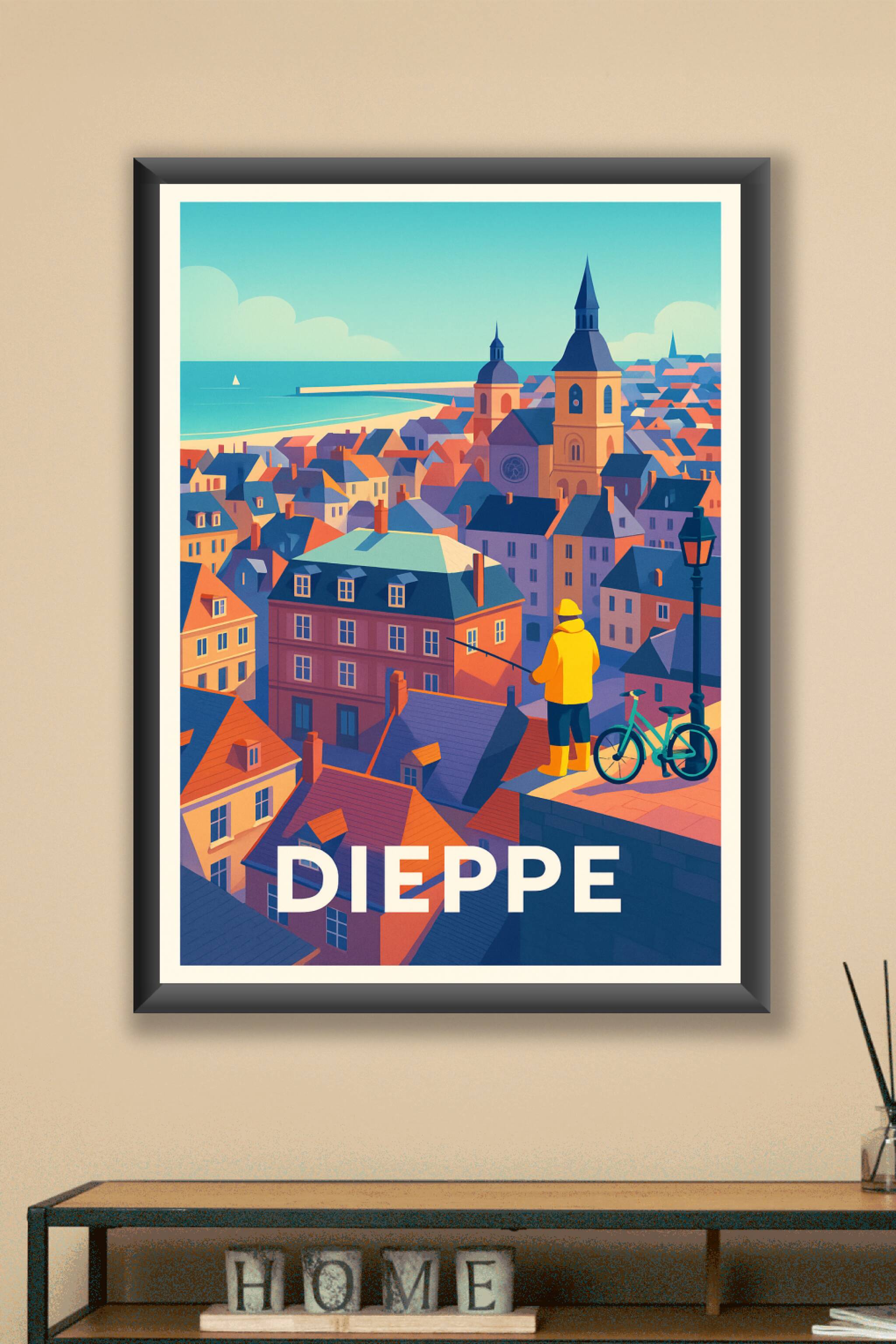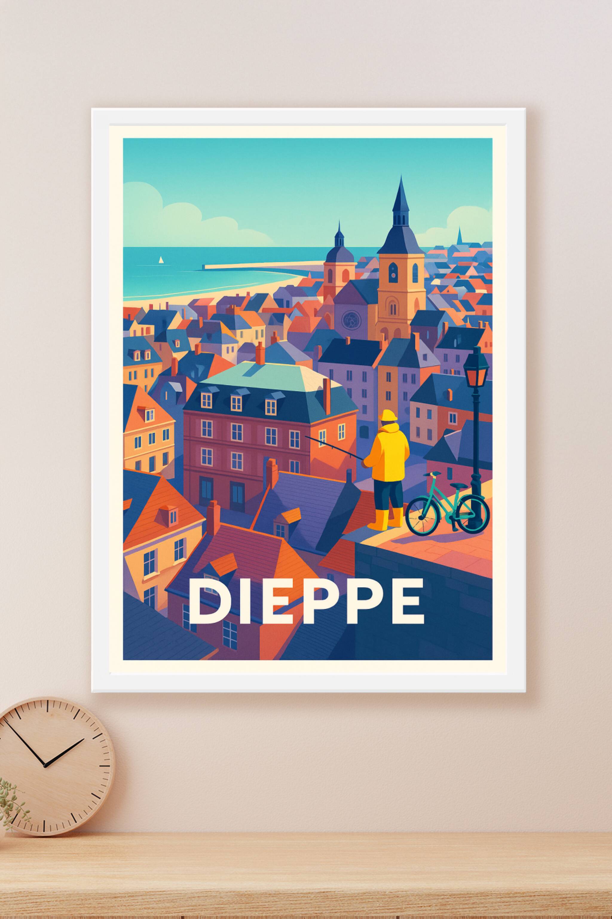 Découvrez l'atmosphère unique de Dieppe à travers cette affiche illustrée qui capture la beauté de ses toits colorés et de son littoral apaisant. Le poster met en scène un pêcheur contemplant la ville, symbole de la tradition maritime locale. Imprimée en tirage "Fine Art" sur papier 305g coton, cette affiche garantit une qualité d'impression exceptionnelle avec des couleurs vives et durables. Disponible en formats A1 à A4, avec ou sans cadre, ce poster est idéal pour apporter une touche d'élégance normande à votre intérieur. Profitez d'une production 100% française et offrez à votre décoration un souvenir artistique et authentique de Dieppe.