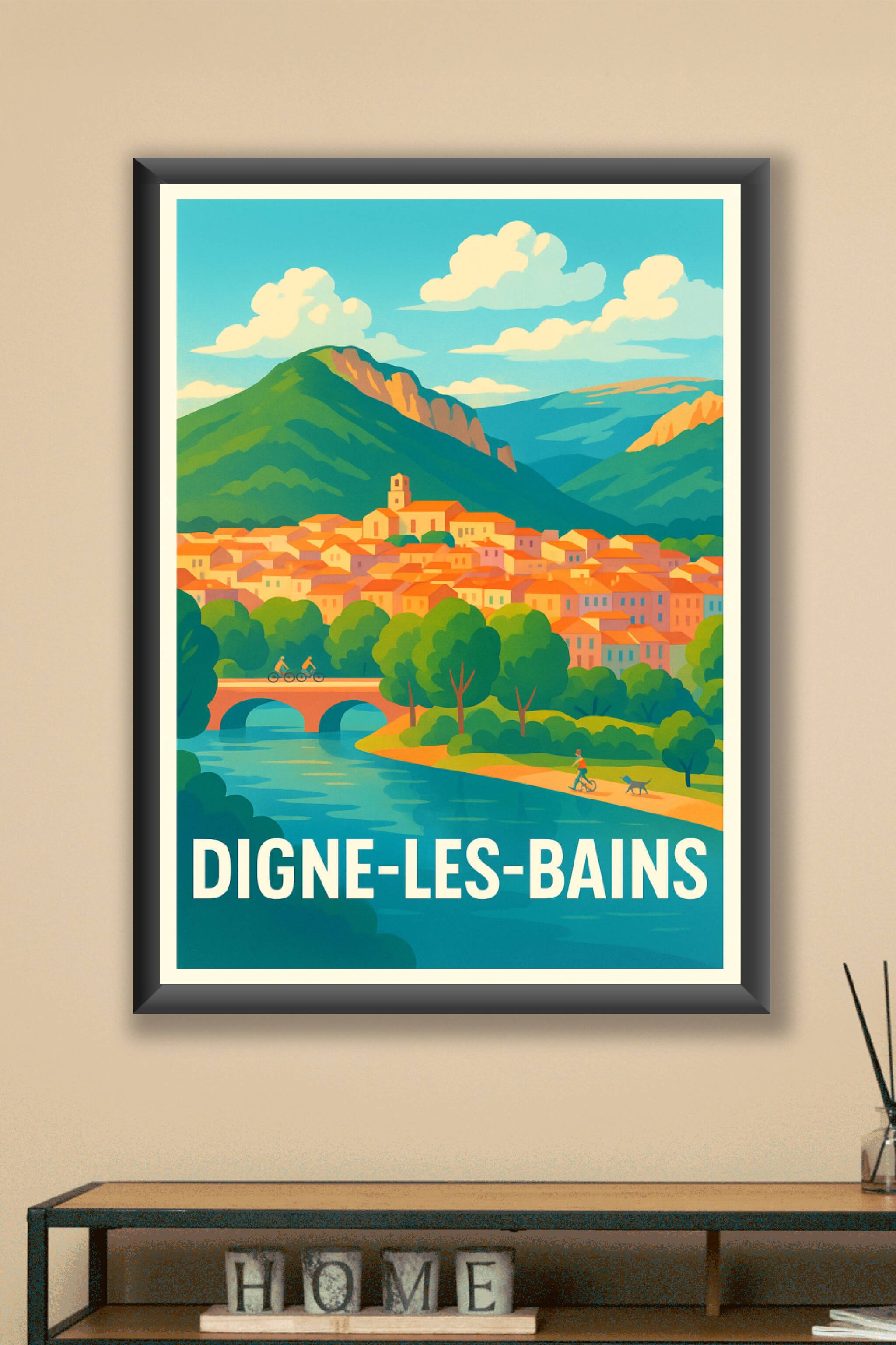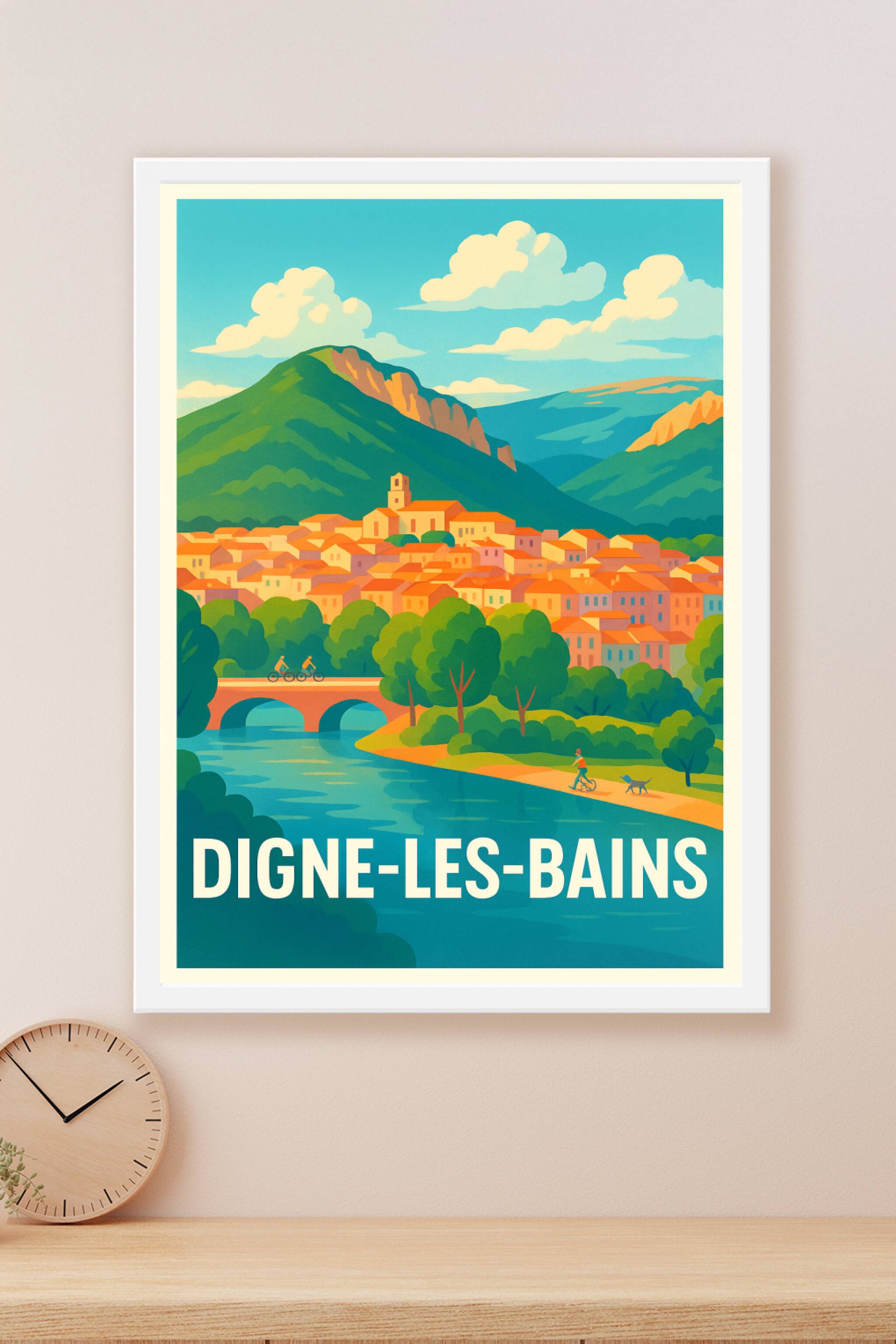 Découvrez l'atmosphère paisible et colorée de Digne-les-Bains avec cette affiche illustrée, qui capture la beauté authentique de cette ville nichée au pied des montagnes. Le village aux toits orangés se mêle harmonieusement à la nature environnante, avec une rivière tranquille et des cyclistes qui évoquent une ambiance de sérénité et de détente.Ce poster est disponible en tirage "Fine Art" sur papier 305g coton, garantissant une qualité d'impression exceptionnelle et des couleurs durables. Choisissez parmi les formats A1 à A4, avec ou sans cadre, pour une décoration qui apportera chaleur et authenticité à votre intérieur. Fabriqué en France, ce poster est une invitation à plonger dans le charme unique de Digne-les-Bains.