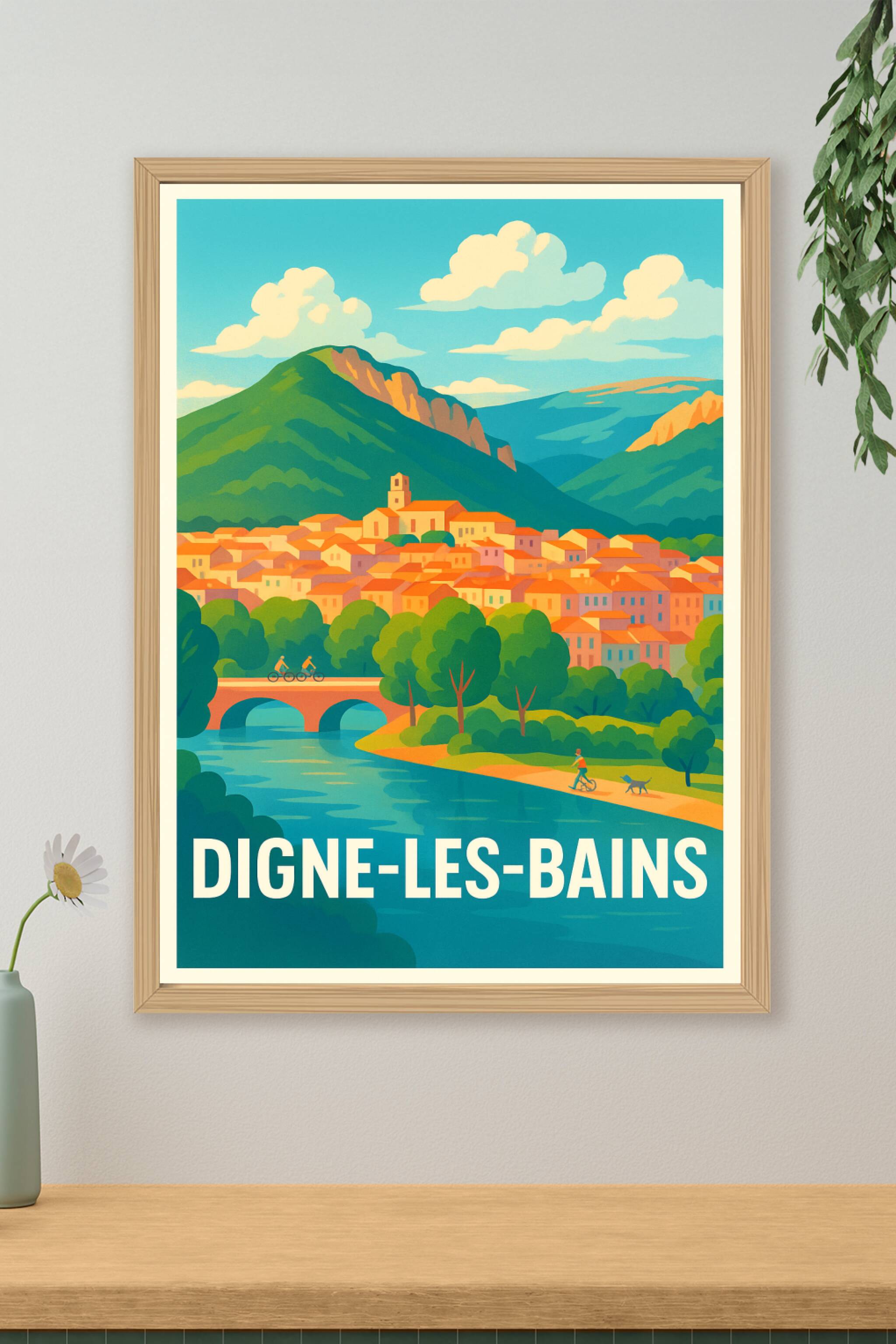 Découvrez l'atmosphère paisible et colorée de Digne-les-Bains avec cette affiche illustrée, qui capture la beauté authentique de cette ville nichée...