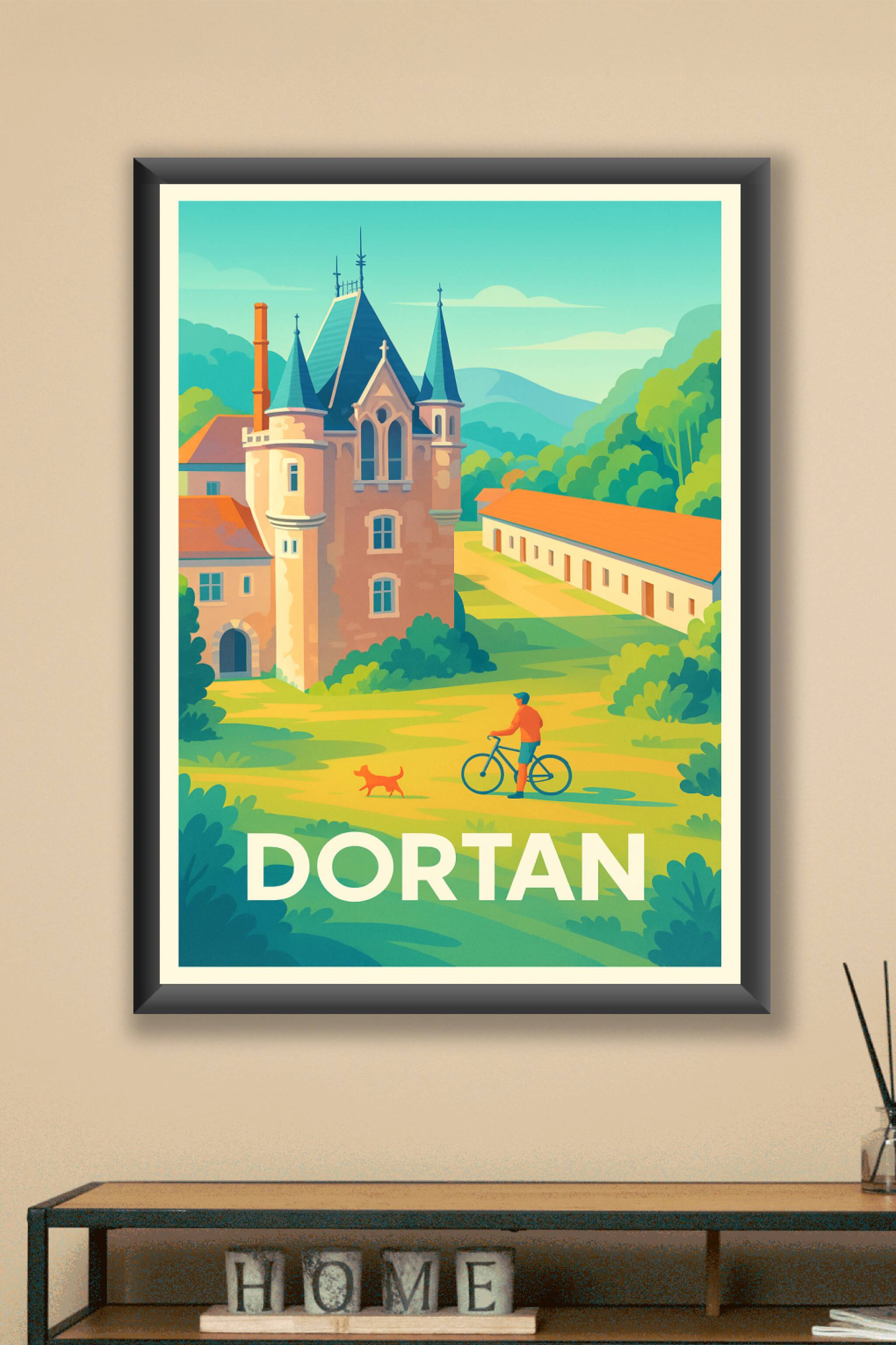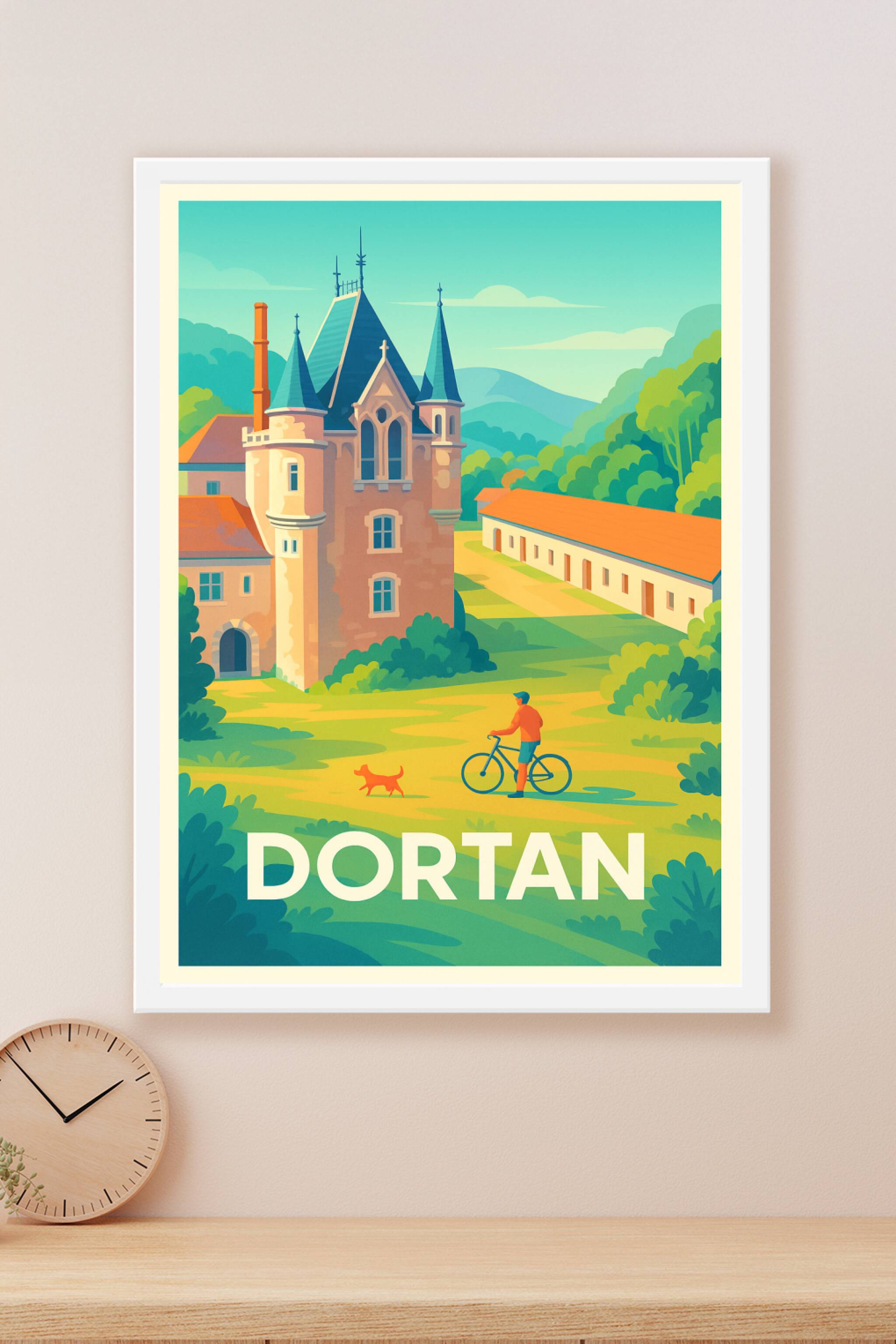 Découvrez l'atmosphère paisible de Dortan avec cette affiche élégante illustrant un château au charme d'antan, entouré de verdure et baigné d'une l...