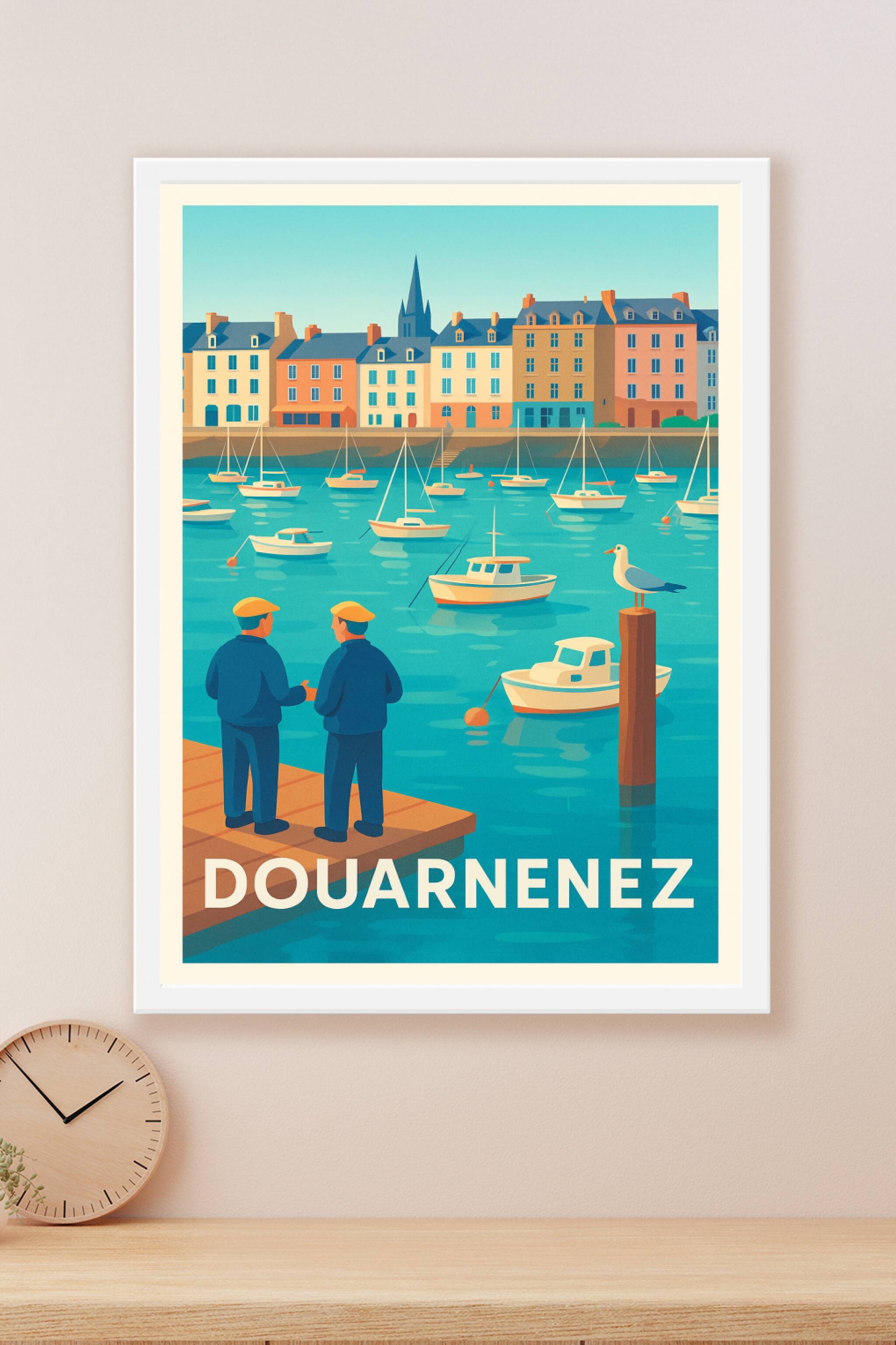 Découvrez l'élégance et la tranquillité du port de Douarnenez avec cette affiche au style rétro et illustration soignée. Les bateaux amarrés, les maisons colorées et les deux personnages en pleine discussion sur le quai créent une atmosphère paisible typique de cette charmante ville bretonne. Ce poster est imprimé en tirage "Fine Art" sur papier 305g coton, garantissant une qualité d'impression exceptionnelle et des couleurs profondes. Disponible en formats A1 à A4, avec ou sans cadre, cette affiche est idéale pour apporter une touche d'authenticité et de douceur maritime à votre décoration intérieure. Profitez d'une impression premium 100% fabriquée en France pour offrir ou embellir votre espace avec ce souvenir unique de Douarnenez.