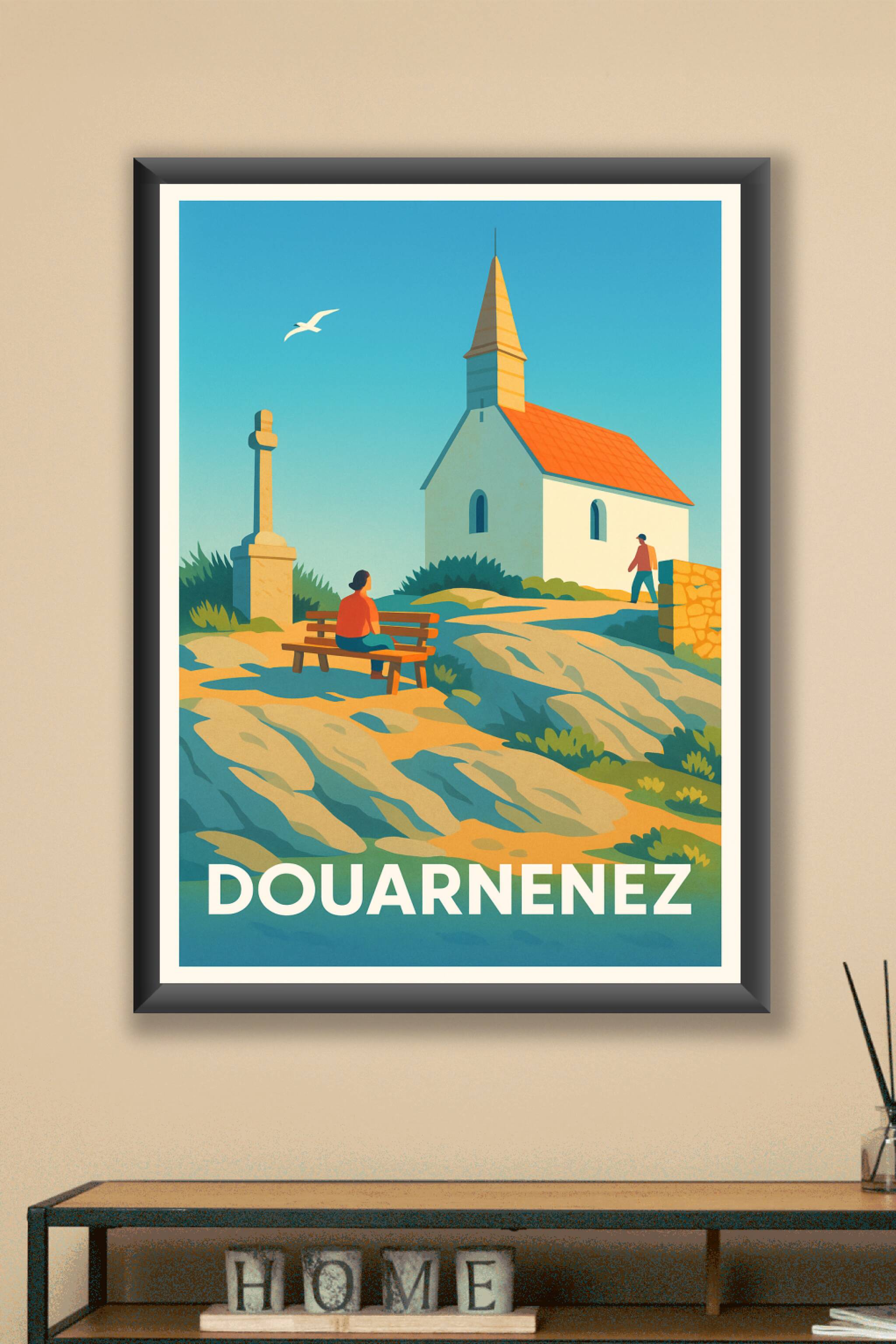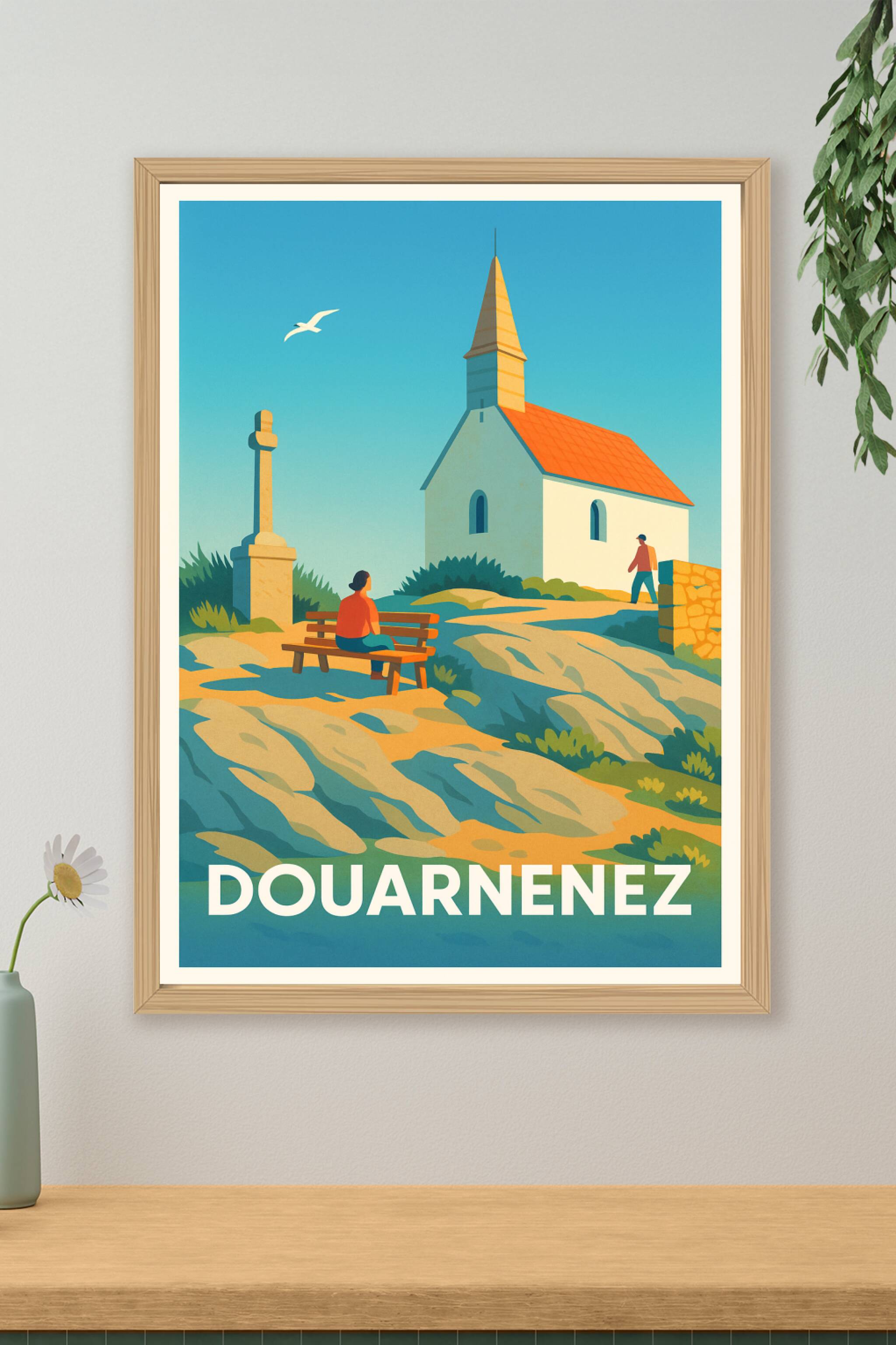 Découvrez la sérénité de Douarnenez avec cette affiche au style vintage, mettant en scène un paysage typique de la Bretagne, entre ciel lumineux, r...