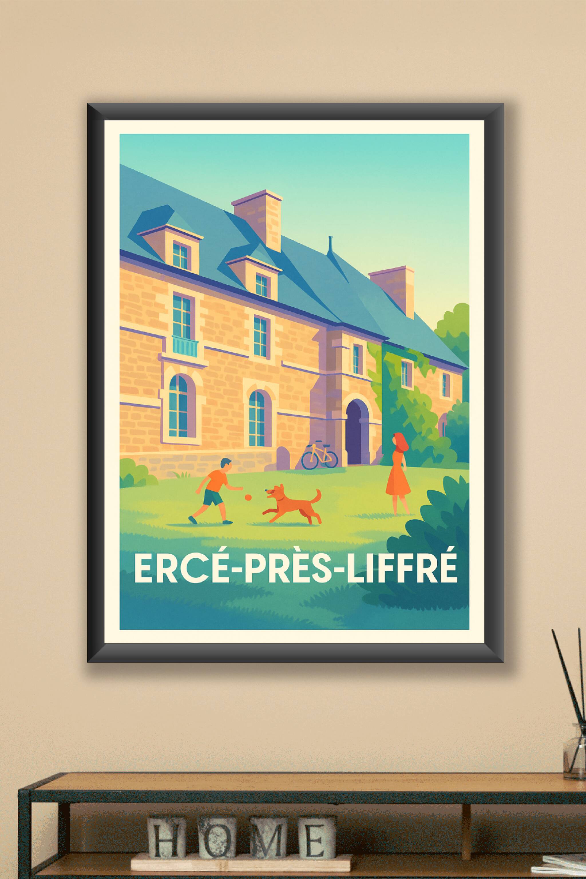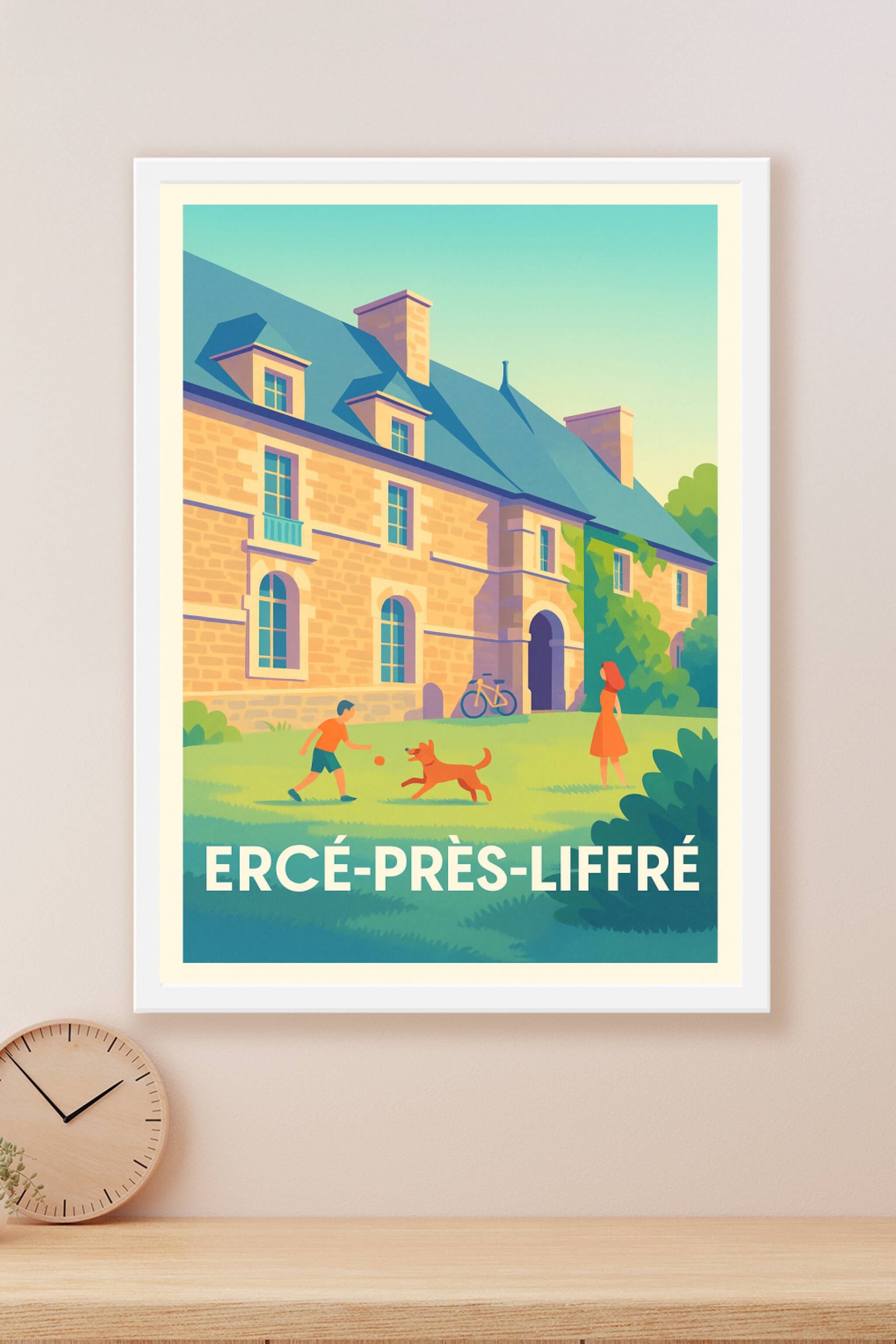 Découvrez le charme paisible d'Ercé-Près-Liffré à travers cette affiche illustrée pleine de douceur et de lumière. La scène bucolique met en valeur...