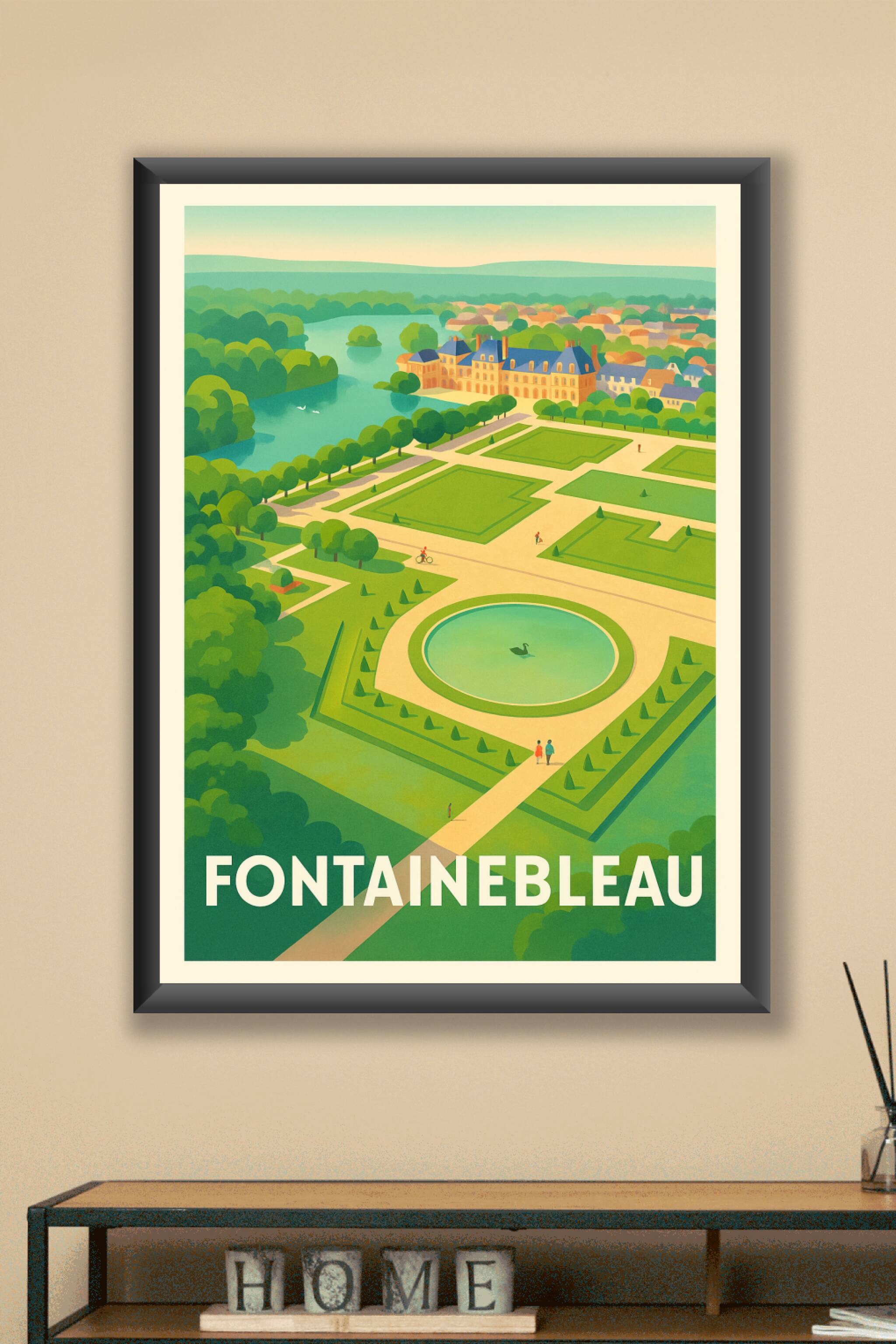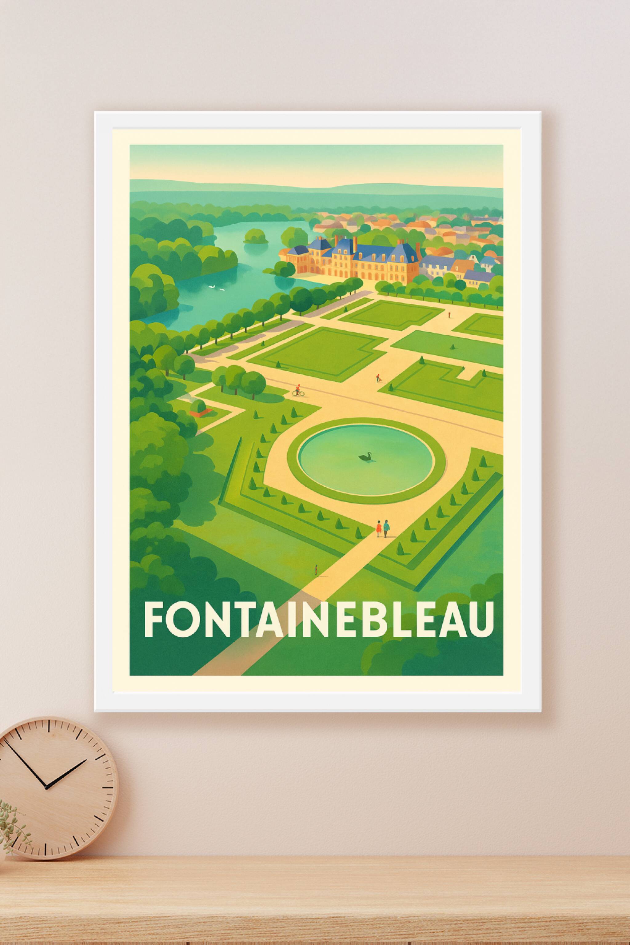 Découvrez la beauté intemporelle du château de Fontainebleau et ses jardins somptueux avec cette affiche illustrée aux couleurs douces et apaisante...