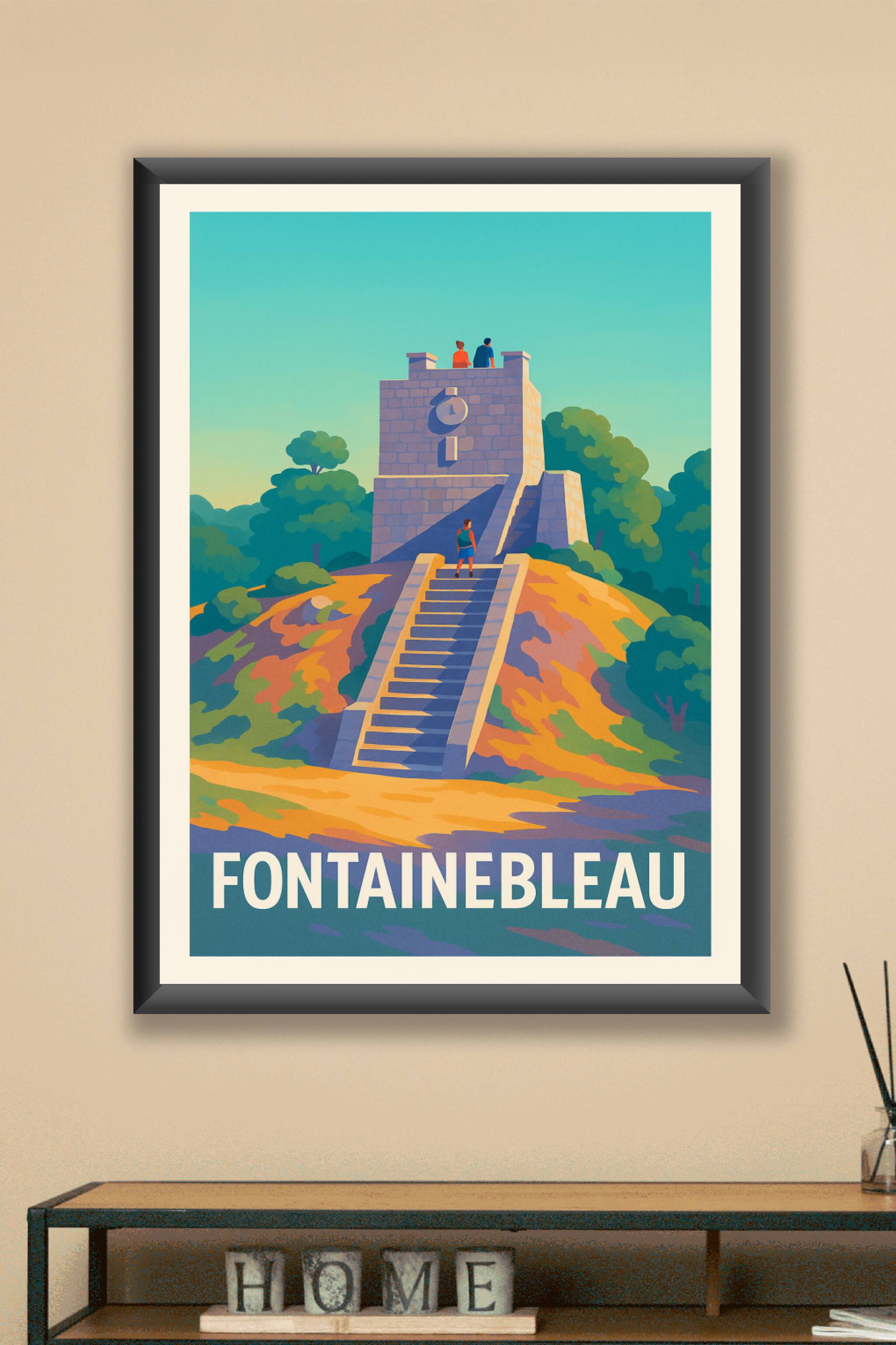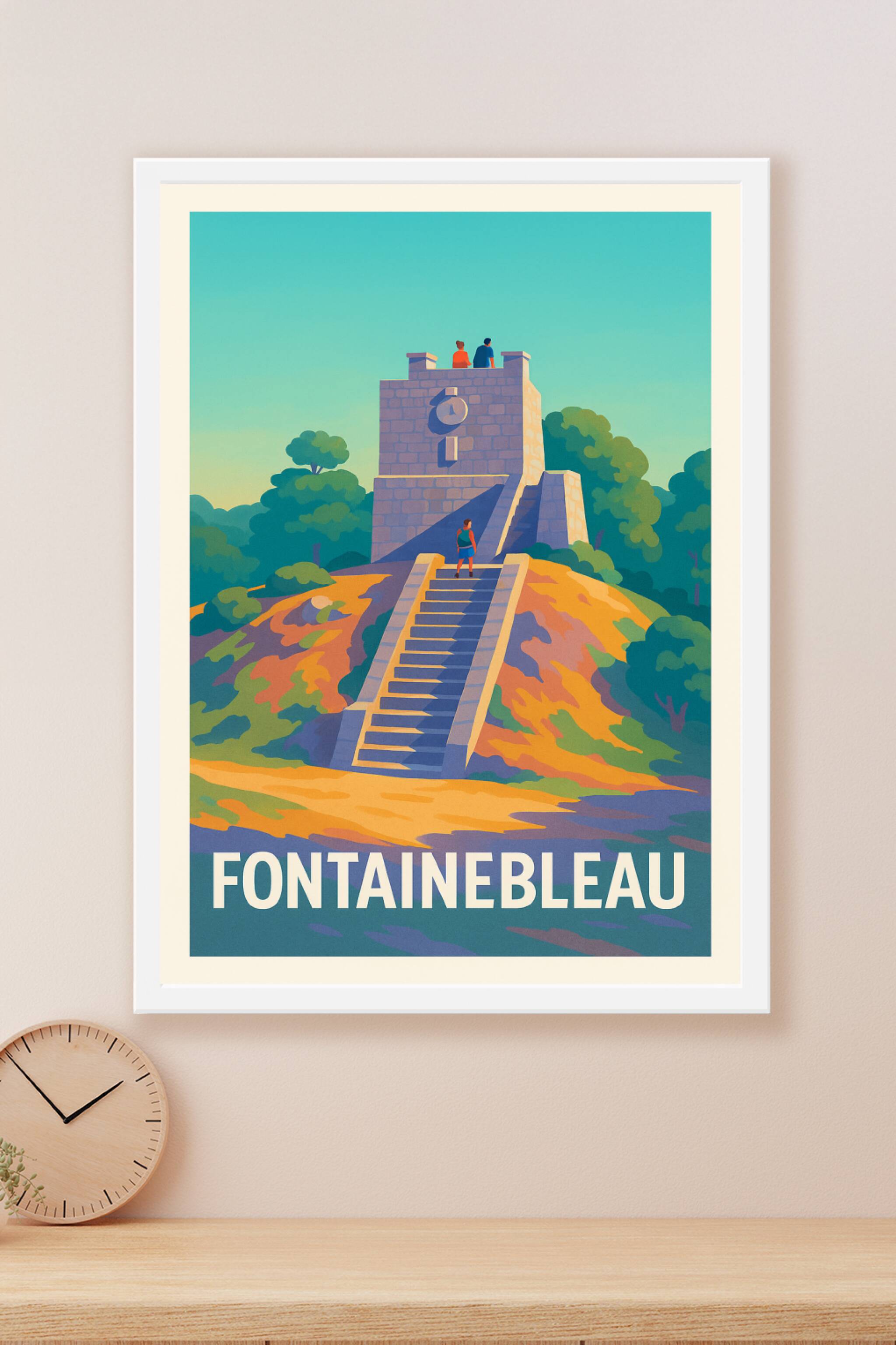 Découvrez cette magnifique affiche représentant la tour emblématique de Fontainebleau, perchée au sommet d'une colline ensoleillée. Son style color...