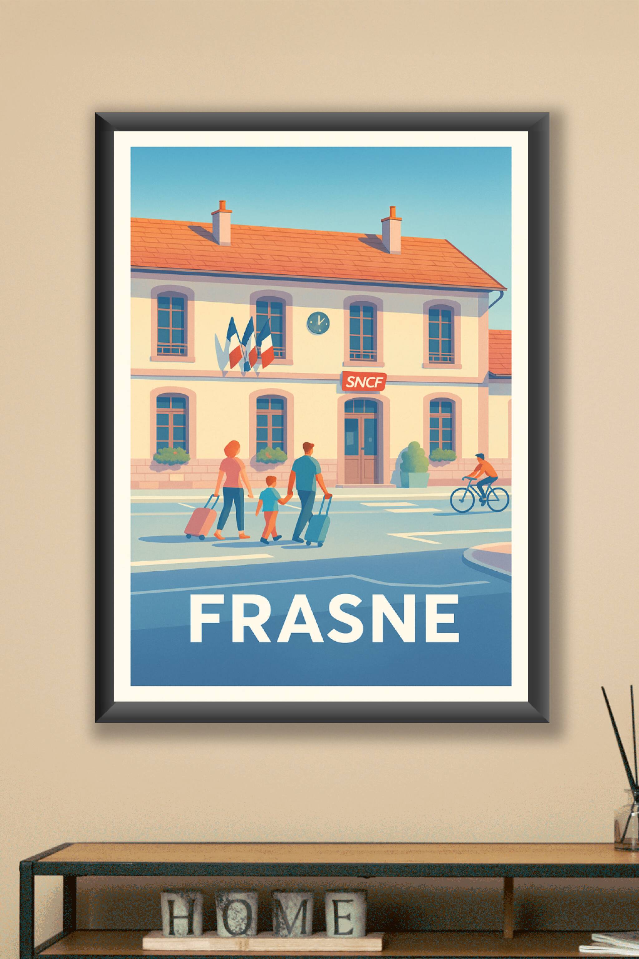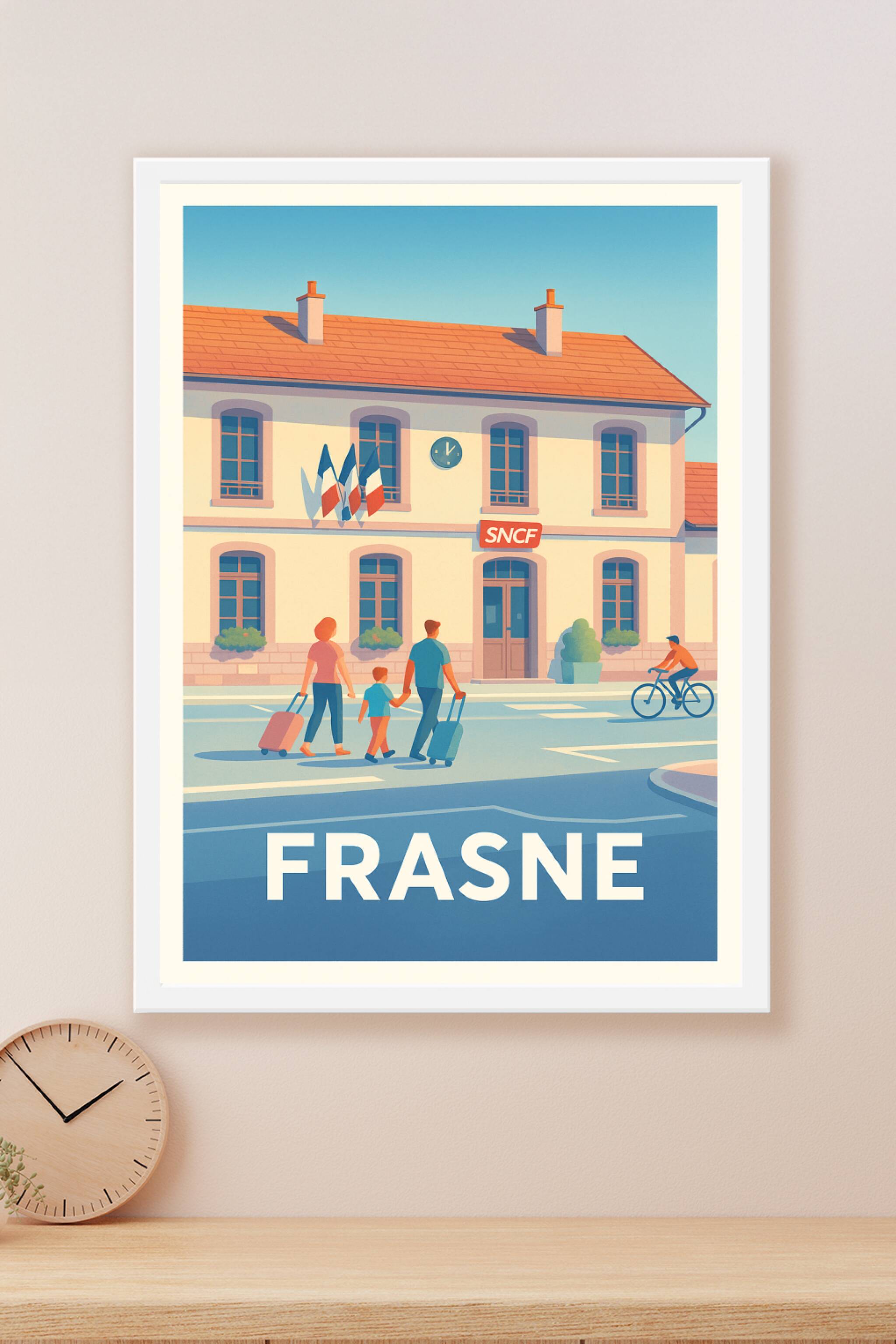 Découvrez l'atmosphère sereine et familiale de la gare de Frasne avec cette affiche au design épuré et lumineux. Un poster qui capture un instant d...