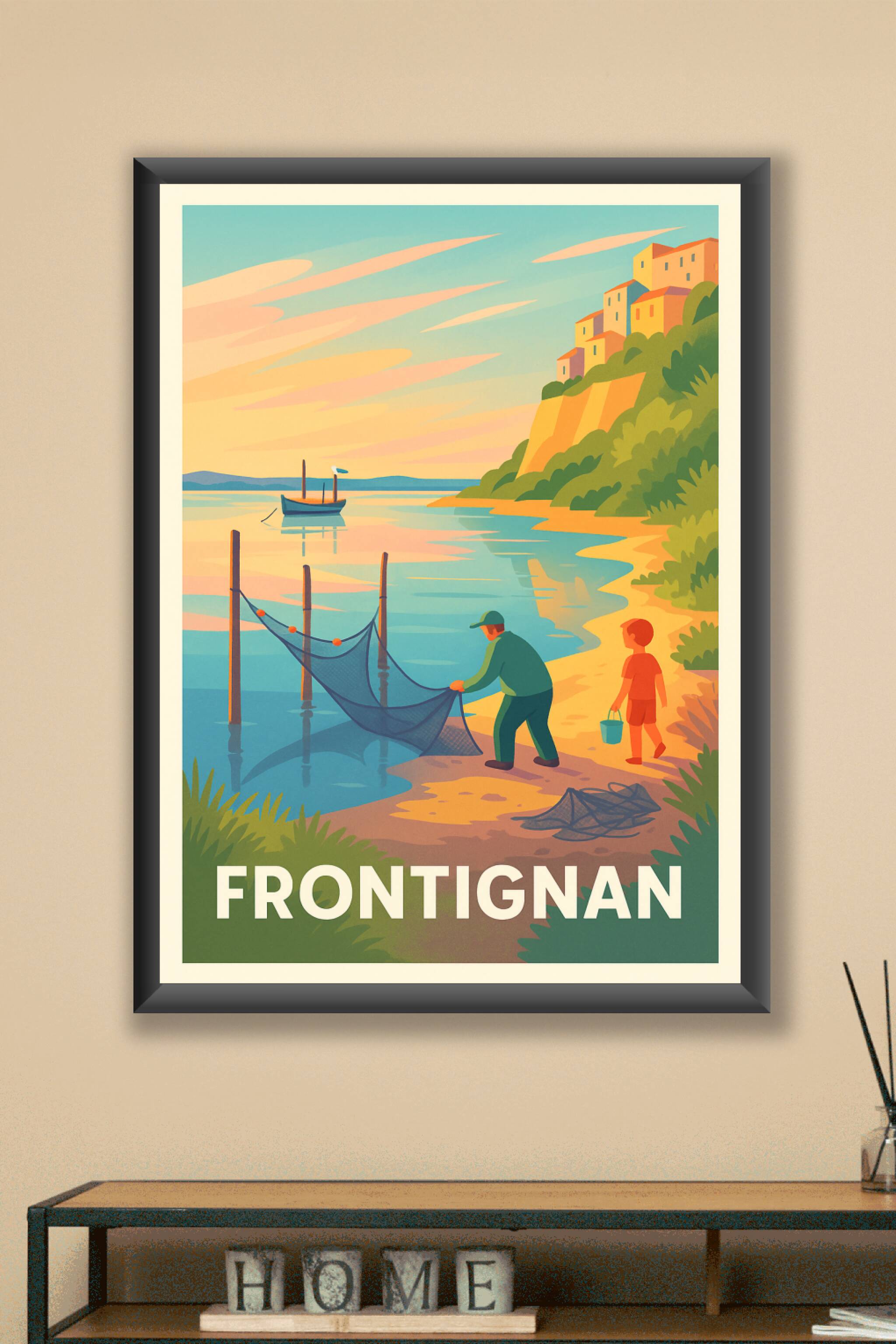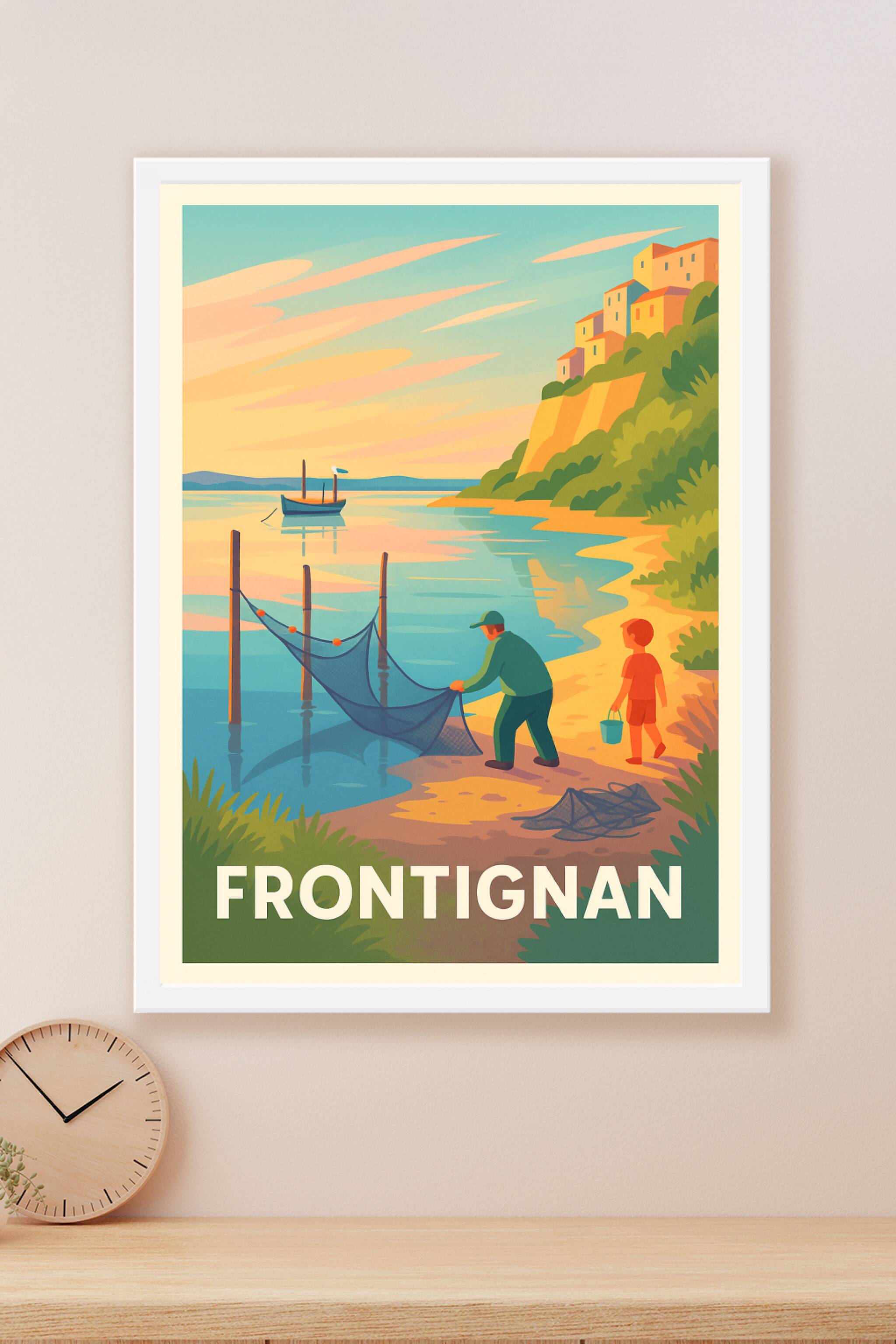 Découvrez la douce quiétude de Frontignan avec cette affiche illustrée représentant un pêcheur et un enfant au bord de l'étang, sous un coucher de ...