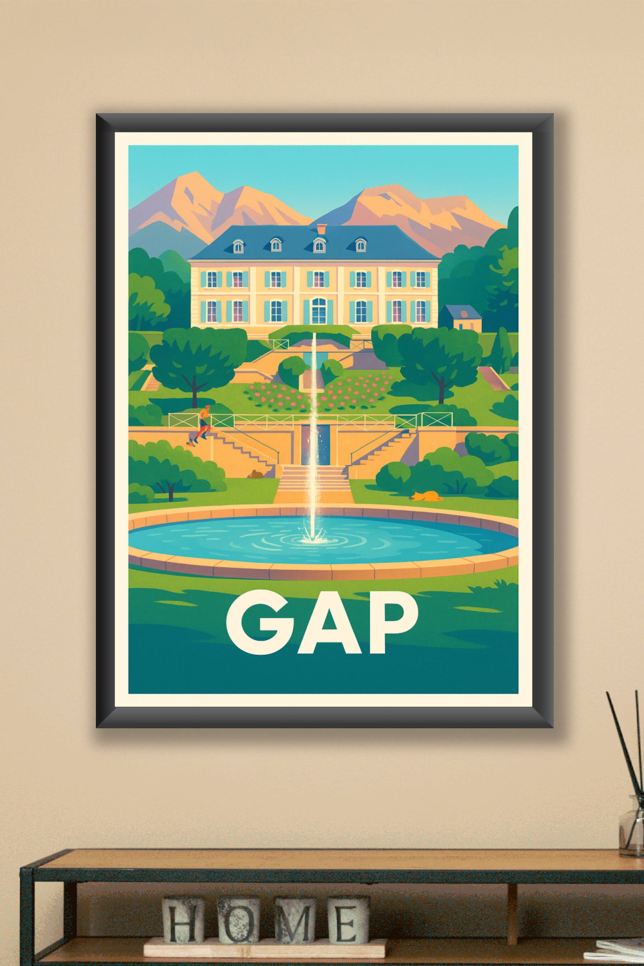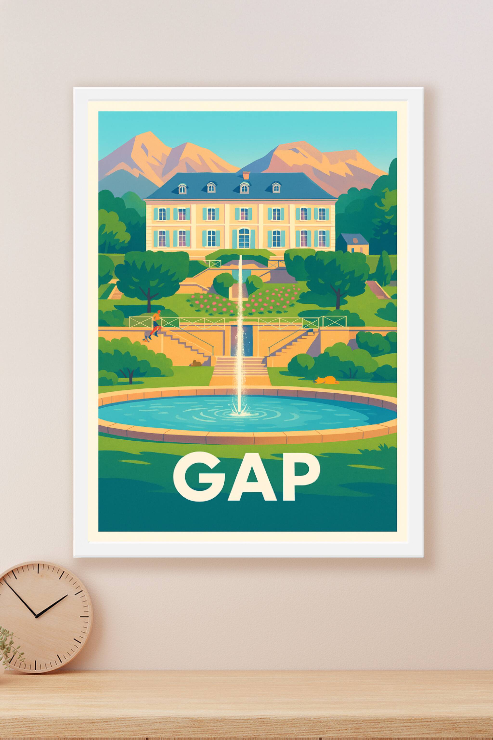 Découvrez l'atmosphère paisible de Gap avec cette affiche illustrée mettant en scène une magnifique demeure entourée de jardins somptueux et d'une ...