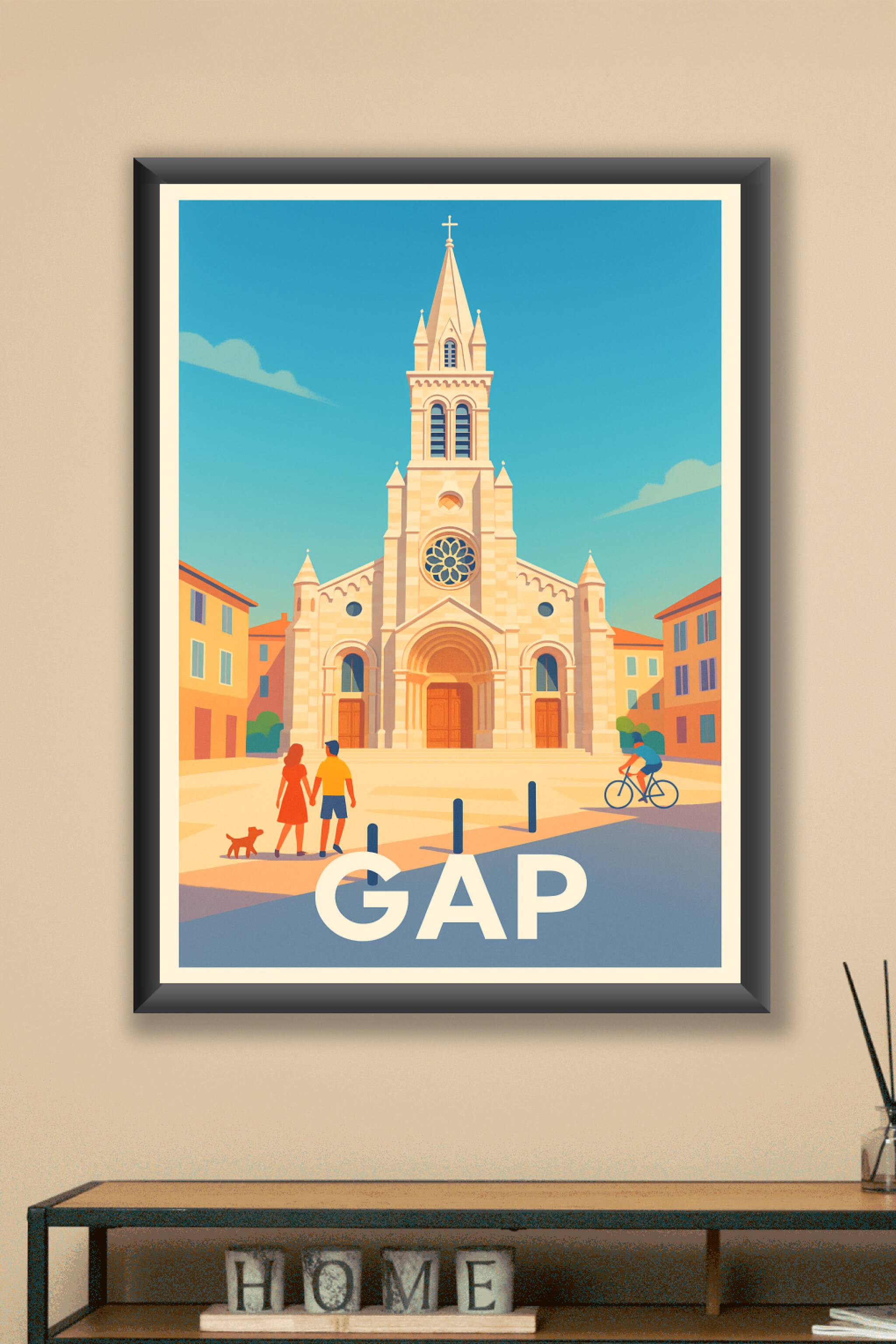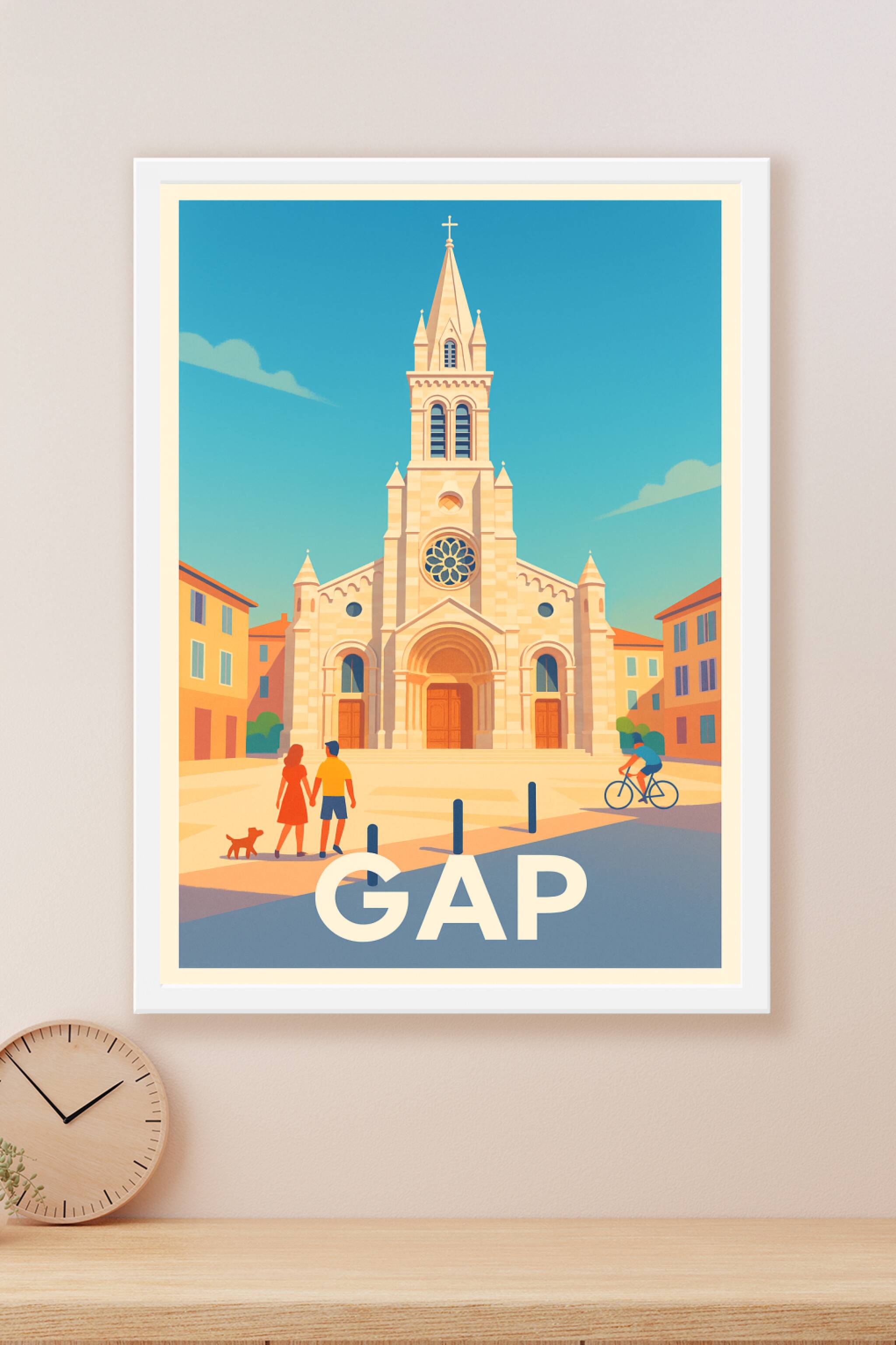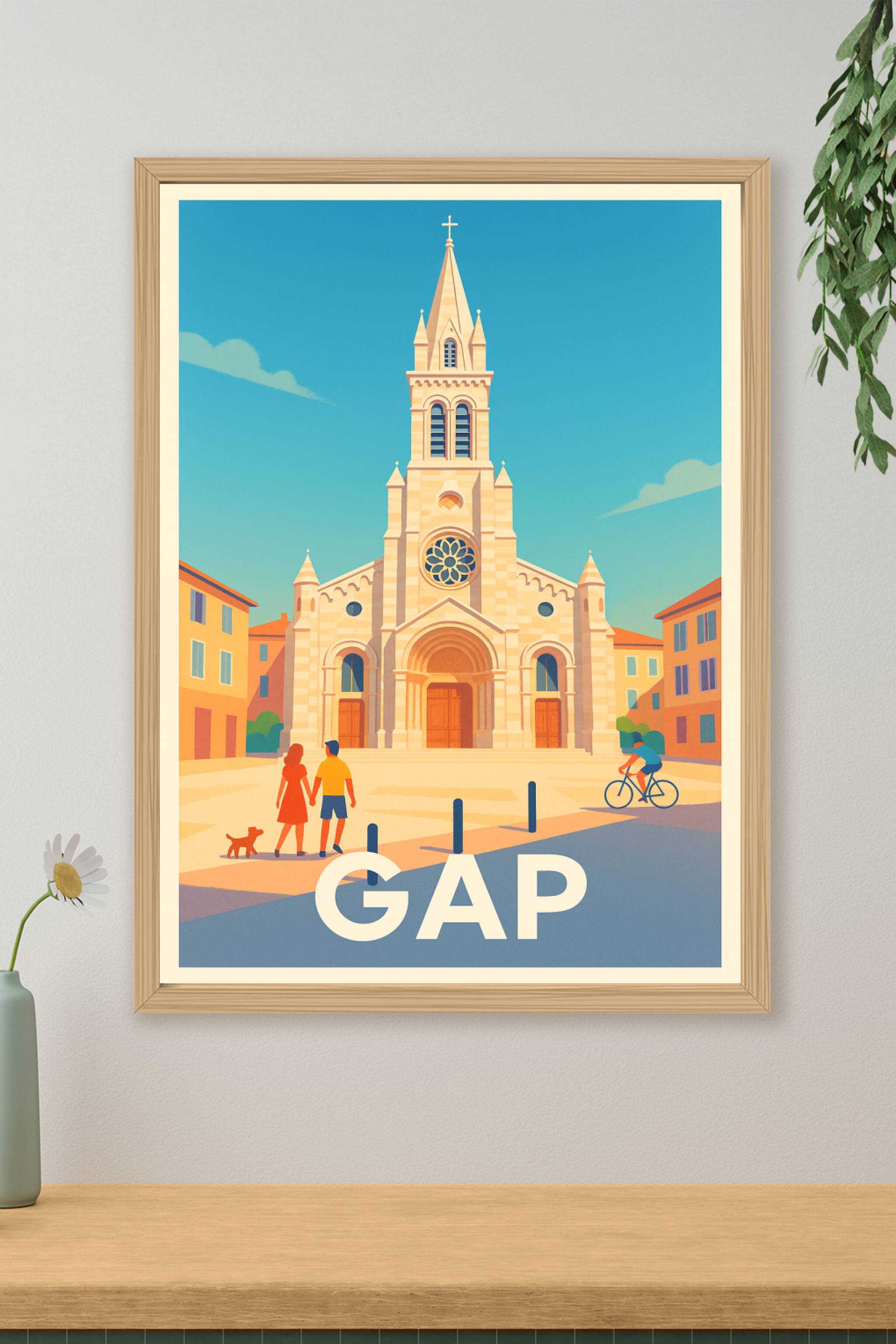 Découvrez le charme authentique de Gap avec cette affiche illustrée mettant en valeur son architecture historique sous un ciel d'azur. Ce poster év...