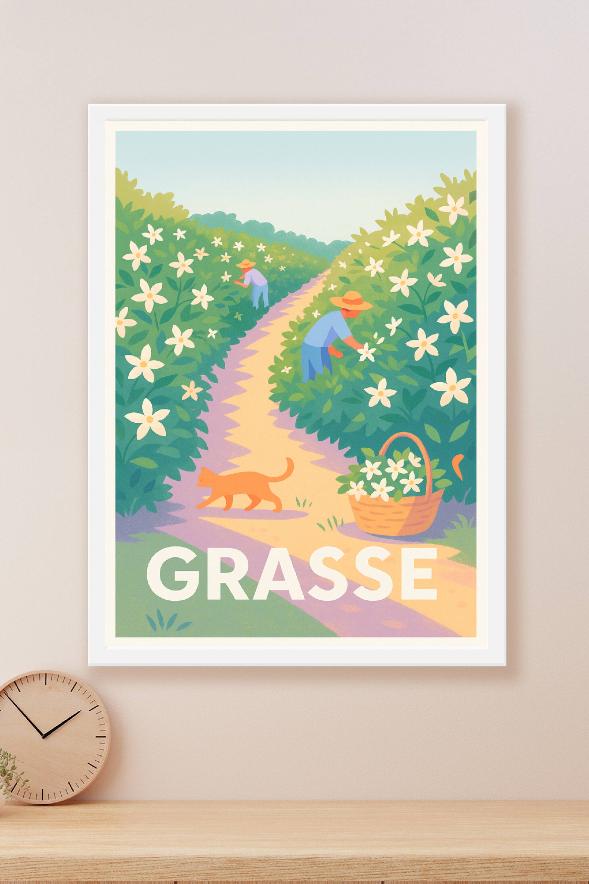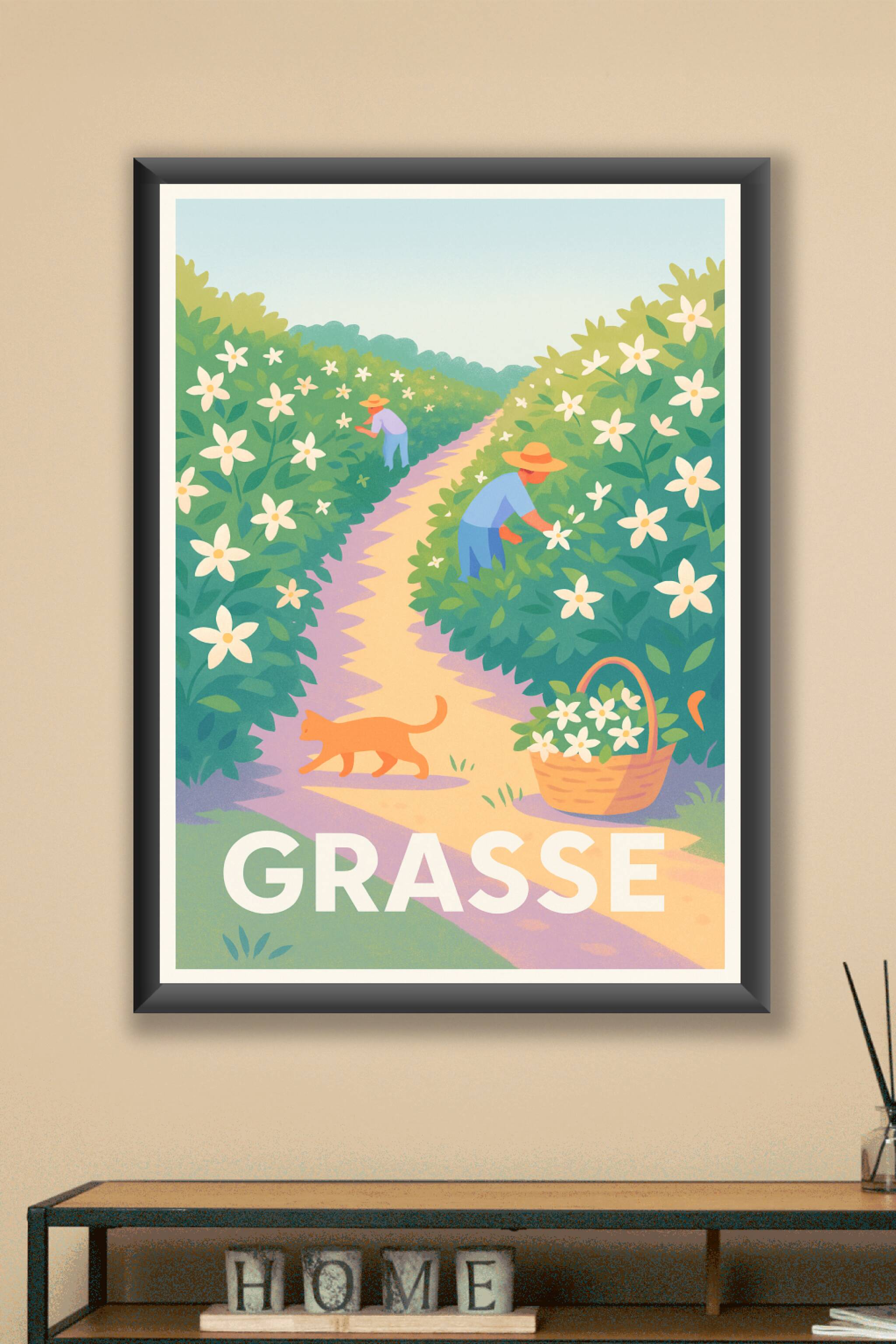 Découvrez la douceur et la sérénité de Grasse, capitale mondiale du parfum, avec cette affiche illustrée aux teintes pastel et à l'ambiance champêt...