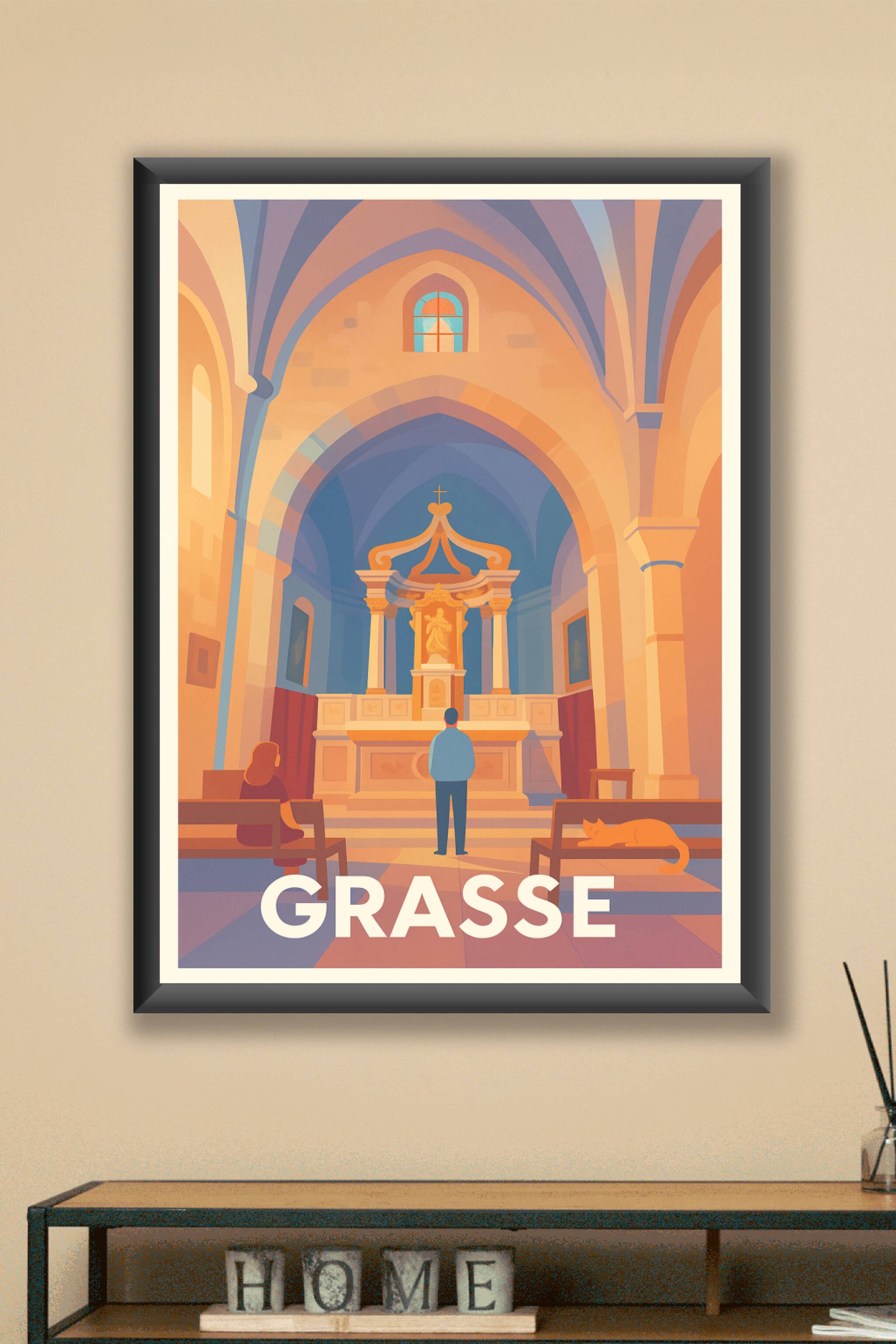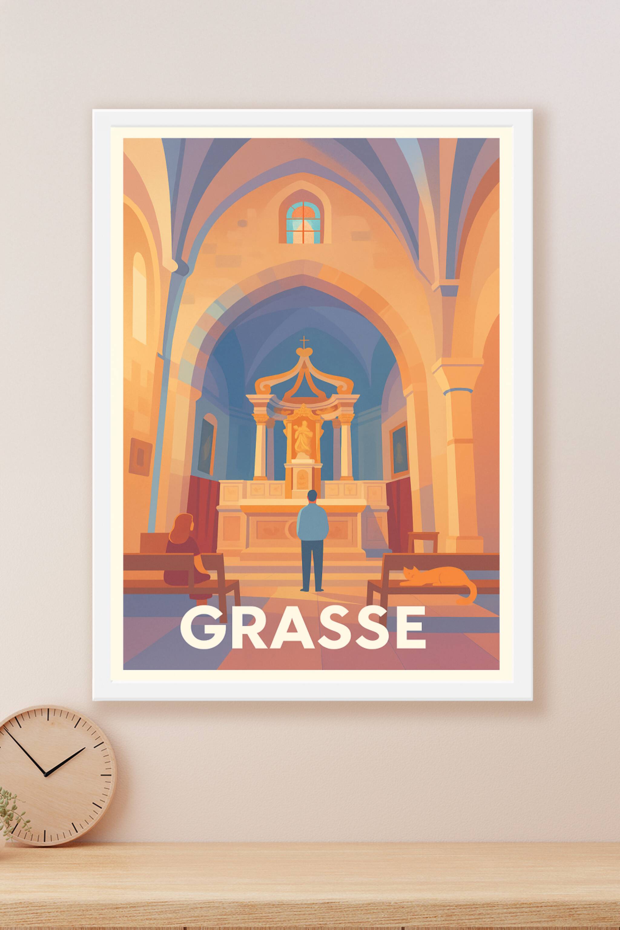 Découvrez l'atmosphère unique de Grasse avec cette affiche illustrée qui capture la douce lumière et l'architecture paisible d'un lieu sacré de la ...