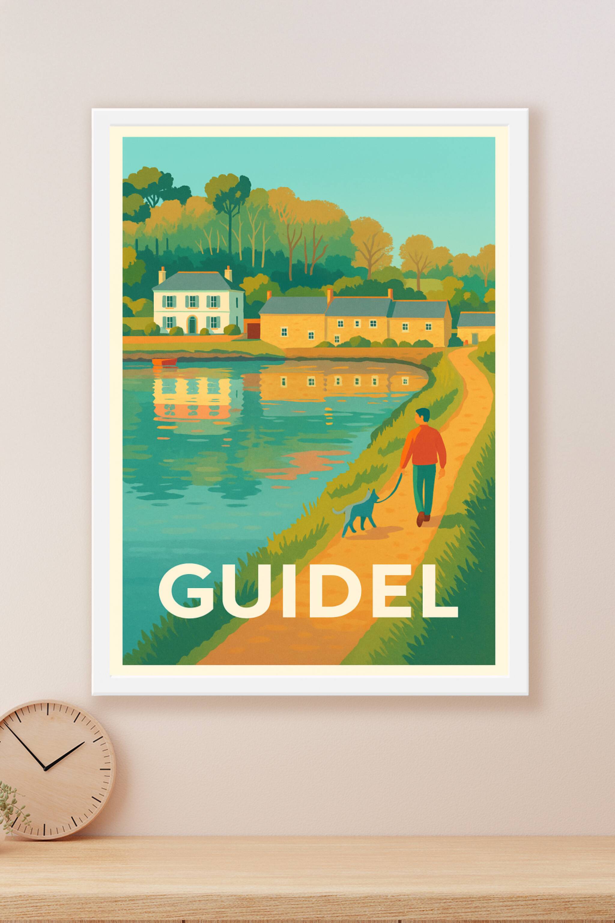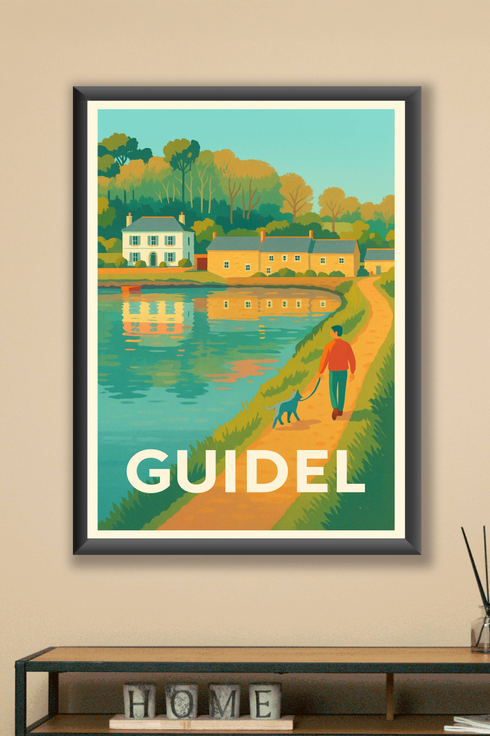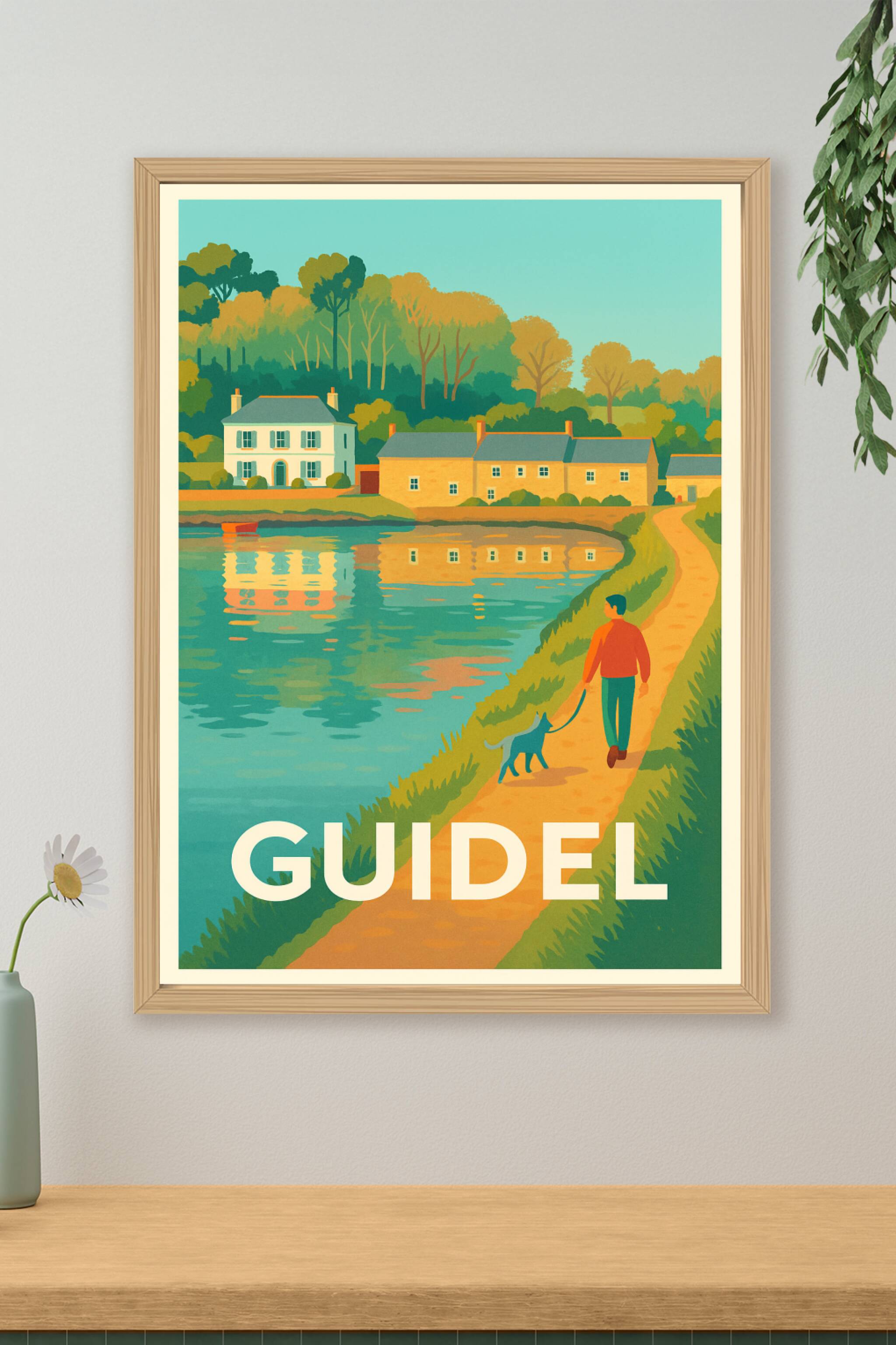 Découvrez la sérénité de Guidel avec cette affiche illustrée dans un style doux et coloré, représentant une promenade au bord de l'eau entre maison...