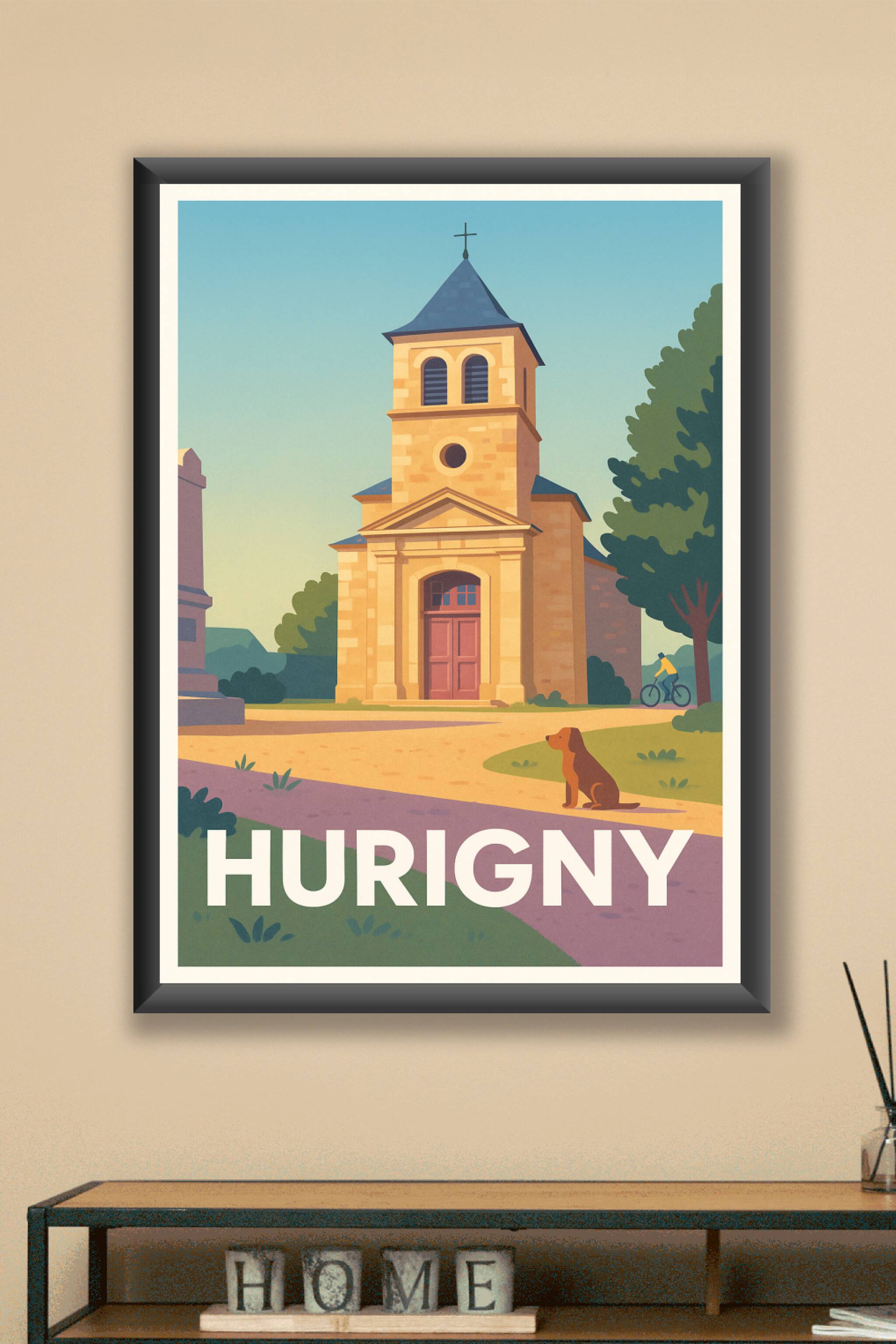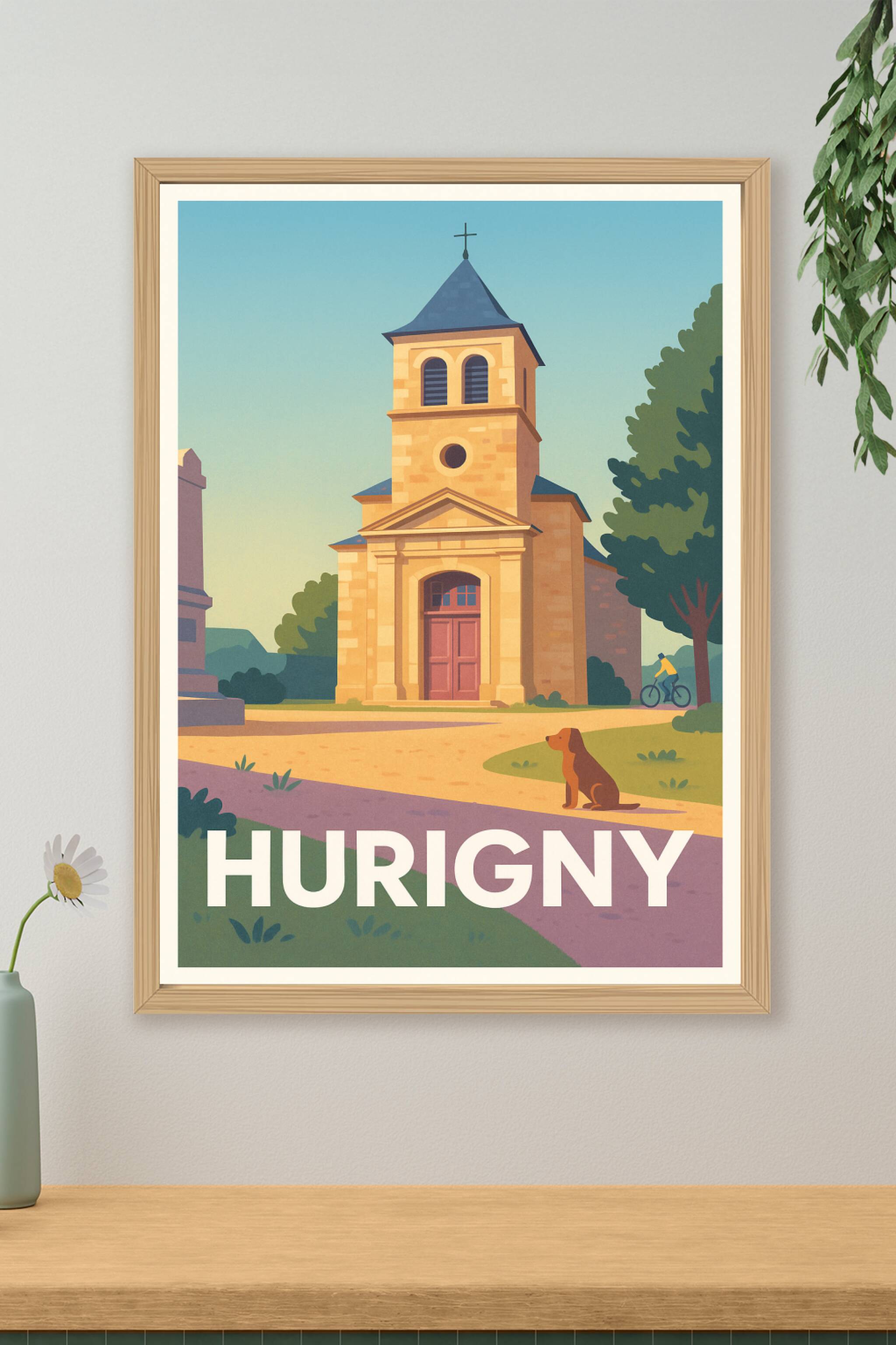 Découvrez la sérénité et le charme authentique d'Hurigny avec cette affiche illustrée représentant l'église emblématique du village baignée dans un...